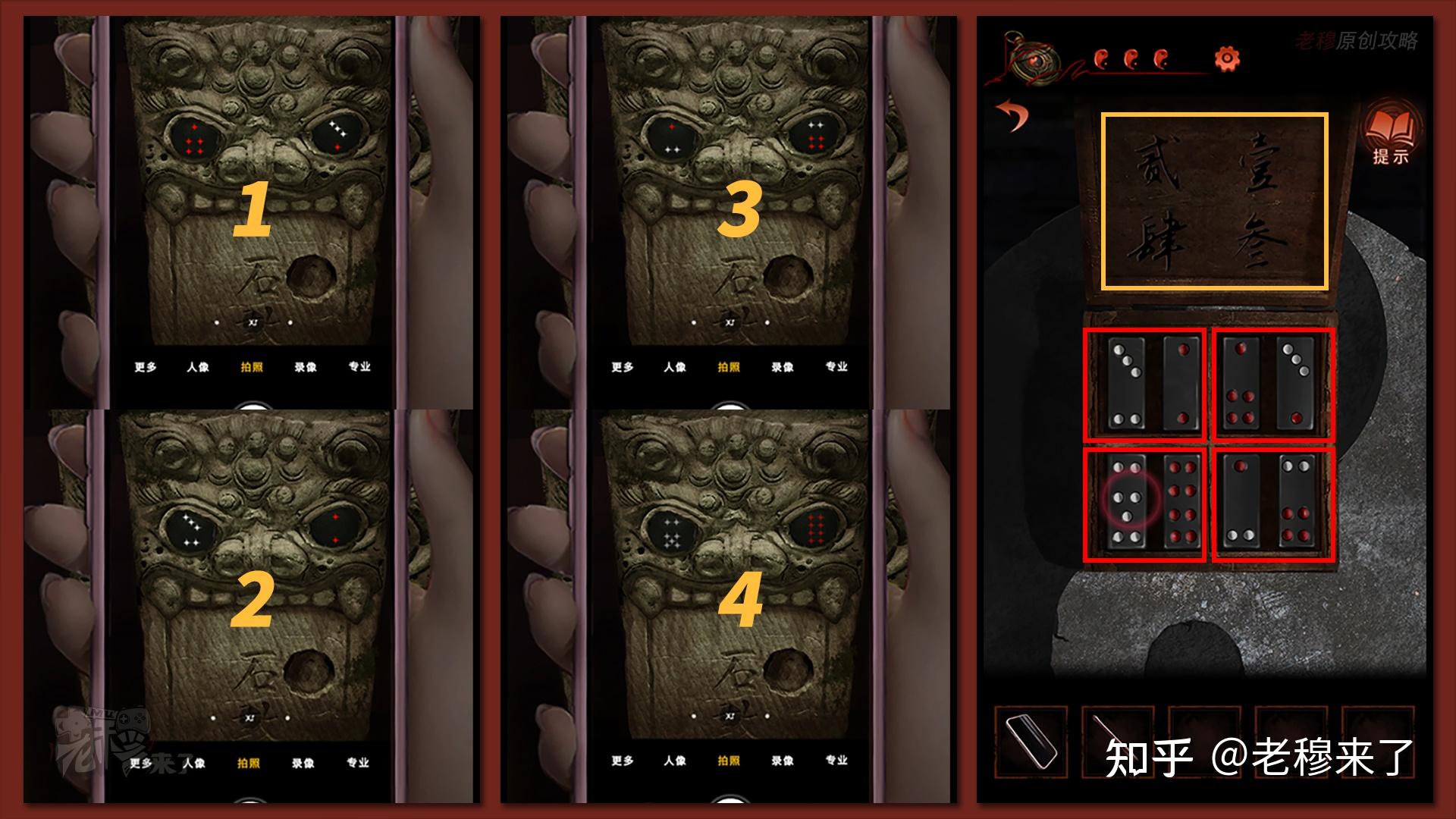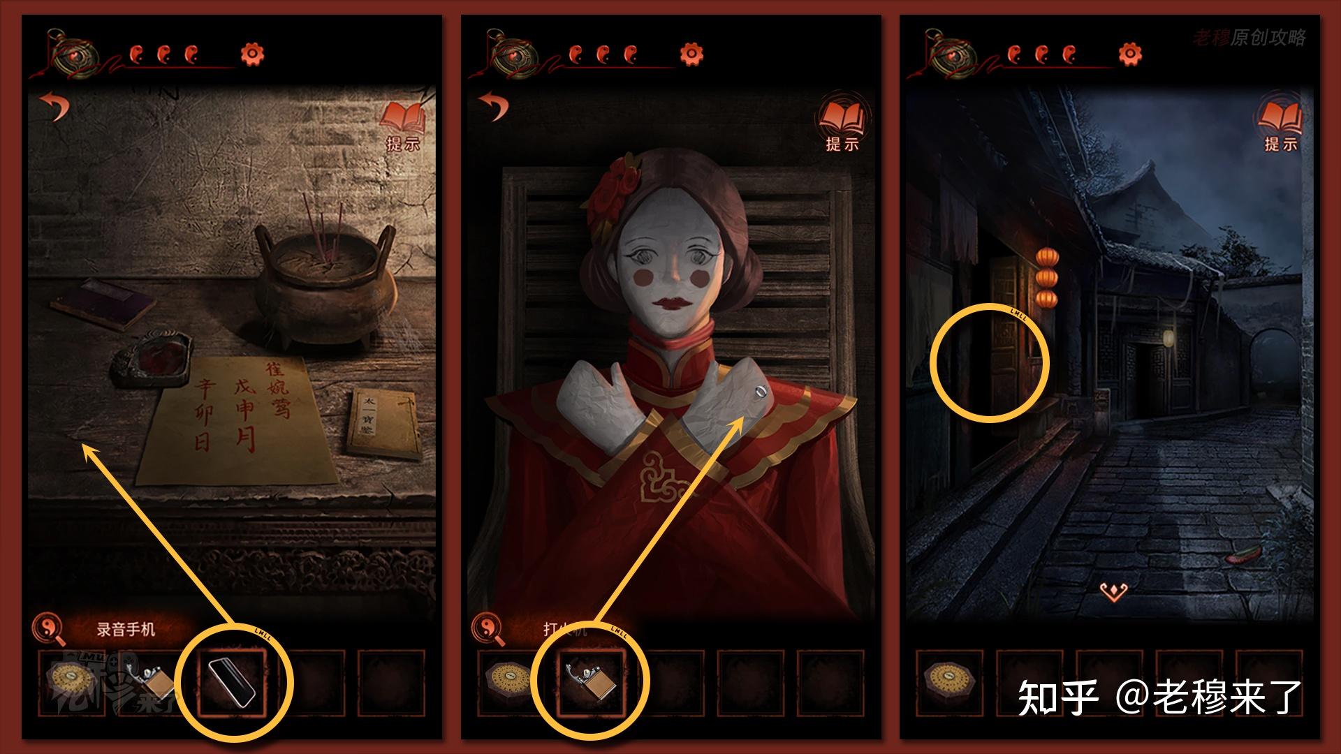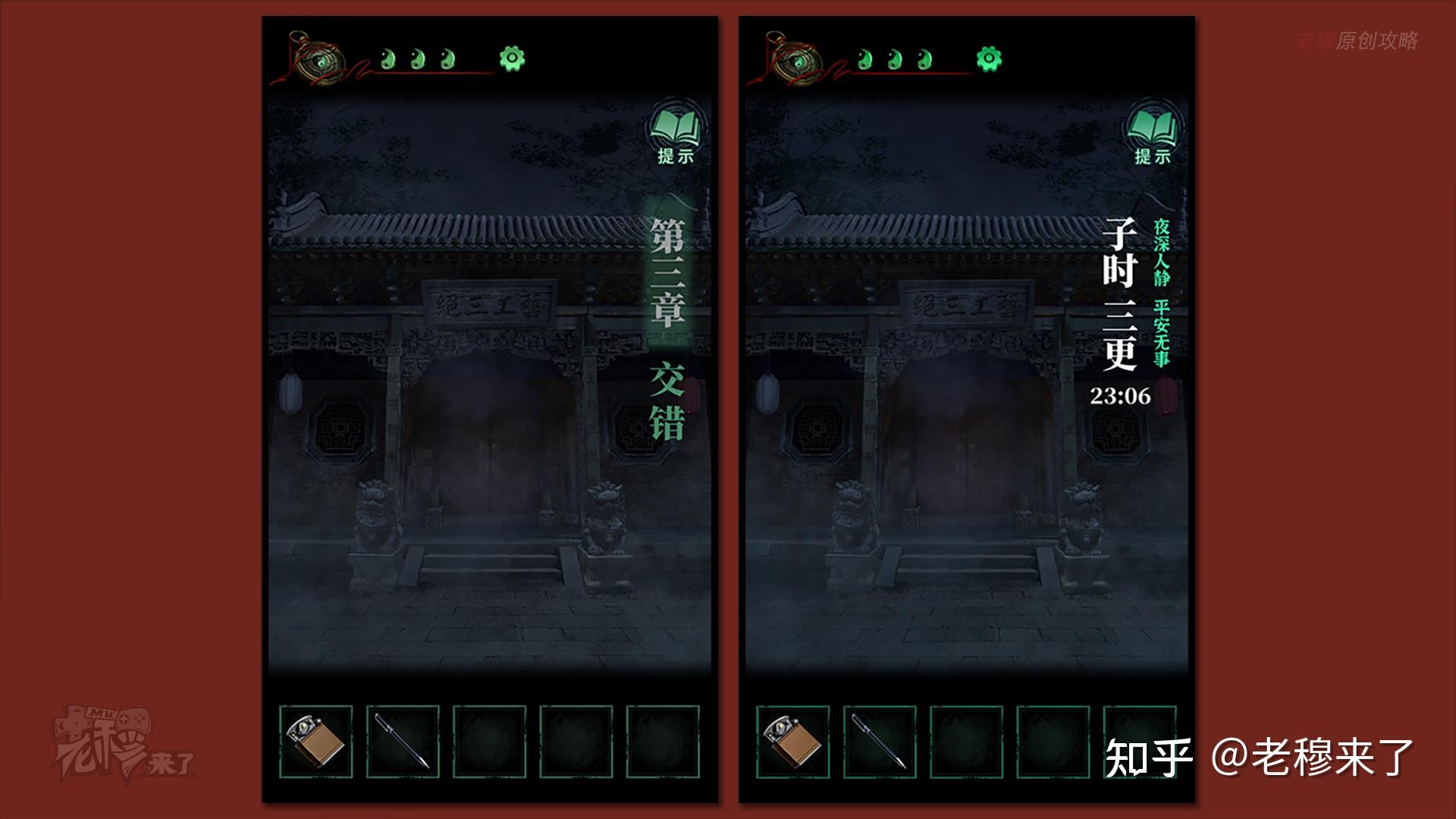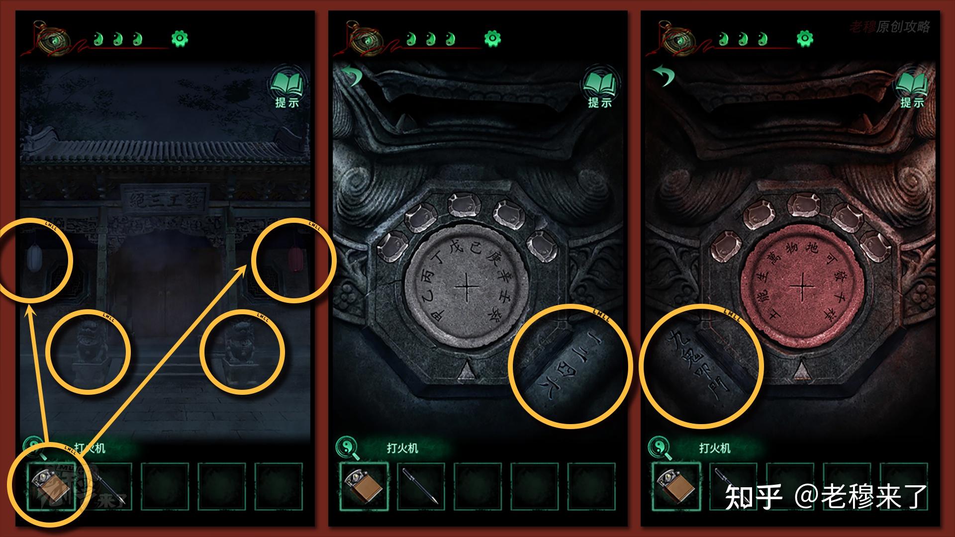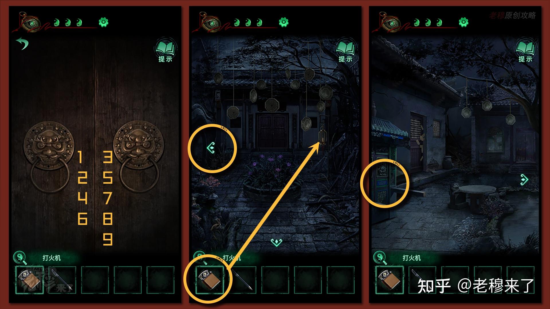 按照剧情男主来到郑宅大门前,用【打火机】点燃门外两侧的【红白灯笼】,再察看摆布两尊石狮子,右边石狮子刻有【一二四六】,右边石狮子刻有【九鬼叩门】,再察看【门环】,按照提醒右边别离是第【一二四六】次叩击门环,而总共叩九次,所有右侧门在第【三五七八九】次叩击右侧门环,所有叩击门环的挨次应该是【左摆布摆布摆布右右】