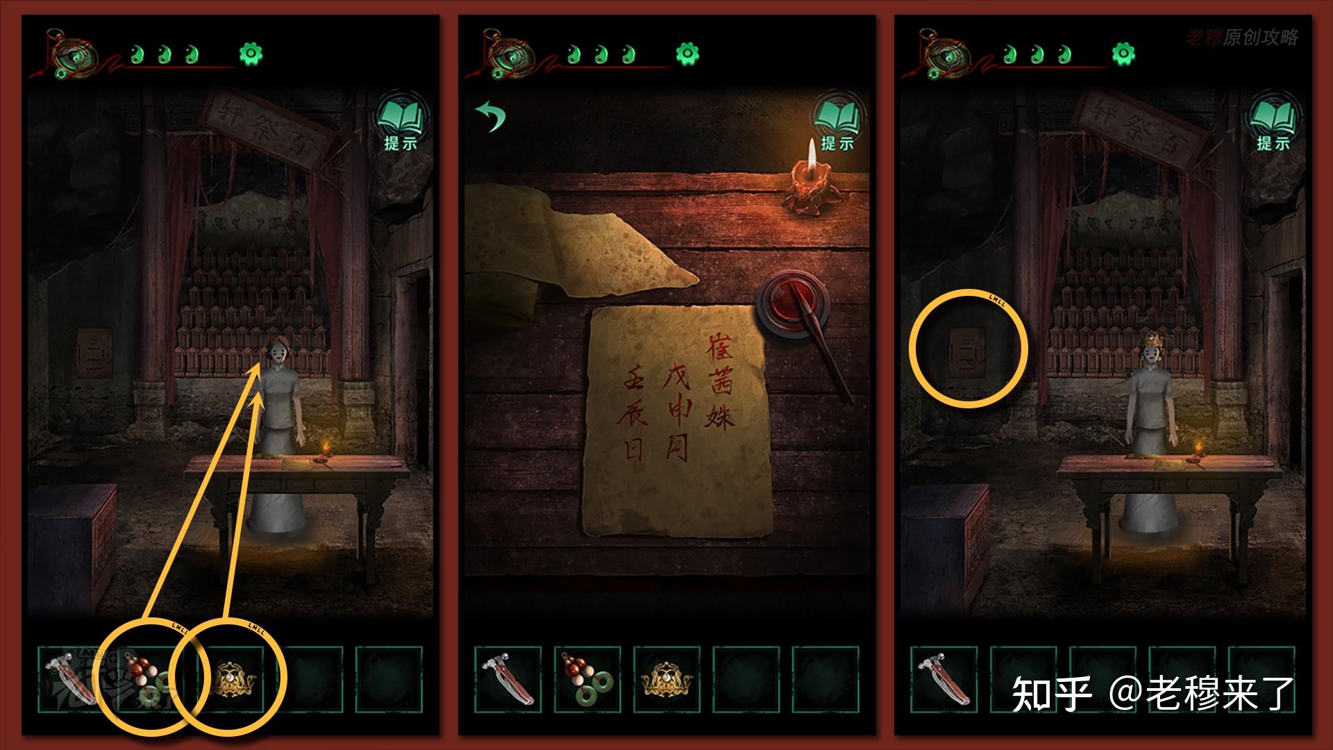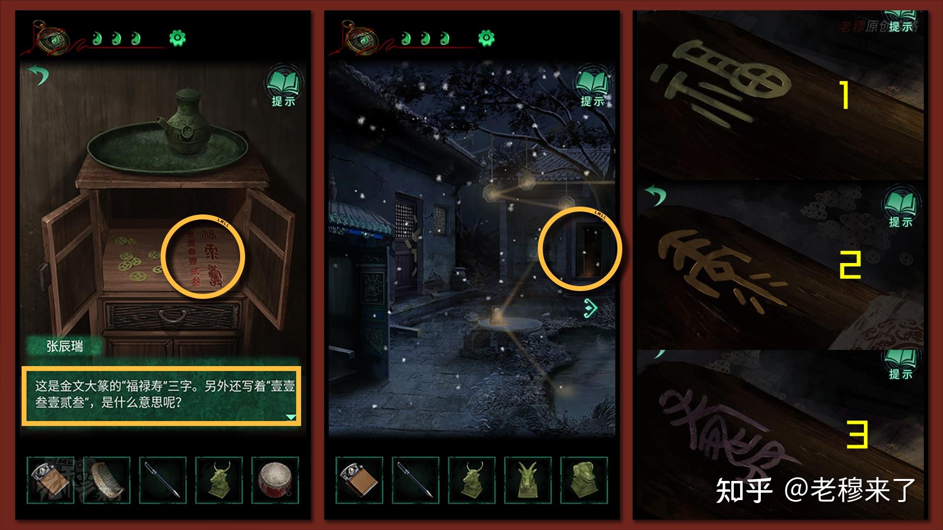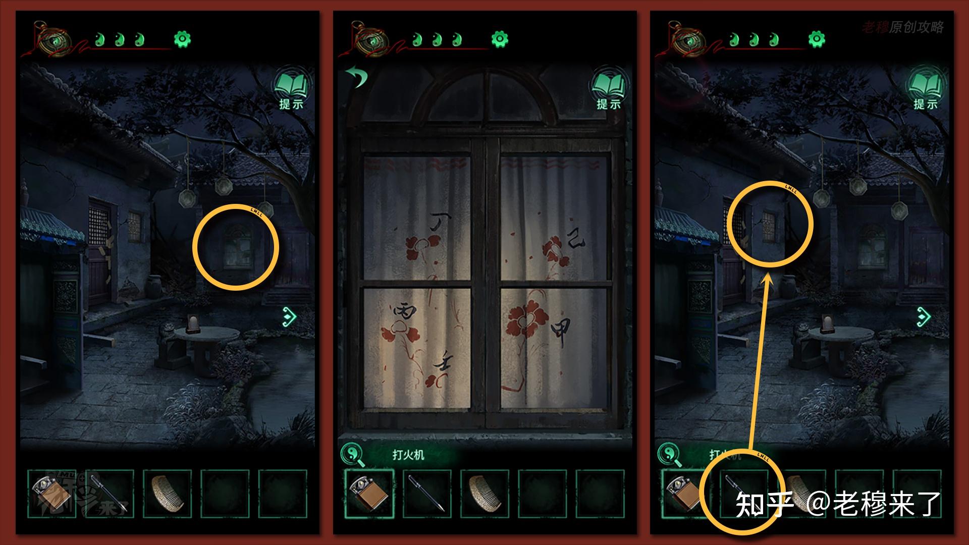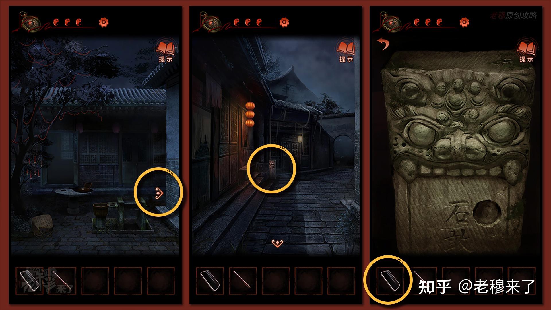 按照剧情男主来到郑宅大门前,用【打火机】点燃门外两侧的【红白灯笼】,再察看摆布两尊石狮子,右边石狮子刻有【一二四六】,右边石狮子刻有【九鬼叩门】,再察看【门环】,按照提醒右边别离是第【一二四六】次叩击门环,而总共叩九次,所有右侧门在第【三五七八九】次叩击右侧门环,所有叩击门环的挨次应该是【左摆布摆布摆布右右】