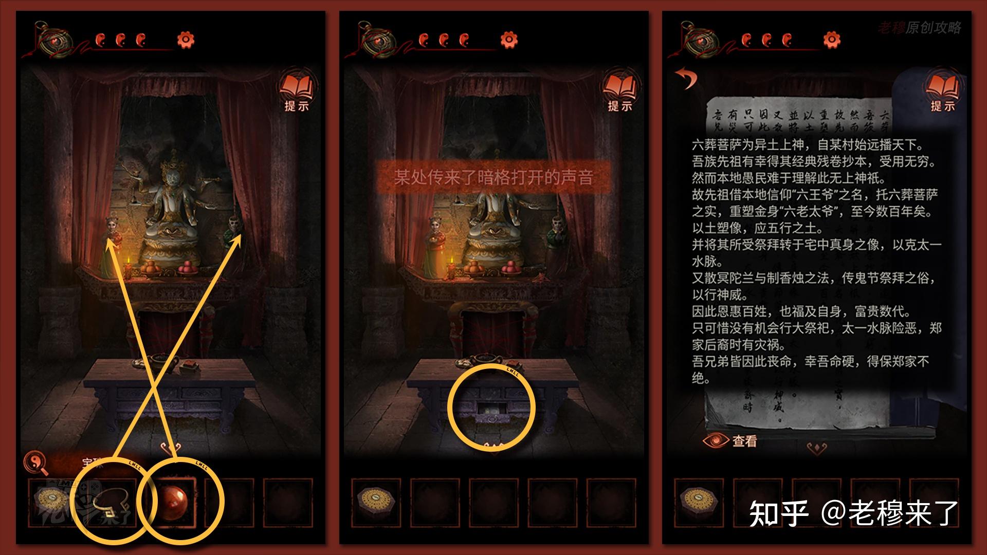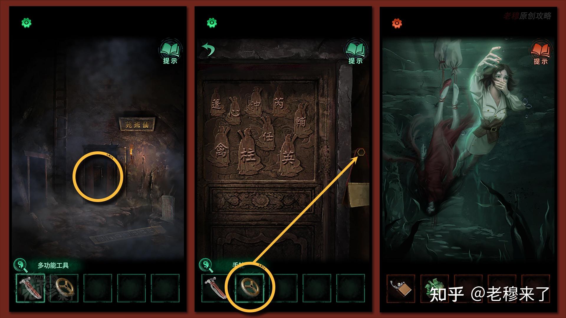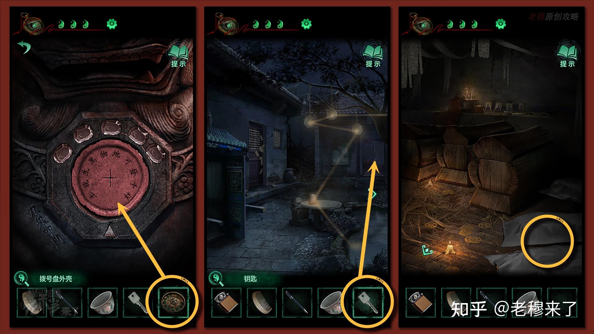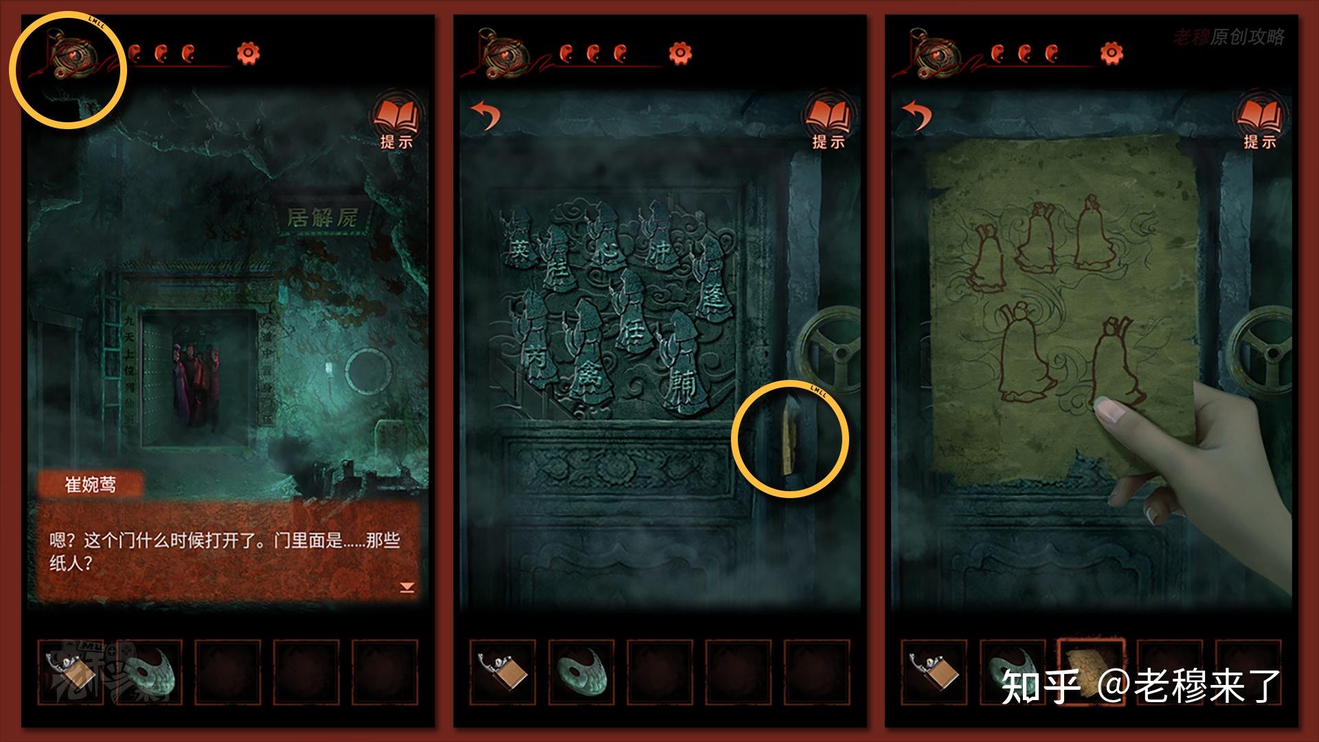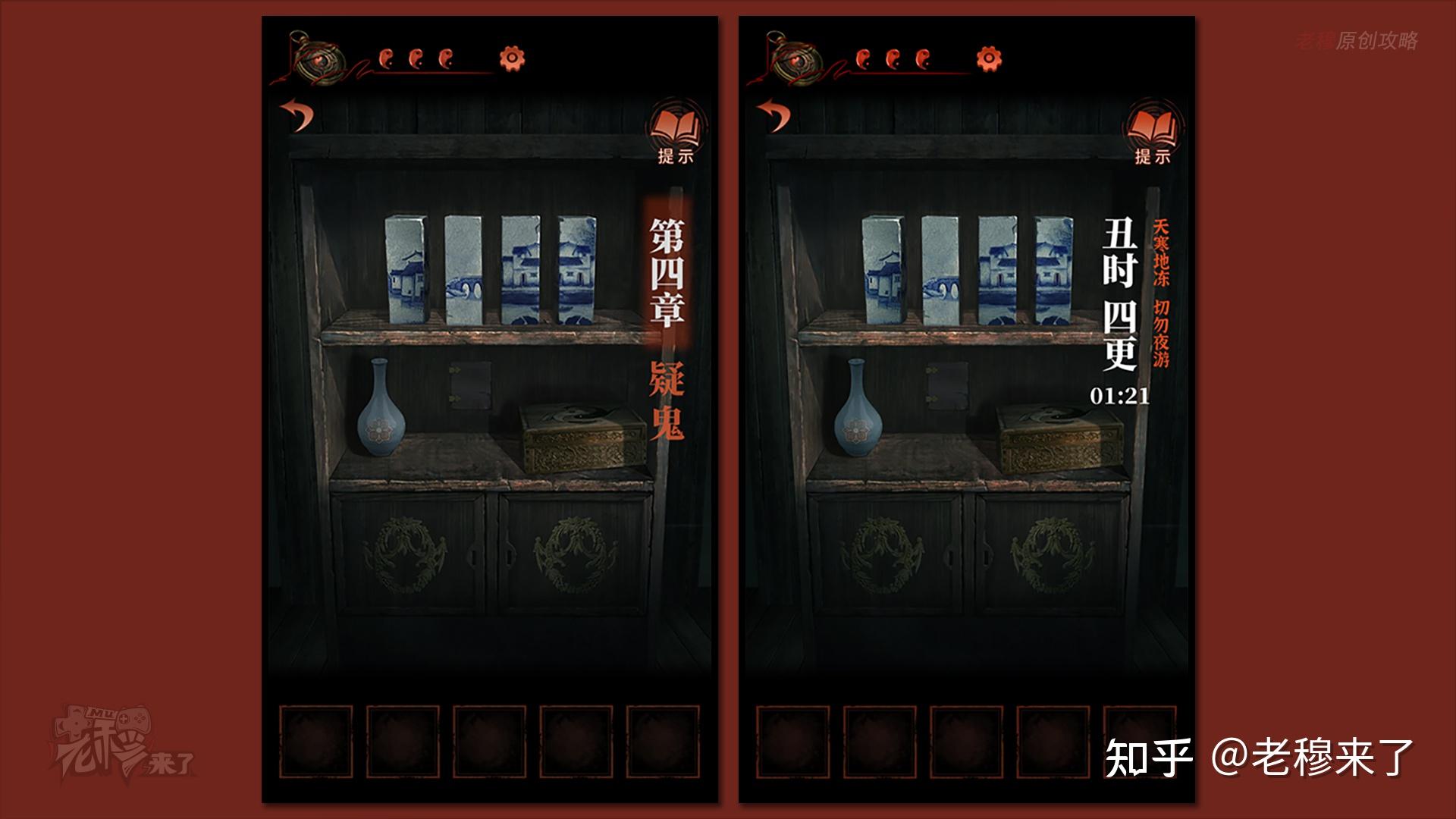 按照剧情男主来到郑宅大门前,用【打火机】点燃门外两侧的【红白灯笼】,再察看摆布两尊石狮子,右边石狮子刻有【一二四六】,右边石狮子刻有【九鬼叩门】,再察看【门环】,按照提醒右边别离是第【一二四六】次叩击门环,而总共叩九次,所有右侧门在第【三五七八九】次叩击右侧门环,所有叩击门环的挨次应该是【左摆布摆布摆布右右】