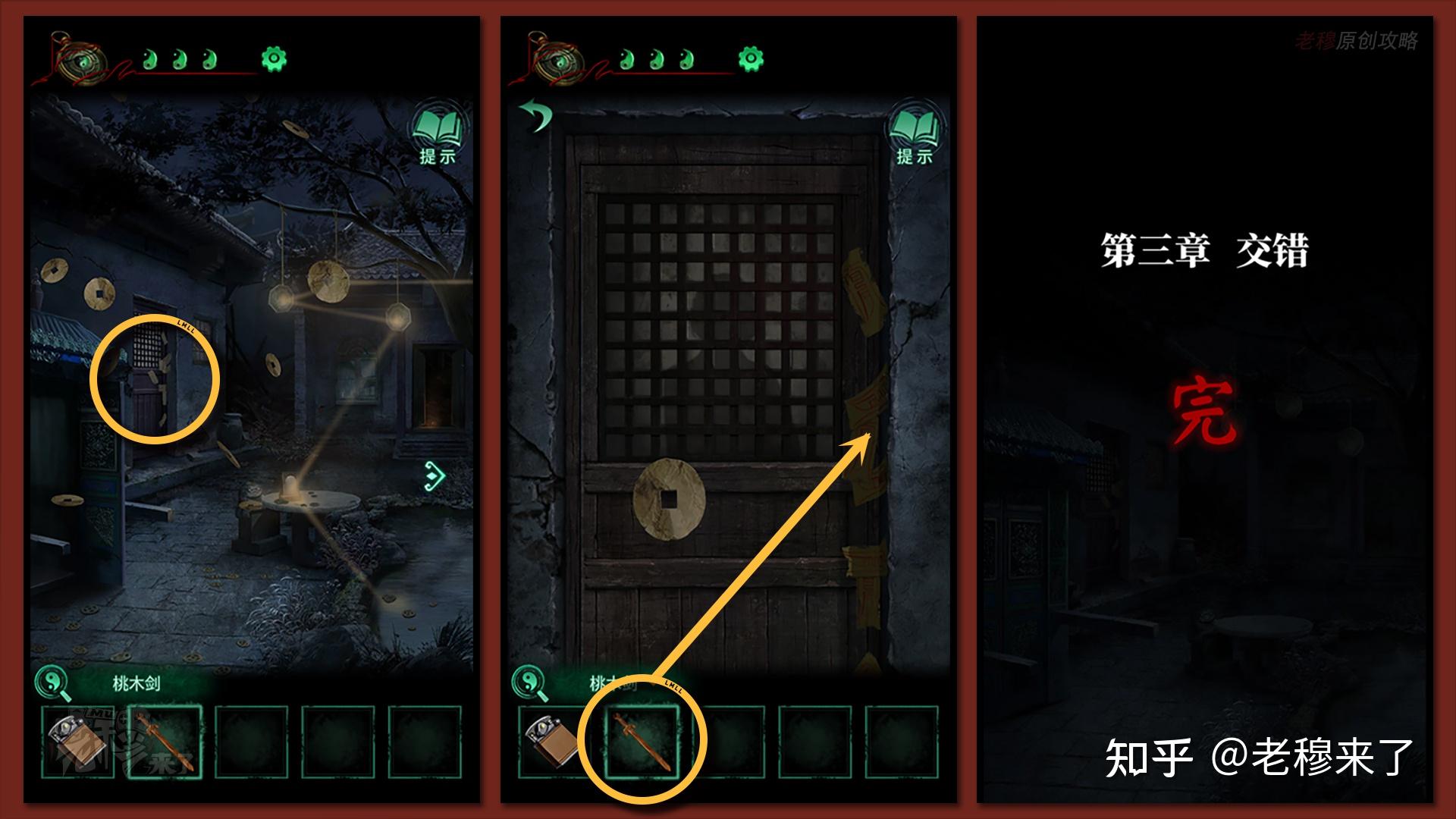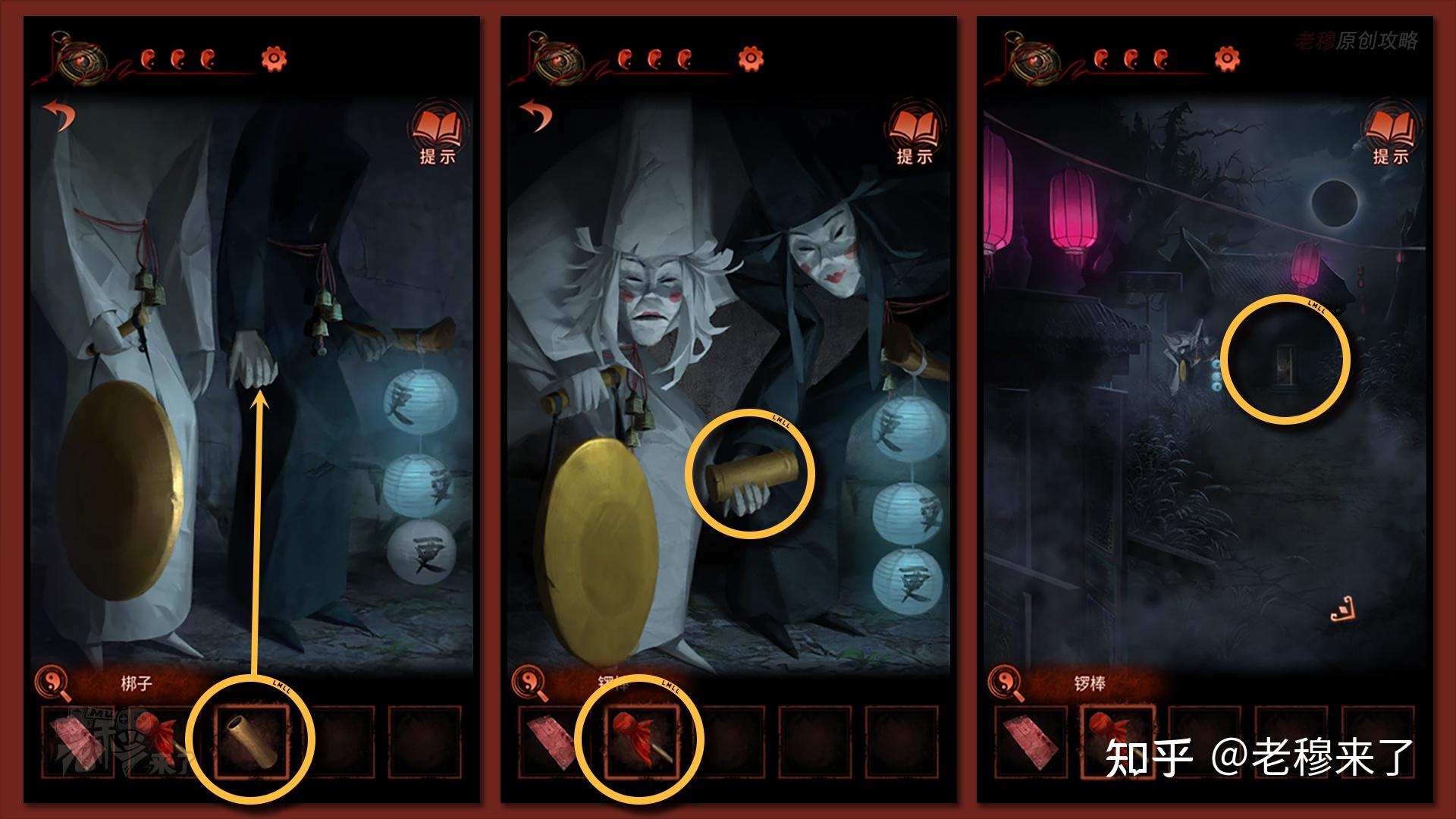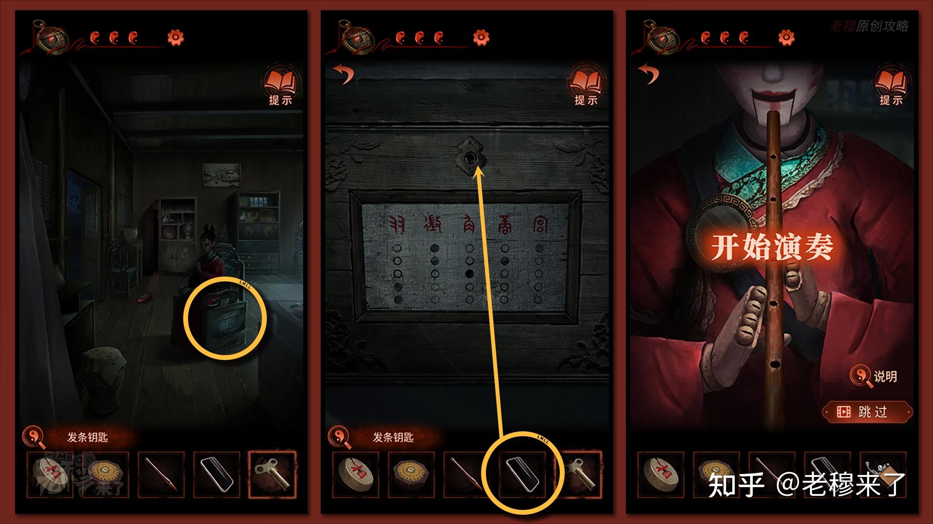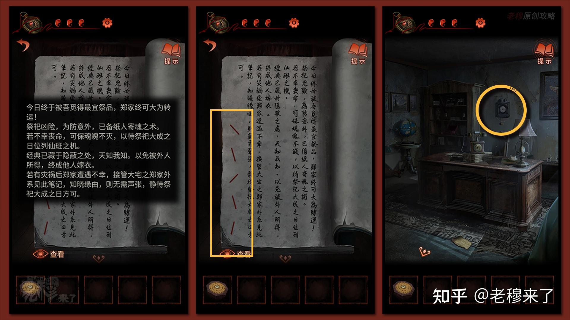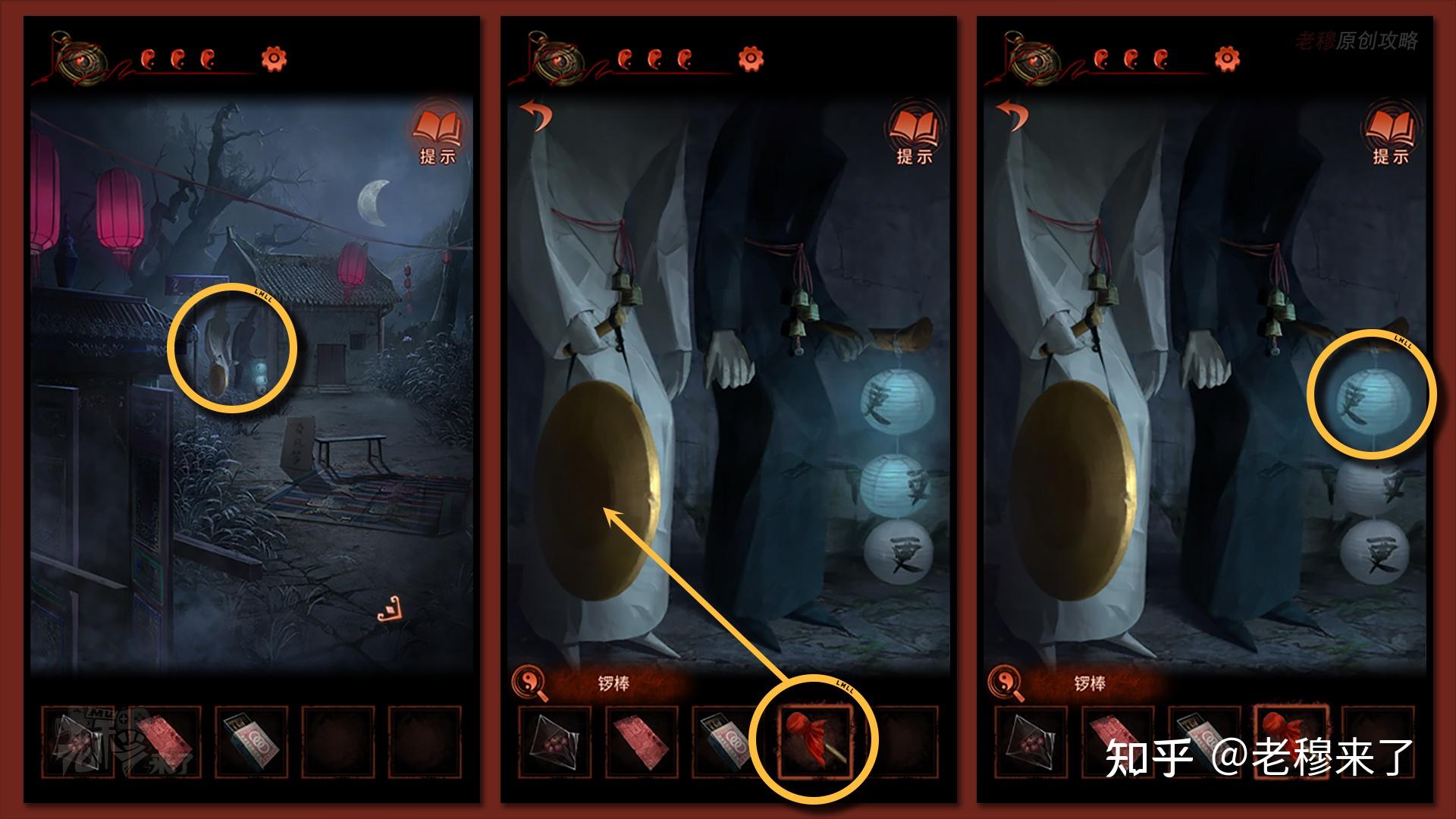按照剧情男主来到郑宅大门前,用【打火机】点燃门外两侧的【红白灯笼】,再察看摆布两尊石狮子,右边石狮子刻有【一二四六】,右边石狮子刻有【九鬼叩门】,再察看【门环】,按照提醒右边别离是第【一二四六】次叩击门环,而总共叩九次,所有右侧门在第【三五七八九】次叩击右侧门环,所有叩击门环的挨次应该是【左摆布摆布摆布右右】