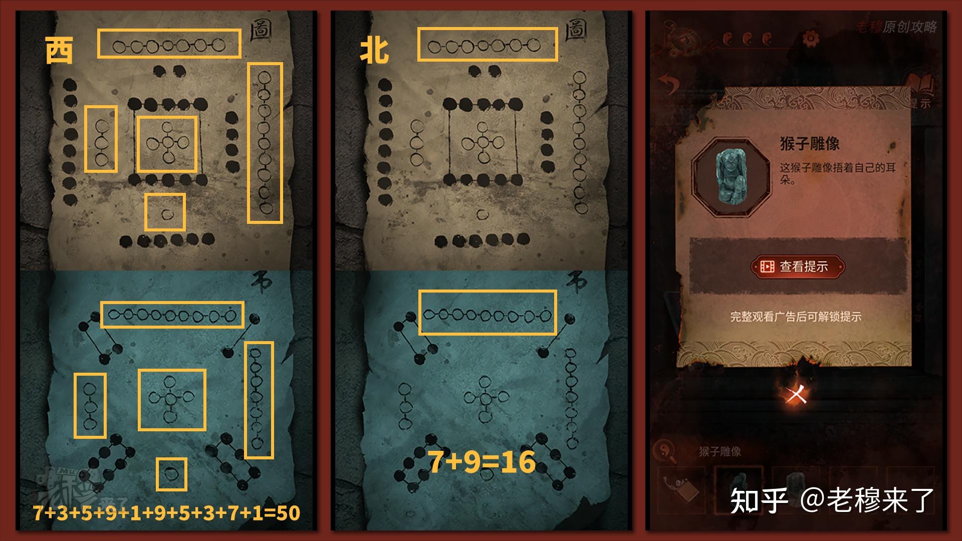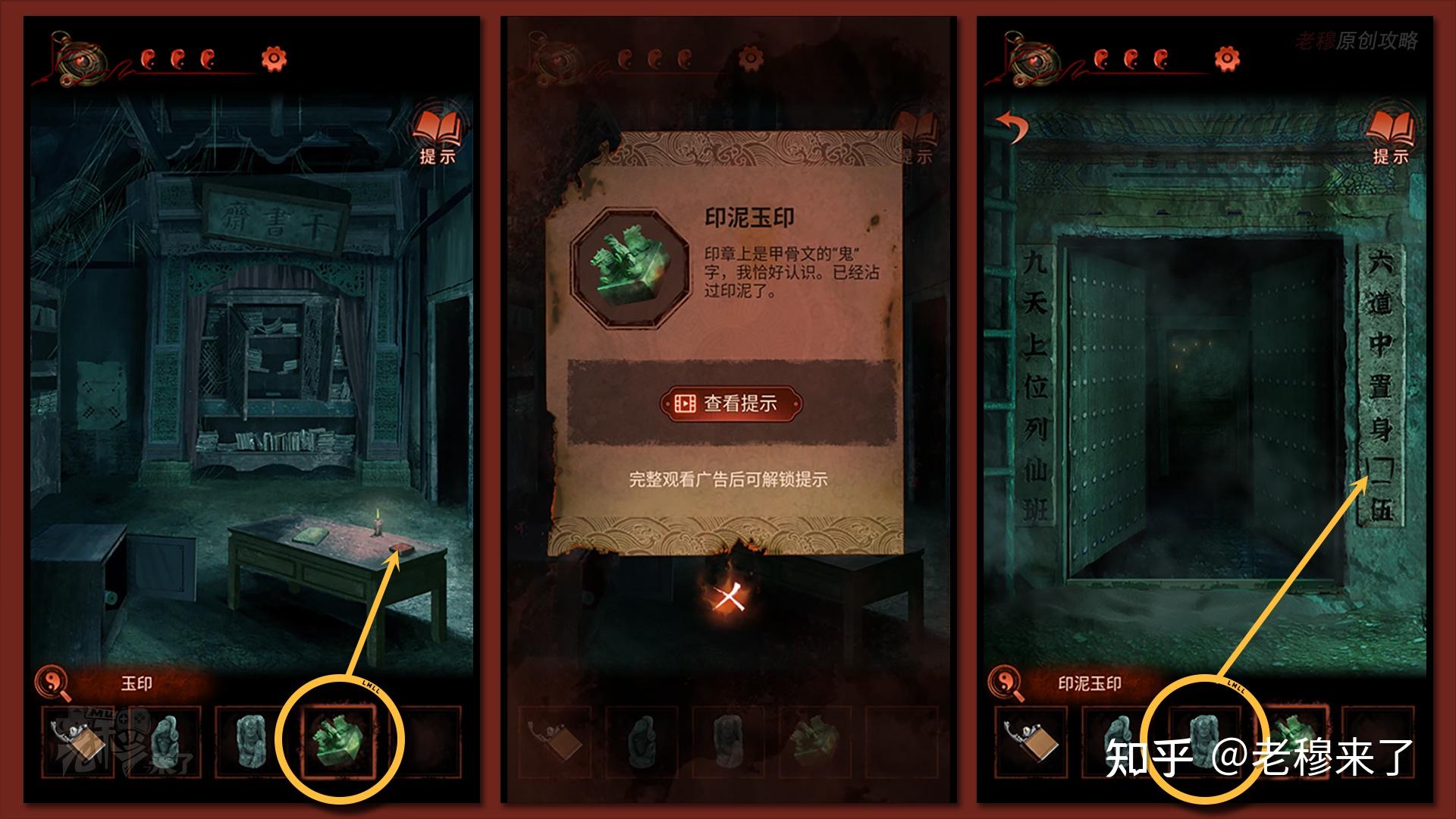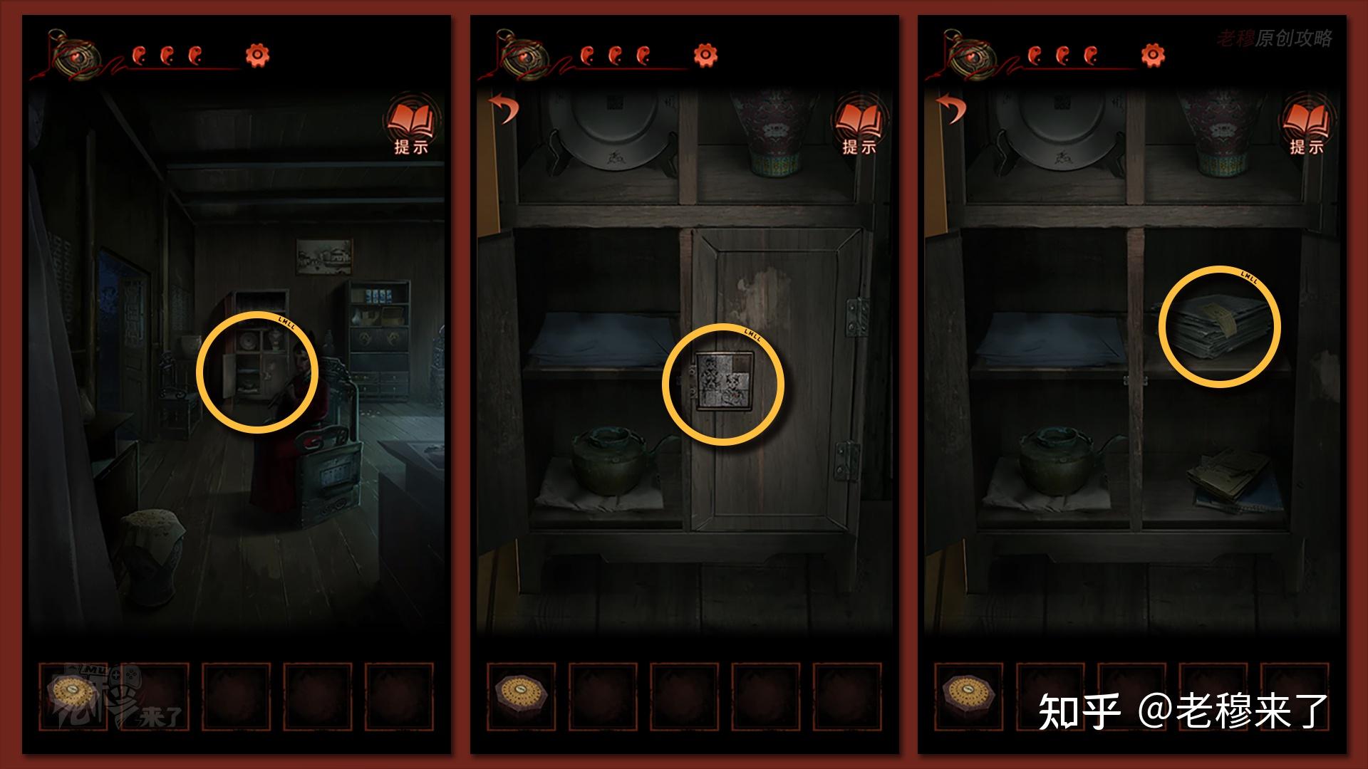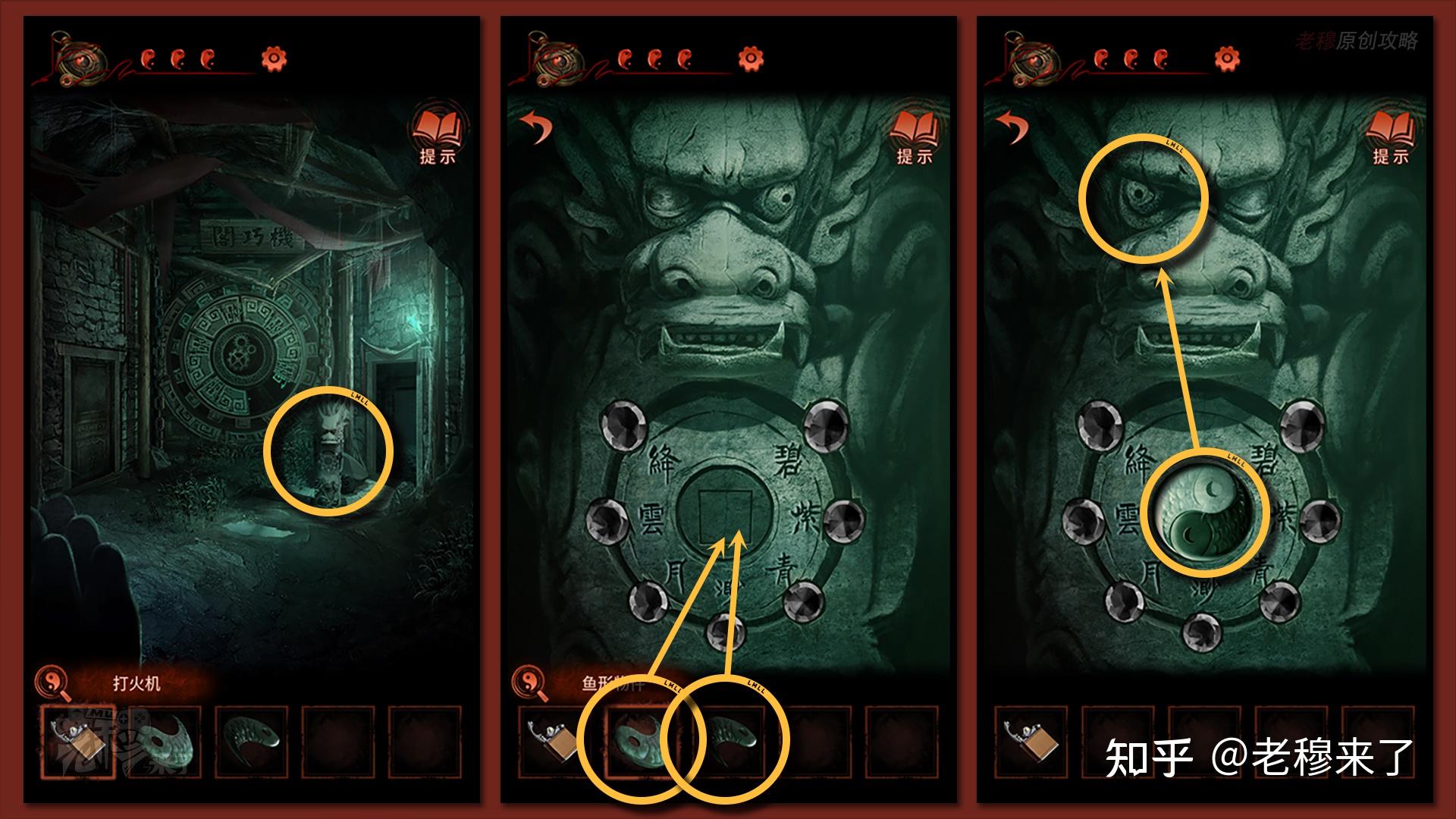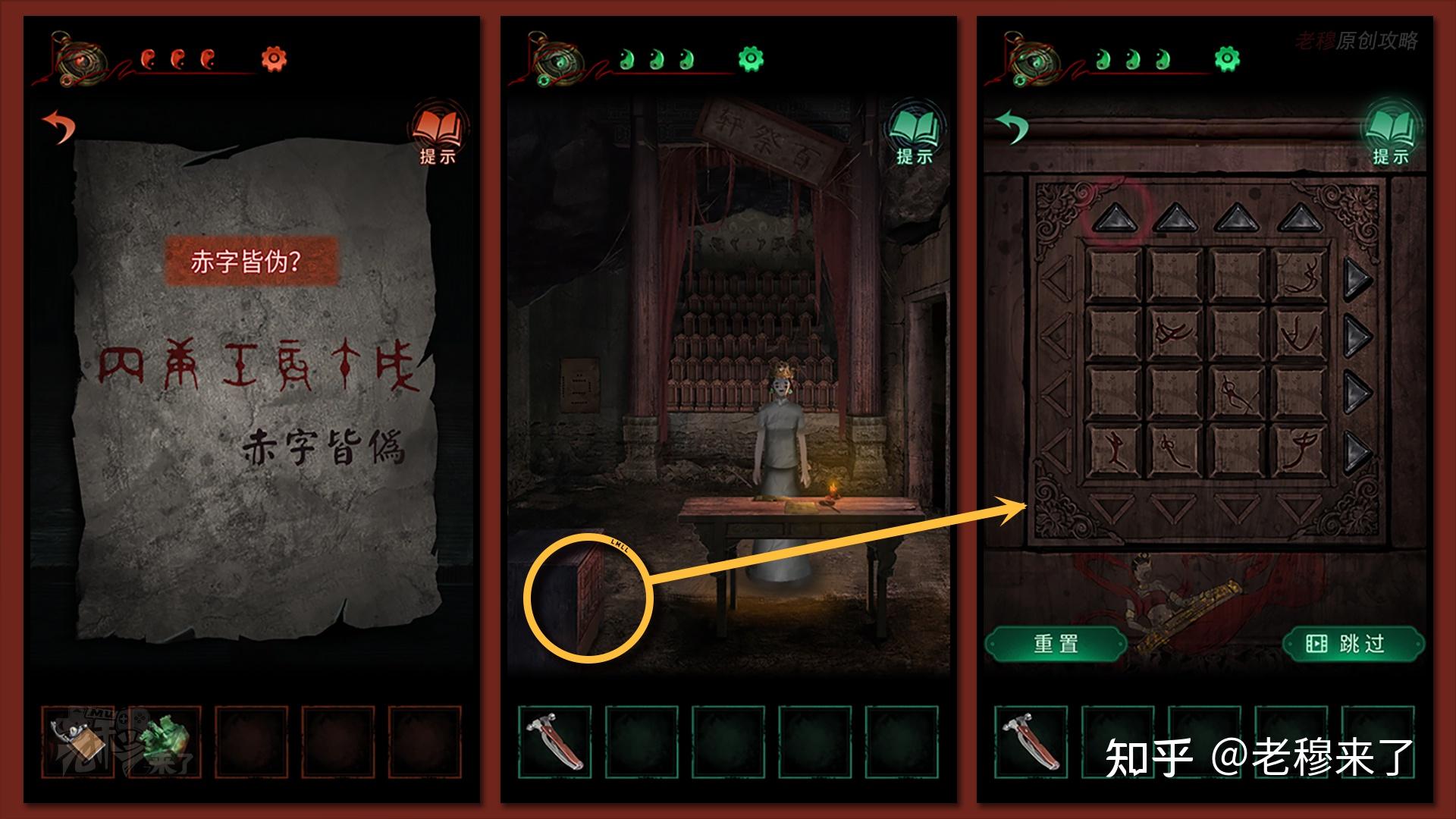 按照剧情男主来到郑宅大门前,用【打火机】点燃门外两侧的【红白灯笼】,再察看摆布两尊石狮子,右边石狮子刻有【一二四六】,右边石狮子刻有【九鬼叩门】,再察看【门环】,按照提醒右边别离是第【一二四六】次叩击门环,而总共叩九次,所有右侧门在第【三五七八九】次叩击右侧门环,所有叩击门环的挨次应该是【左摆布摆布摆布右右】
