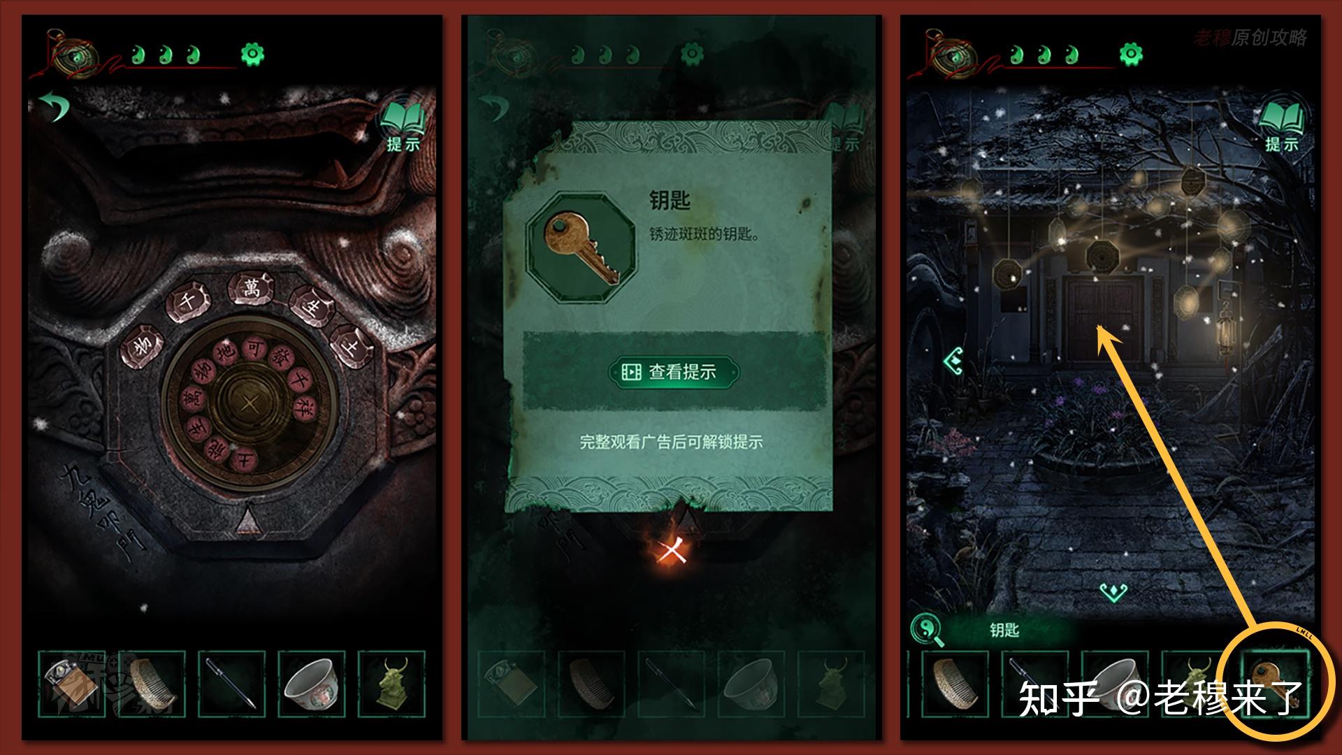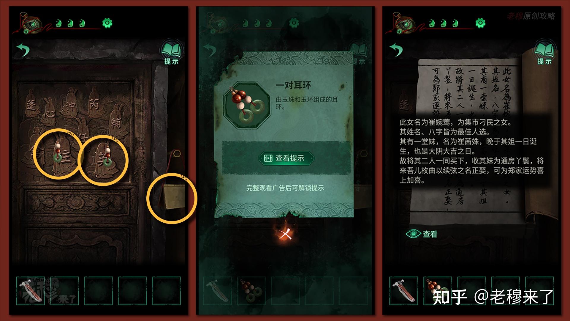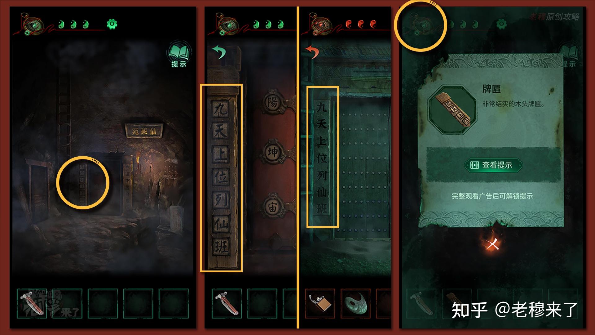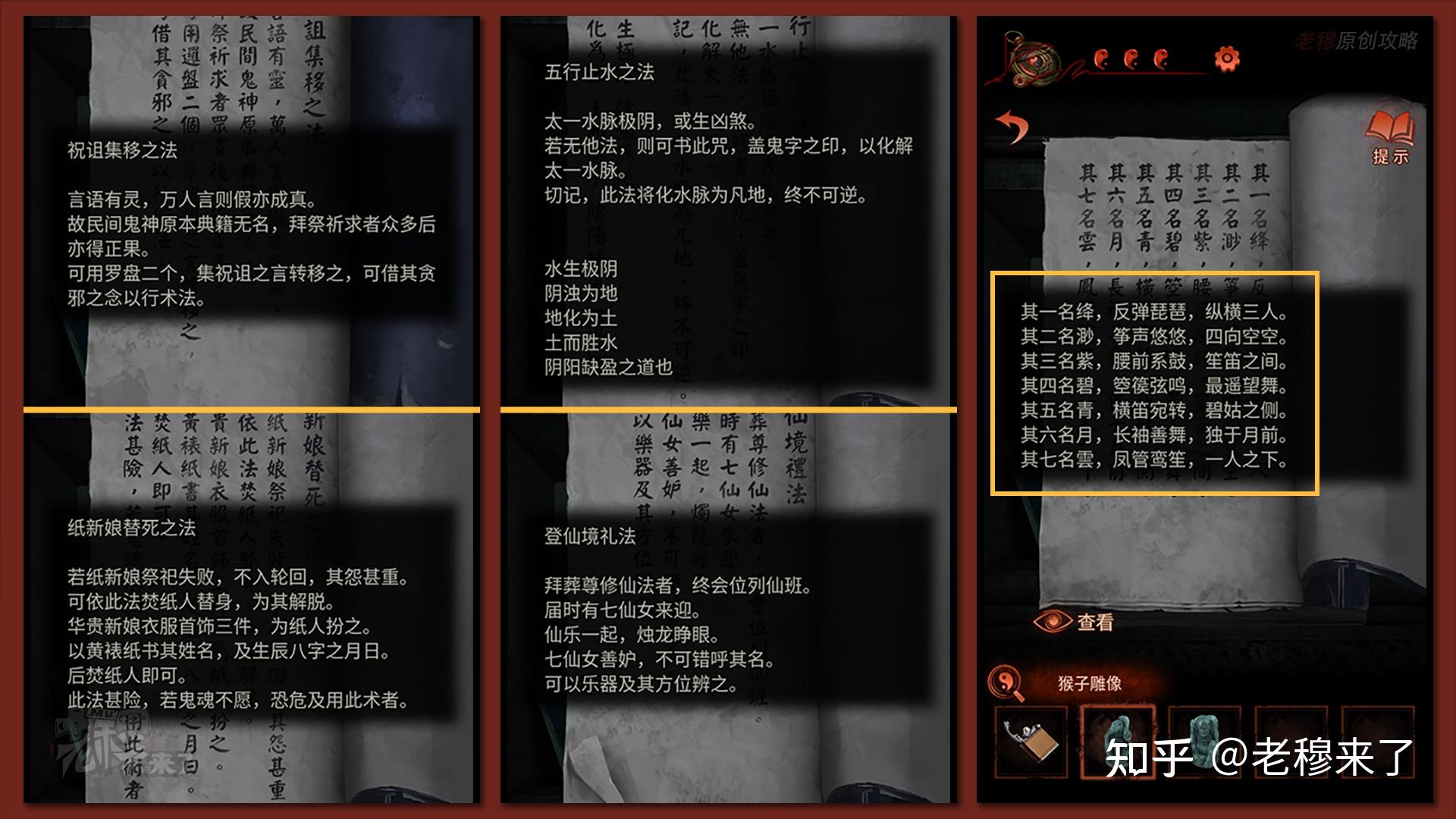 按照剧情男主来到郑宅大门前,用【打火机】点燃门外两侧的【红白灯笼】,再察看摆布两尊石狮子,右边石狮子刻有【一二四六】,右边石狮子刻有【九鬼叩门】,再察看【门环】,按照提醒右边别离是第【一二四六】次叩击门环,而总共叩九次,所有右侧门在第【三五七八九】次叩击右侧门环,所有叩击门环的挨次应该是【左摆布摆布摆布右右】