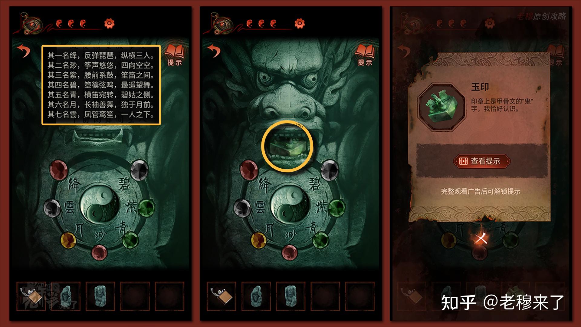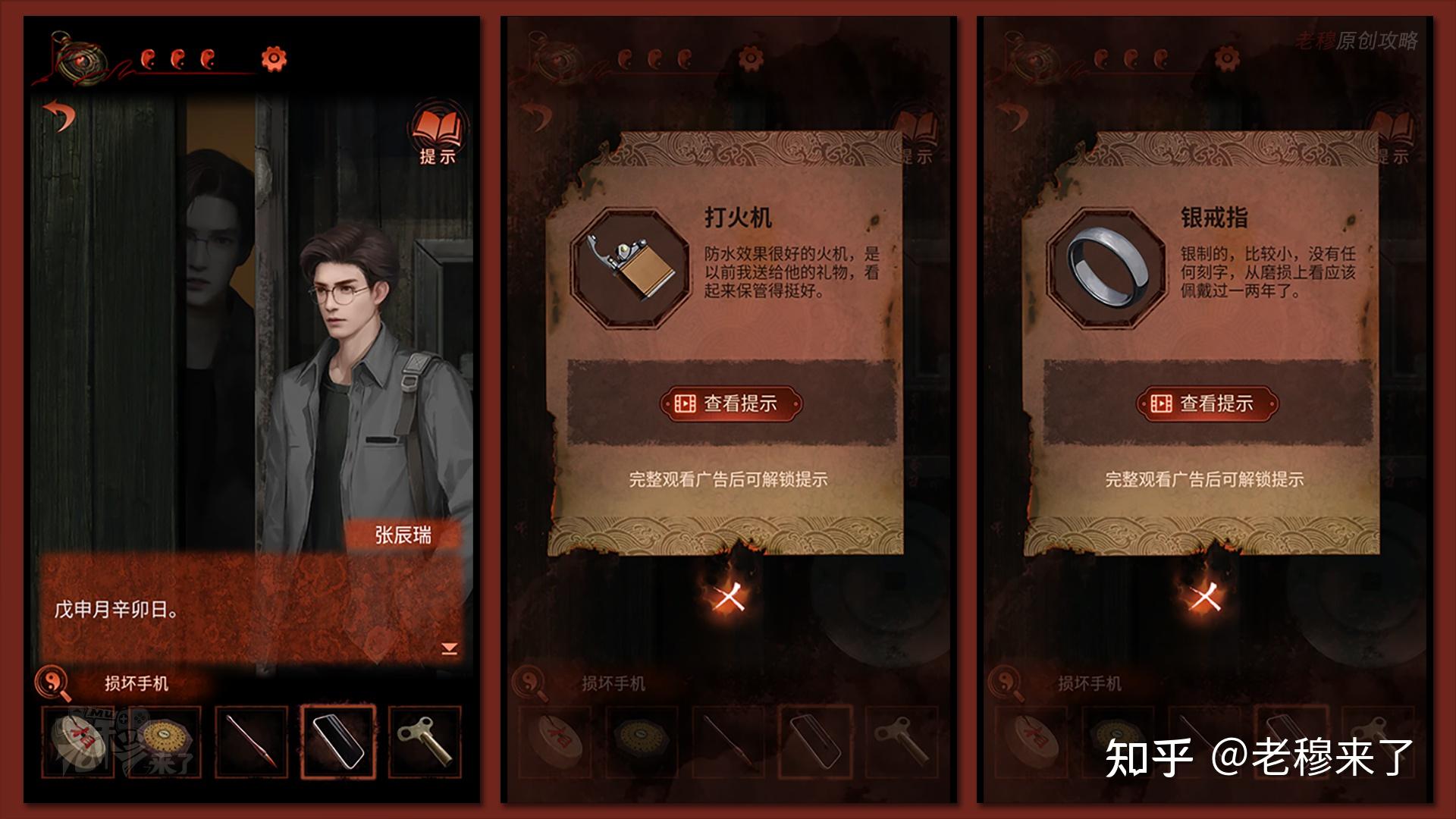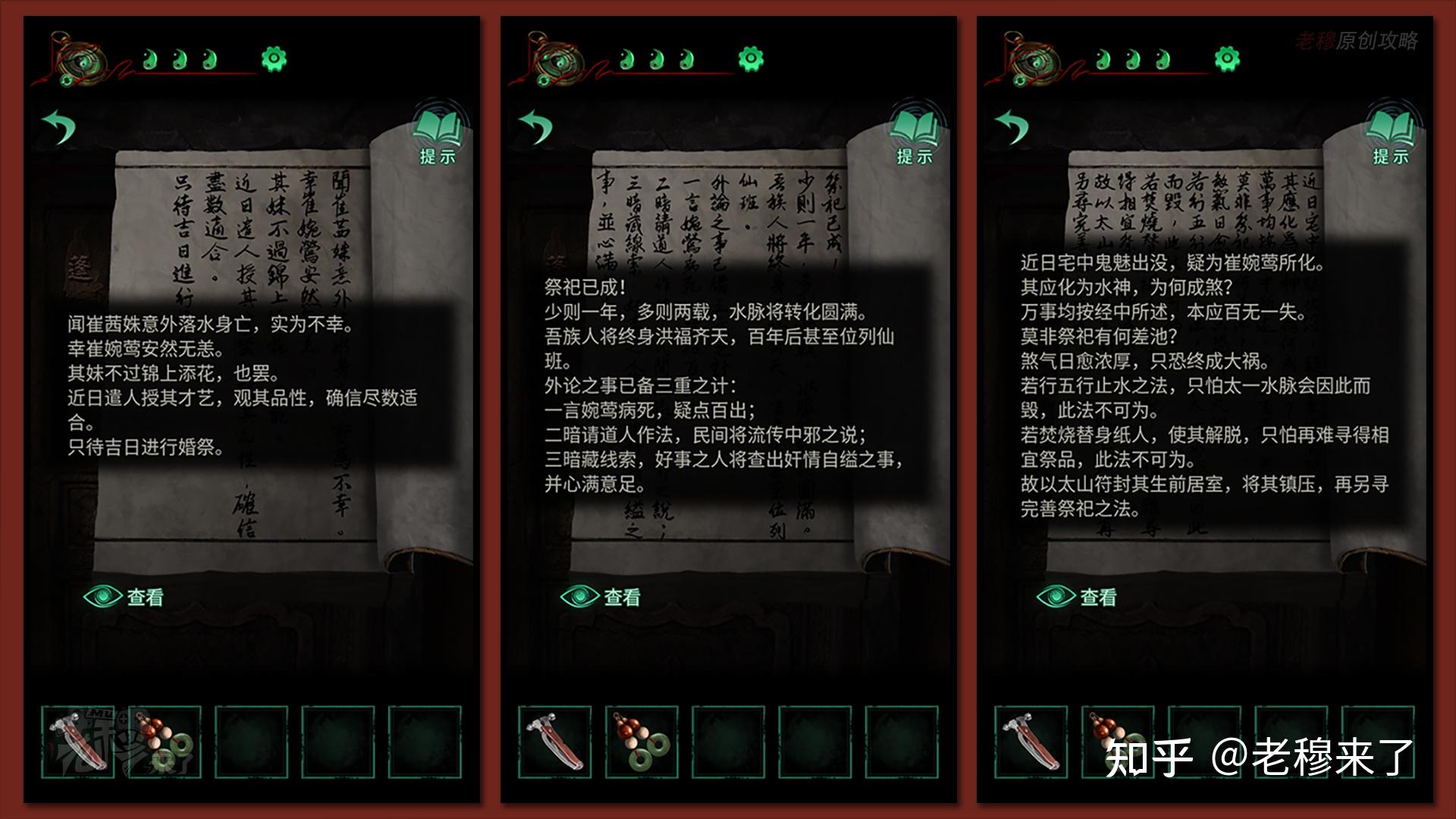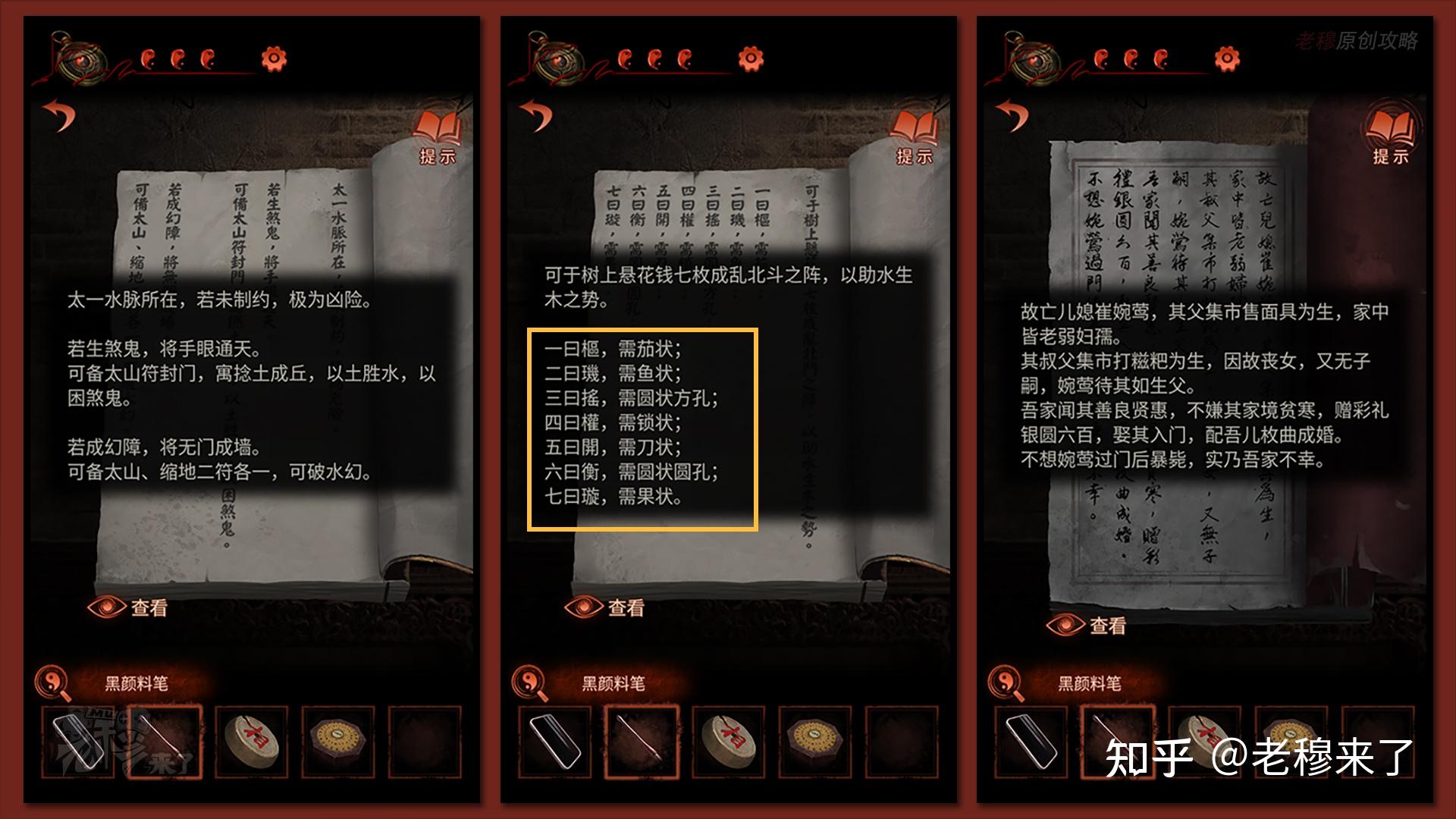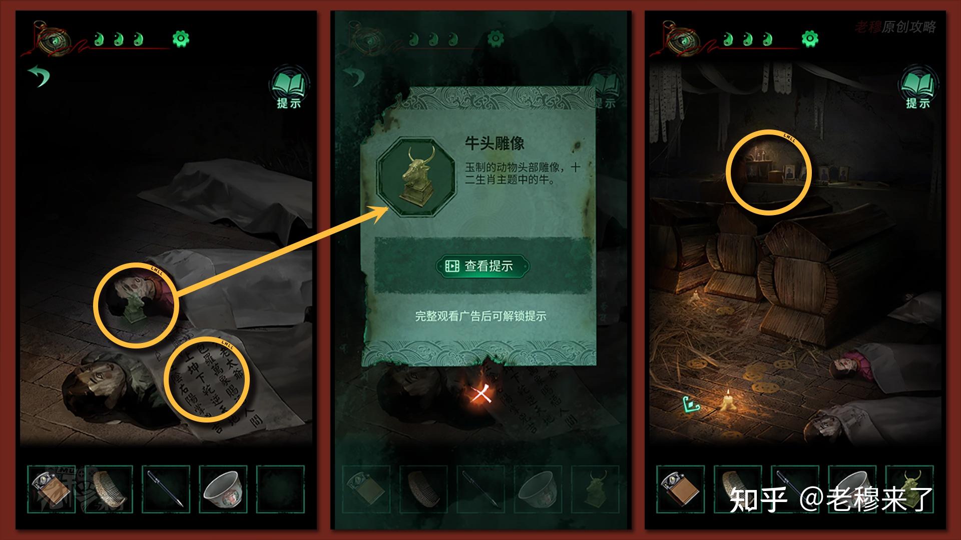 按照剧情男主来到郑宅大门前,用【打火机】点燃门外两侧的【红白灯笼】,再察看摆布两尊石狮子,右边石狮子刻有【一二四六】,右边石狮子刻有【九鬼叩门】,再察看【门环】,按照提醒右边别离是第【一二四六】次叩击门环,而总共叩九次,所有右侧门在第【三五七八九】次叩击右侧门环,所有叩击门环的挨次应该是【左摆布摆布摆布右右】