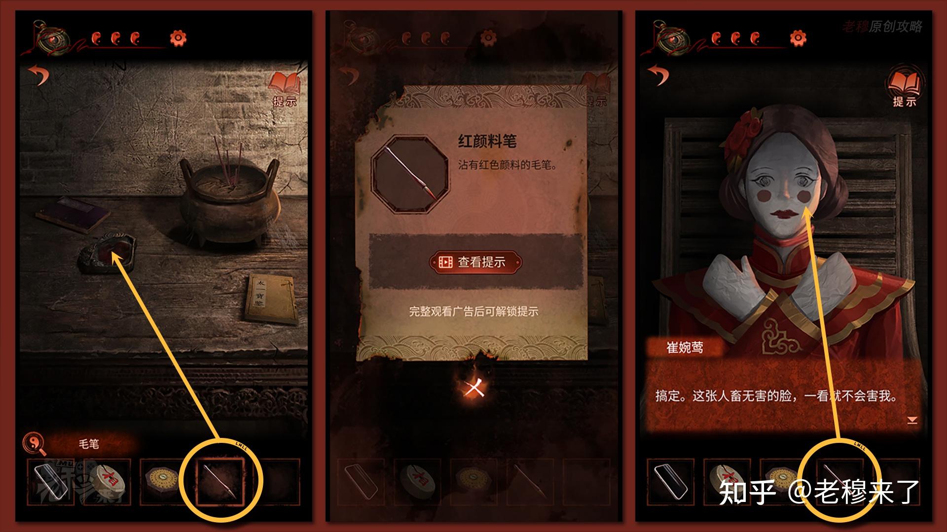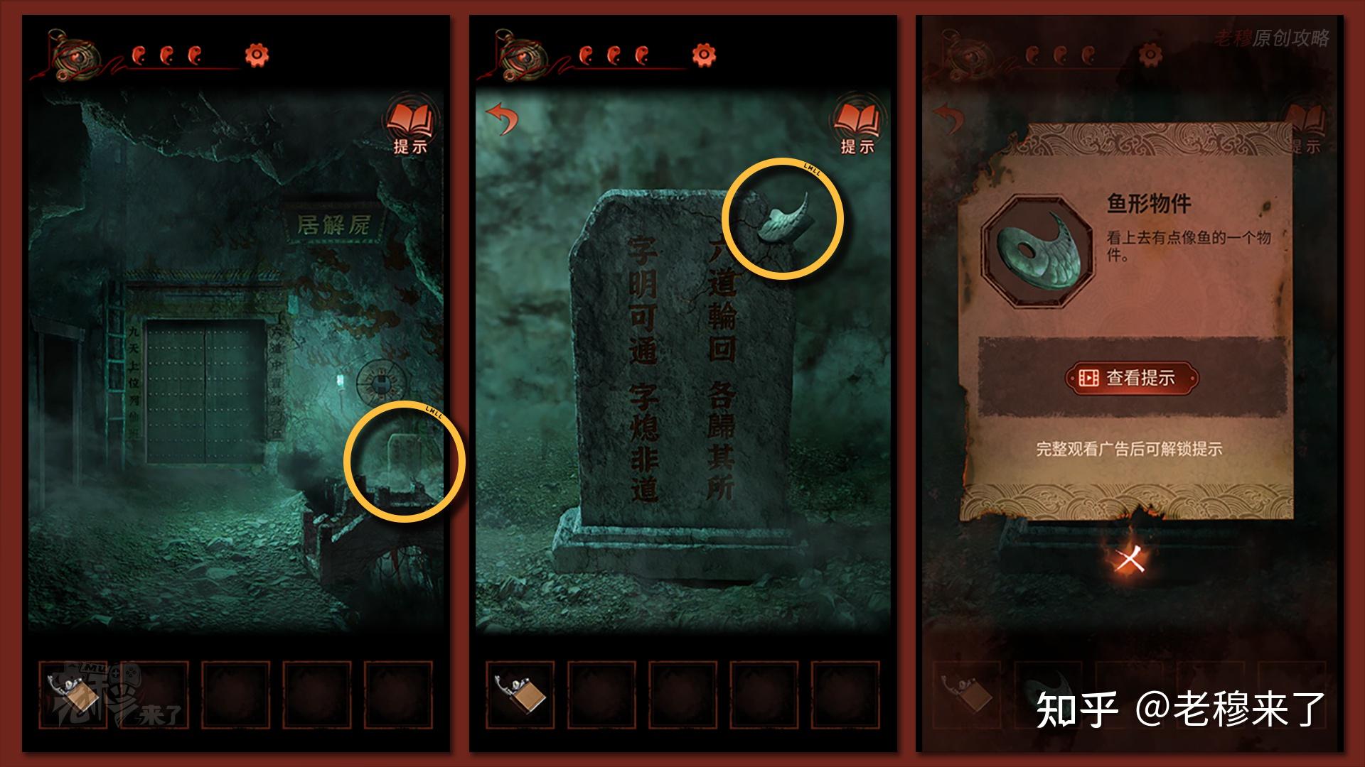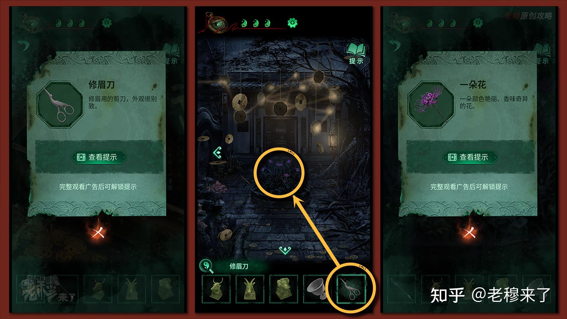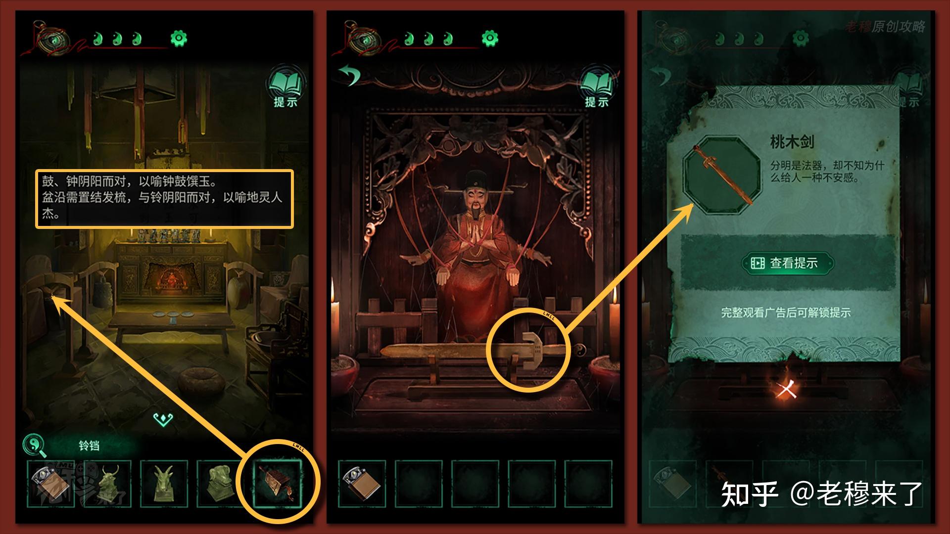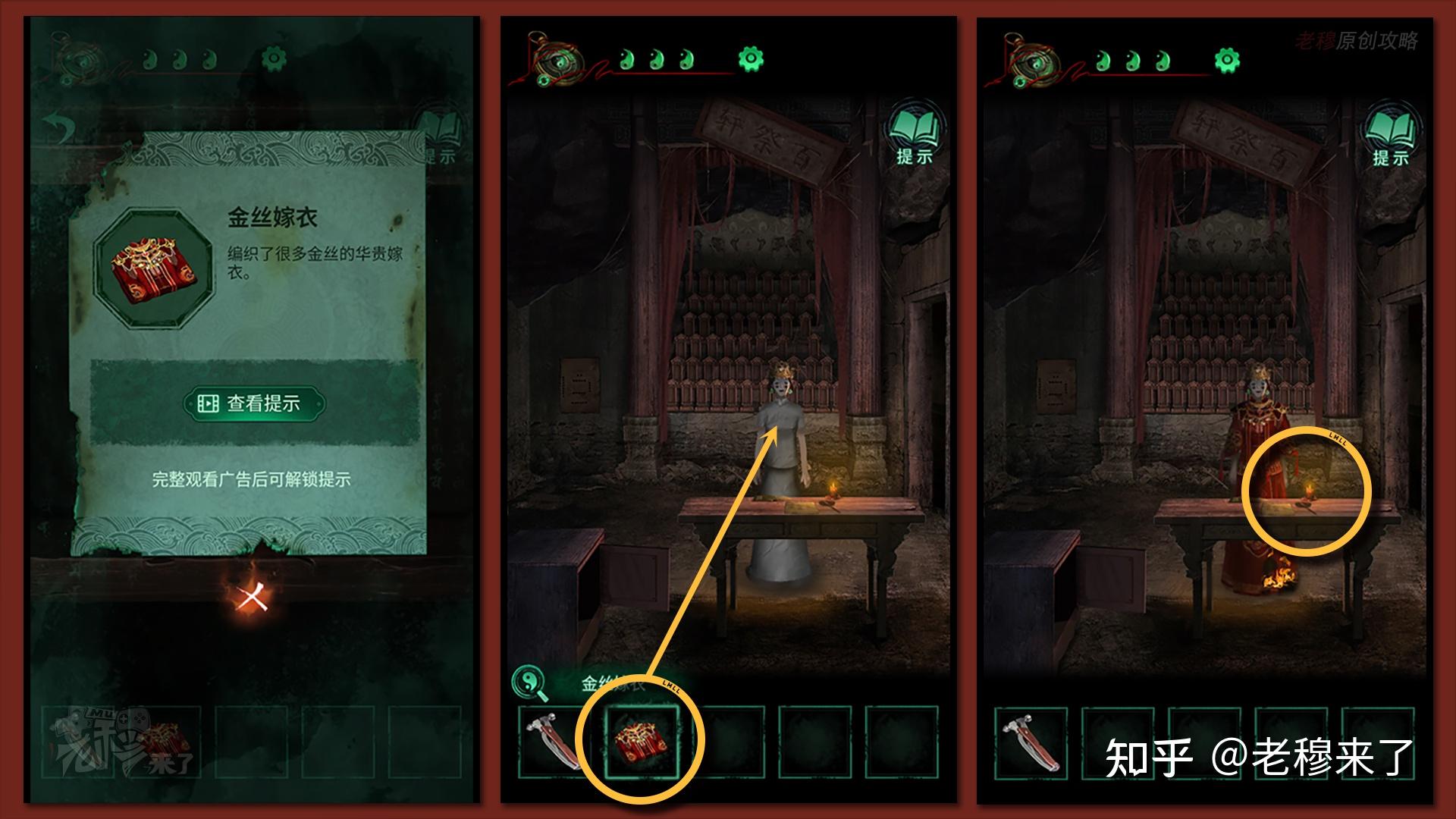 按照剧情男主来到郑宅大门前,用【打火机】点燃门外两侧的【红白灯笼】,再察看摆布两尊石狮子,右边石狮子刻有【一二四六】,右边石狮子刻有【九鬼叩门】,再察看【门环】,按照提醒右边别离是第【一二四六】次叩击门环,而总共叩九次,所有右侧门在第【三五七八九】次叩击右侧门环,所有叩击门环的挨次应该是【左摆布摆布摆布右右】