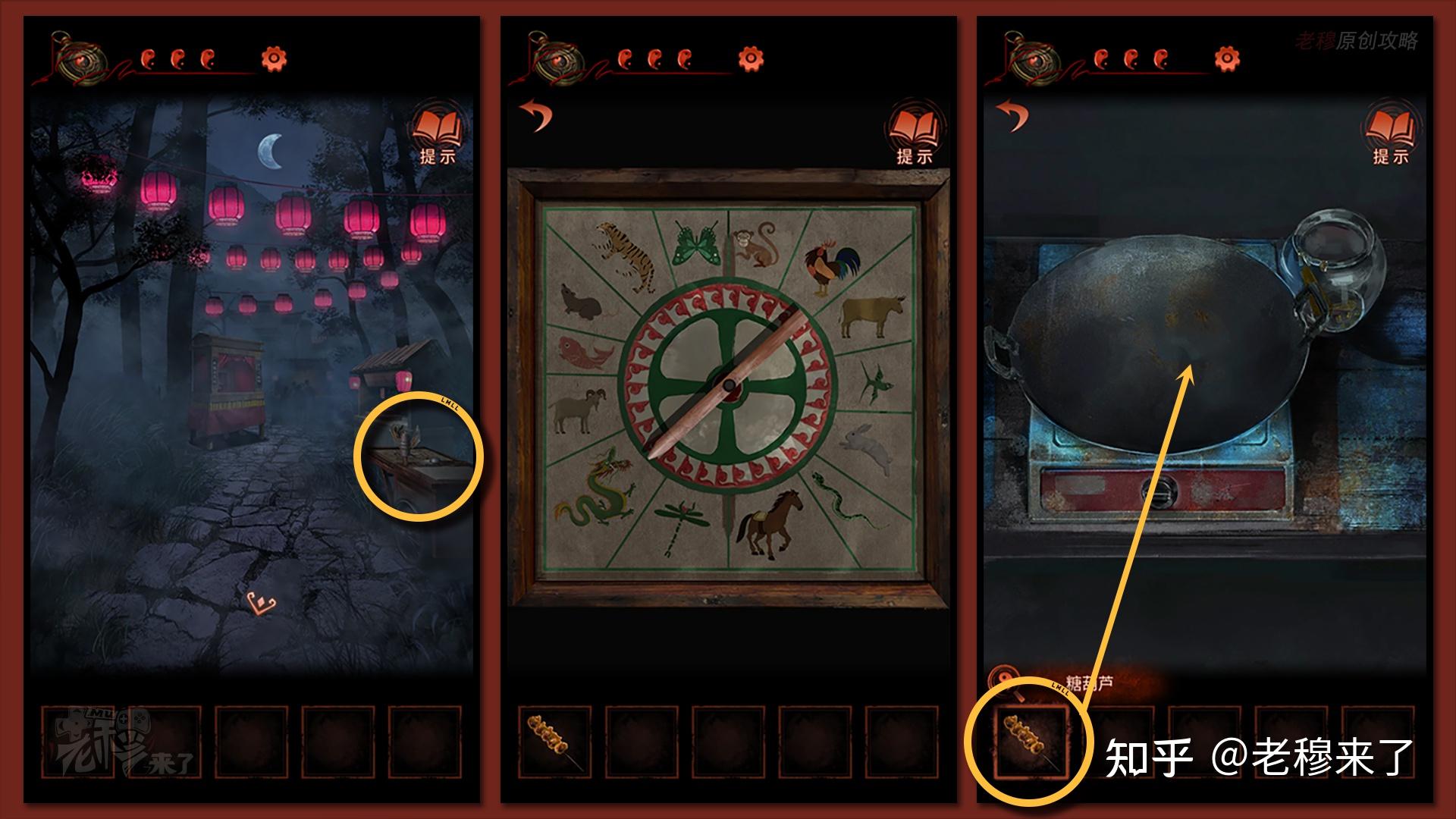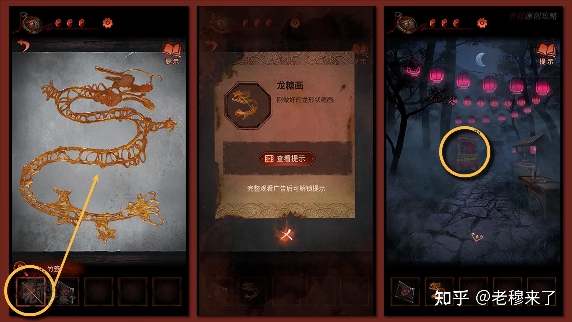 【二更】视角:先来到最右侧视角,察看做糖画的摊子,转盘动弹得到【龙】的提醒,点击【铁锅】,发现糖不敷,将【糖葫芦】上的糖刮下放入锅中