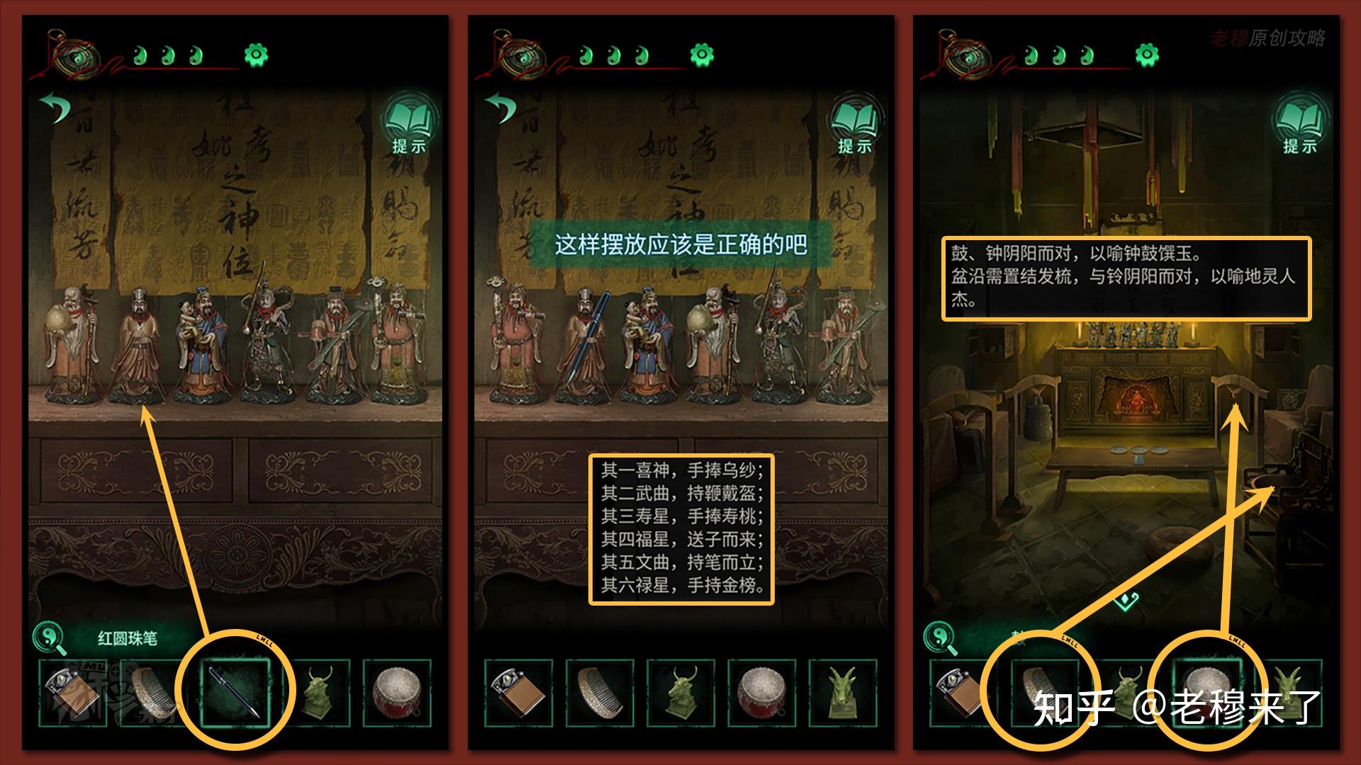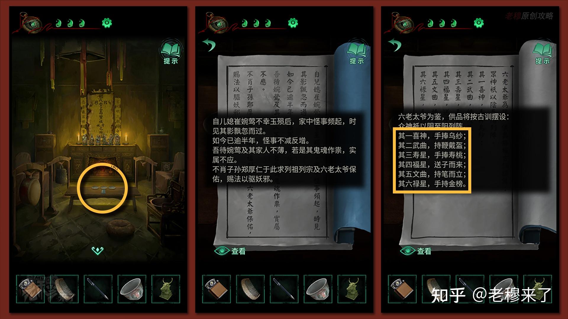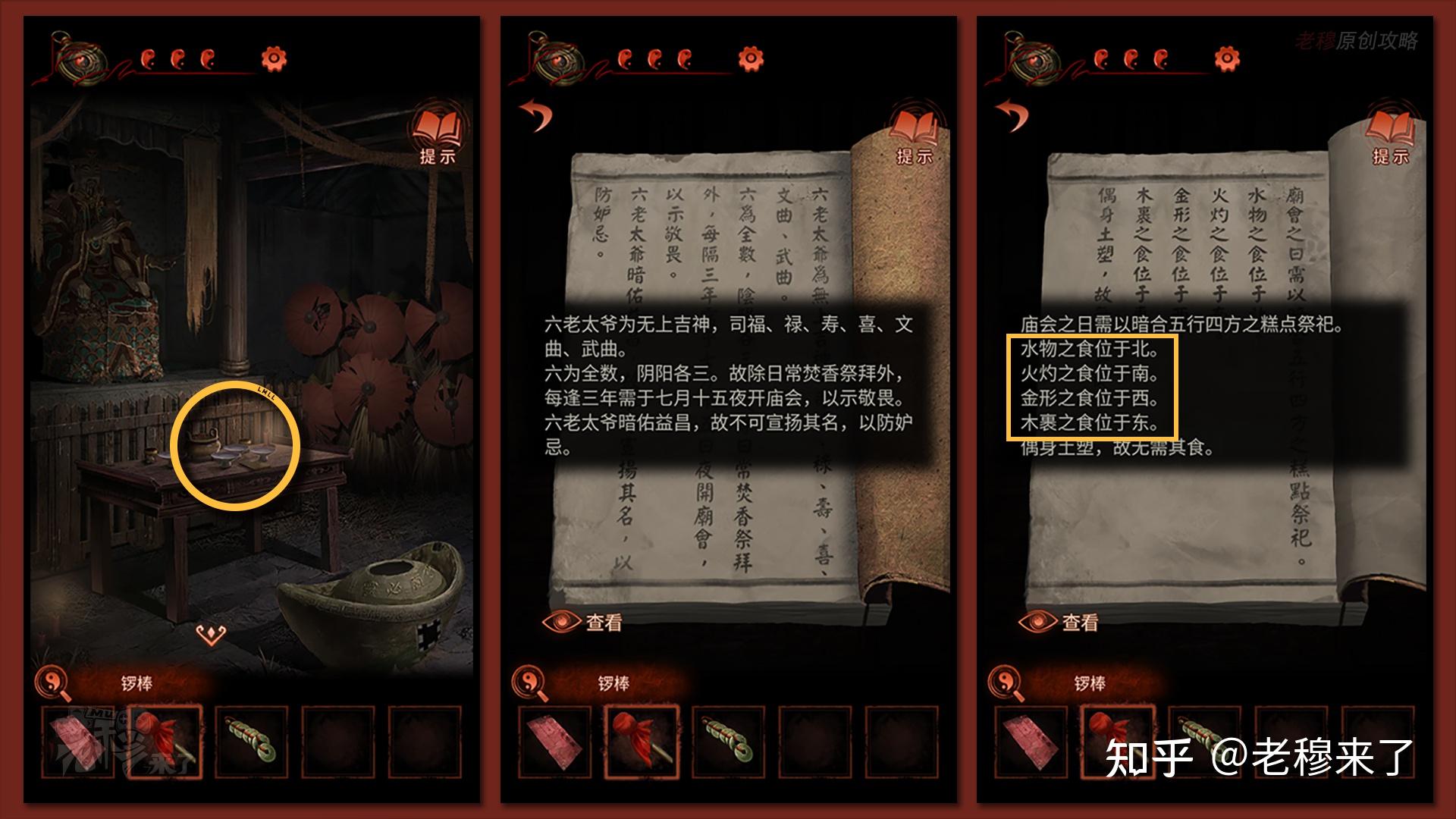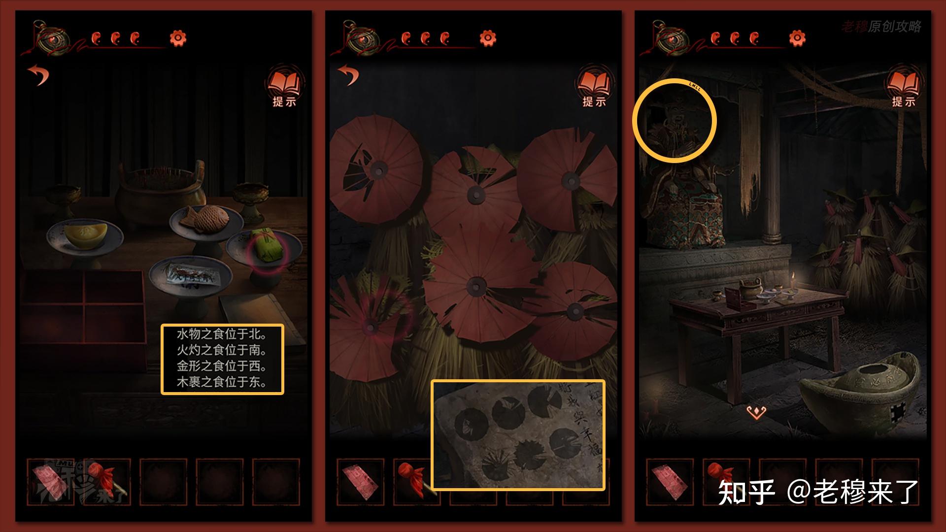 【三更】视角:将【特产礼盒】放置在【佛龛处】,并按照书中给出的线索依次放置:水物之食位于北(鱼),火灼之食位于南(烤牛肉干),金形之食位于西(元宝),木裹之食位于东(竹叶粽),按照【孔明灯】上的线索扭转雨伞,察看财神的嘴巴