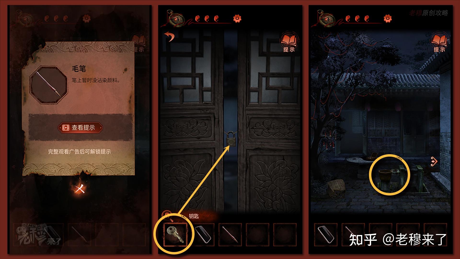 拾取【毛笔】,察看左侧的门,用【钥匙】开门,来到院子,察看石桌附近