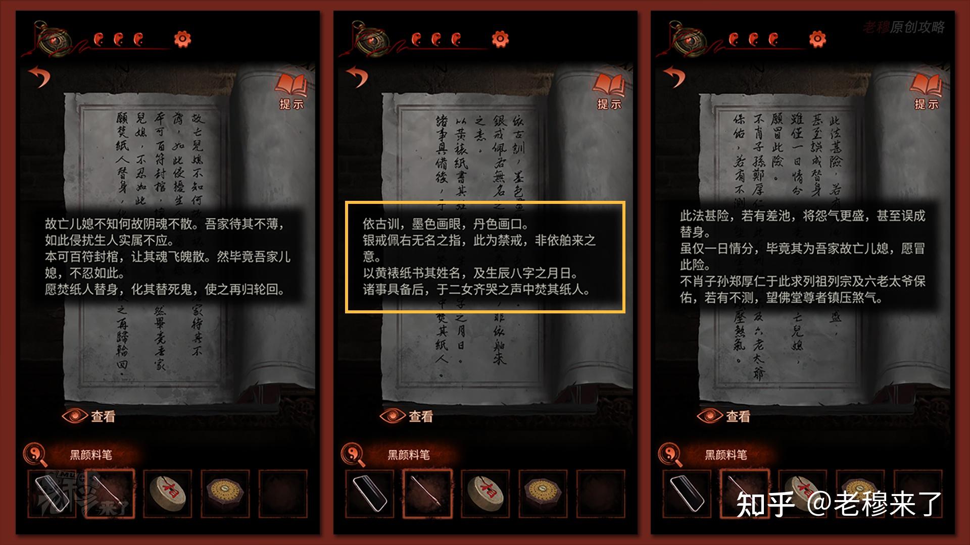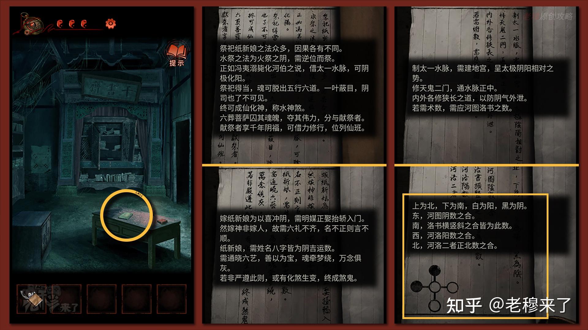 【男主视角】:先切换到女主视角,来到【机巧阁】,点击【龙形石碑】的八卦开关,翻开【机巧阁】左侧的石门,那也就意味着翻开了男主视角【身外廊】左侧的石门,再切换到男主视角,进入【百祭轩】,给纸新娘带上【一对耳环】和【凤冠】,并在桌上的黄纸上协商生辰八字,察看左侧墙壁上的图案