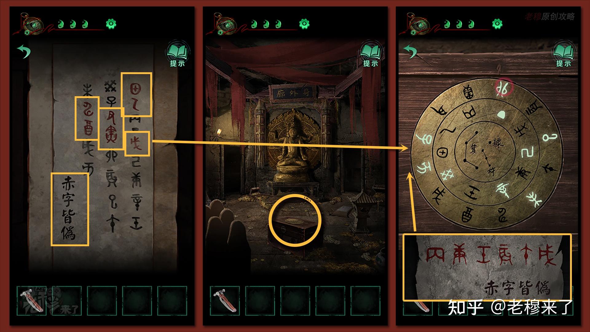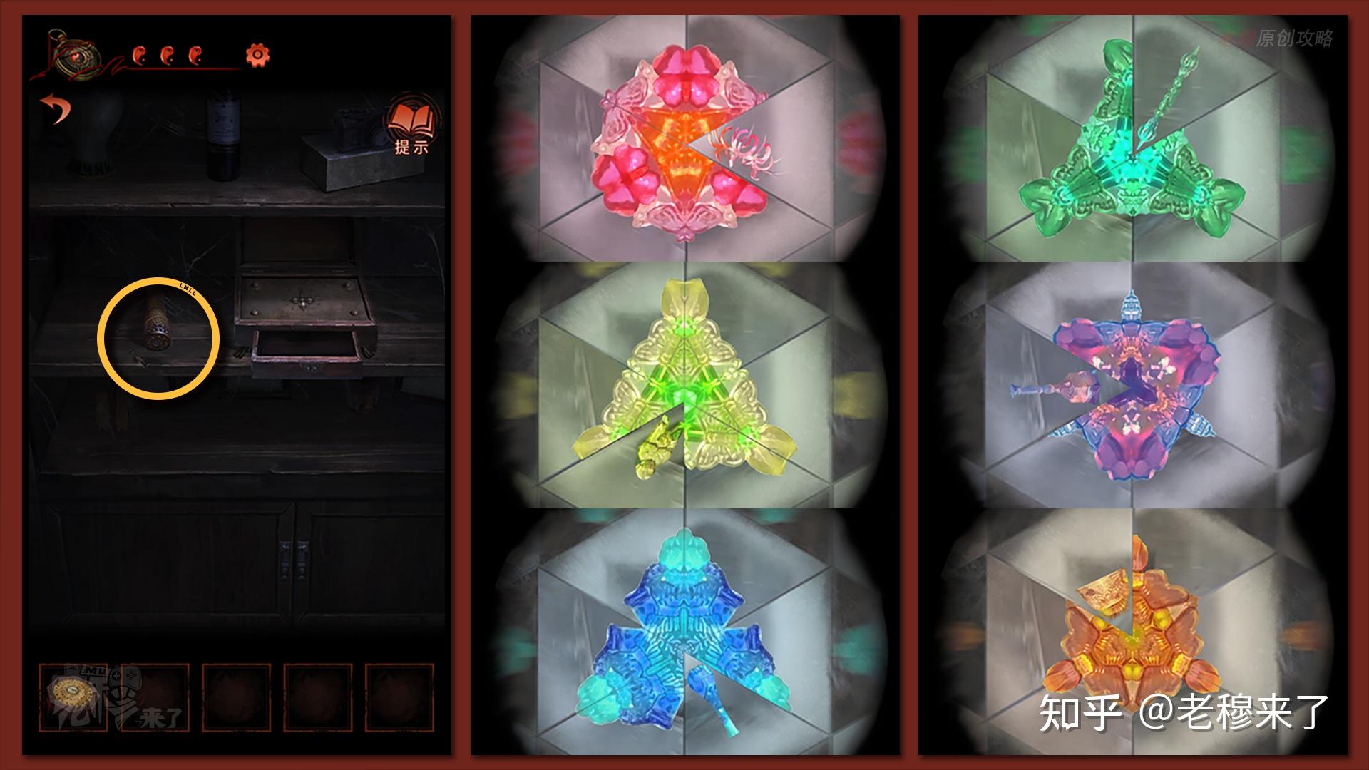 如【万花筒】的线索,调整新翻开的房间中六臂佛像手中的物件儿,解锁后,鄙人方的莲花宝座处拾取【环状饰品】和【小方块】