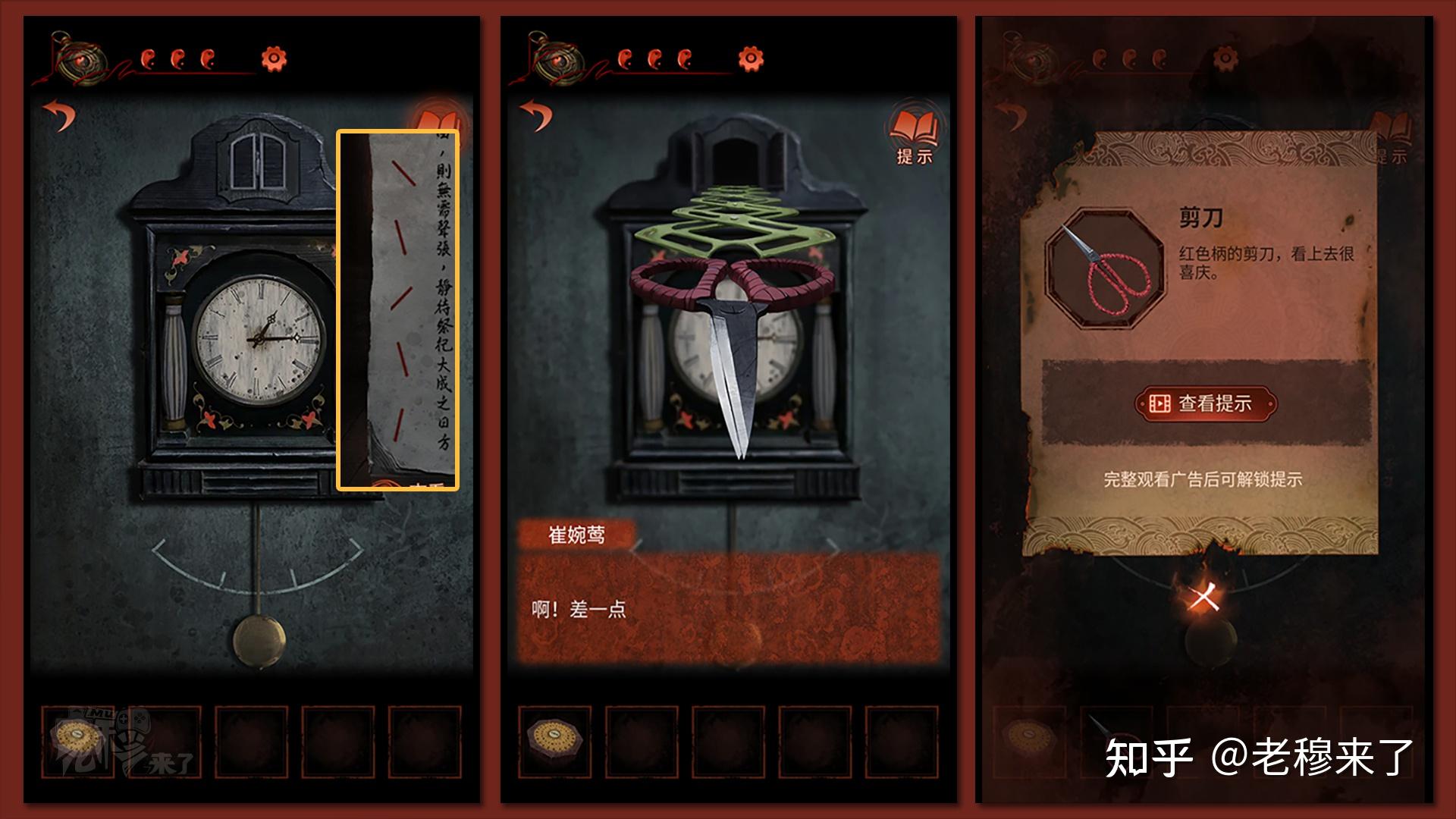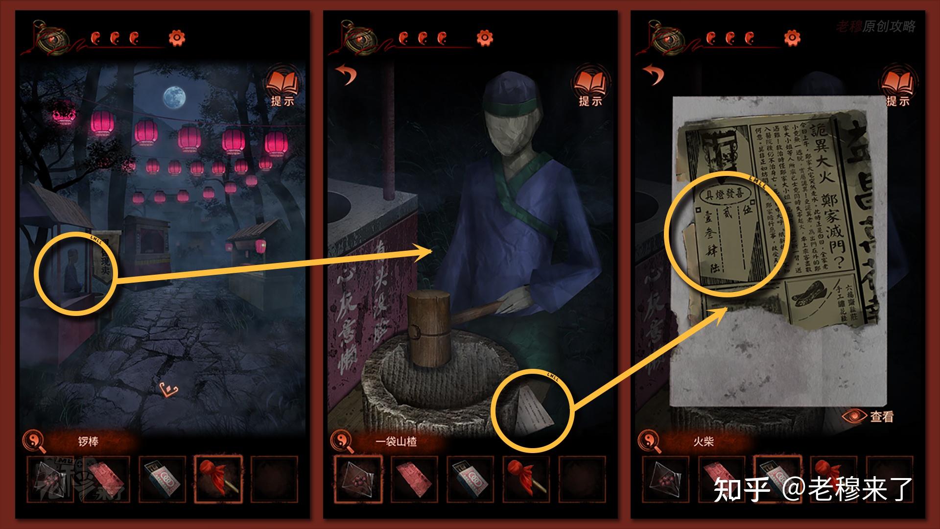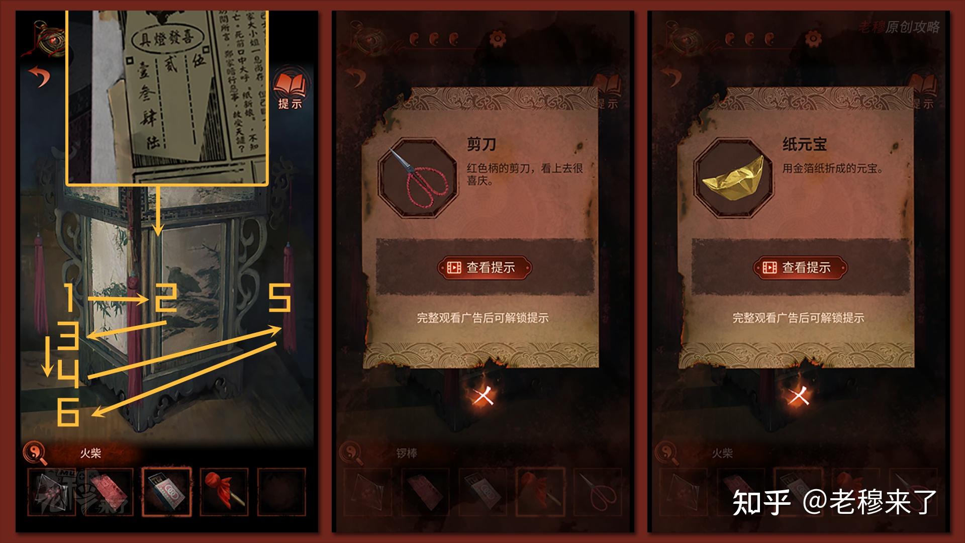 【一更】视角:在【报纸片段】能够得到中间视角的灯笼机关的线索,根据123456的挨次从左至右别离拽动【流苏】,挨次是:【左中左摆布左】,得到【剪刀】和【纸元宝】