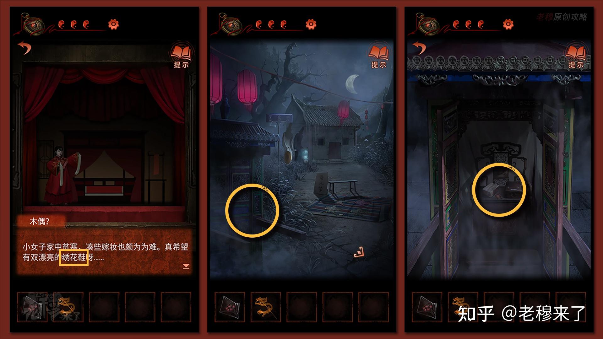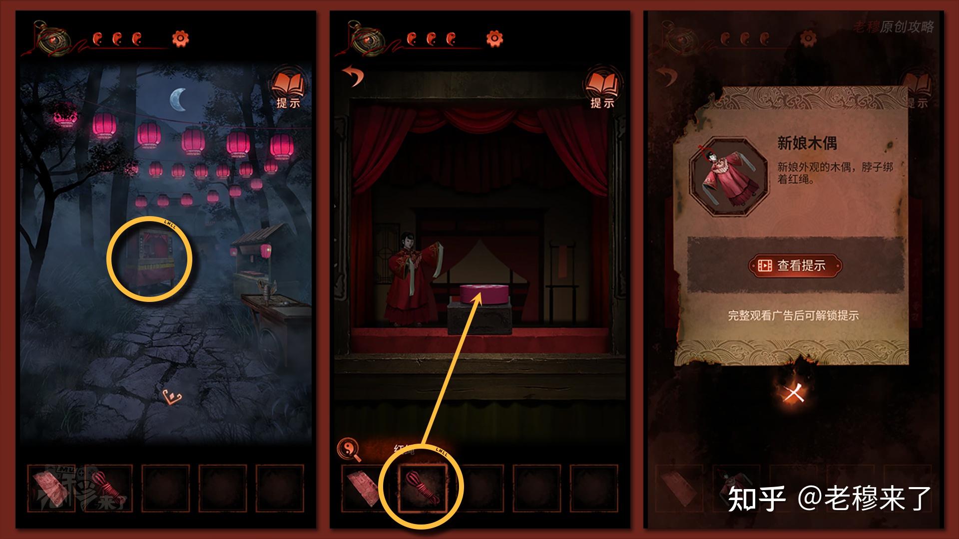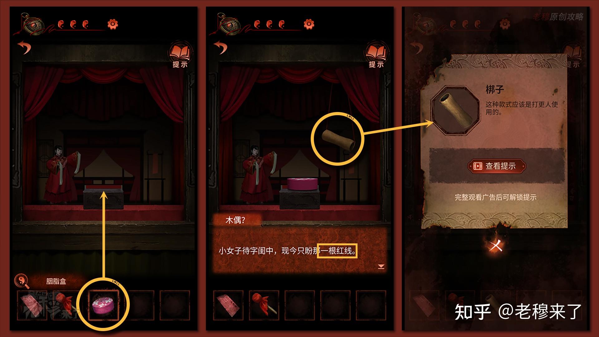 【一更】视角切换【二更】:点击黑白无常,敲打锣四下,回到【二更视角】,来到戏台位置,将【胭脂盒】放置在戏台中央,得到新的线索【一根红线】和【梆子】(能够前去【三更】)