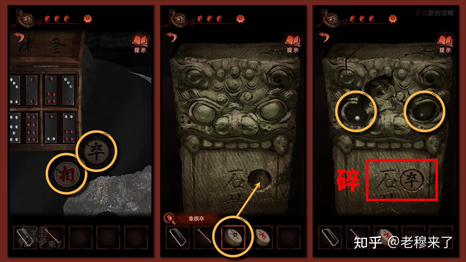 机关翻开后,拾取【相】【卒】两个象棋,再次前去石狮子石碑,将【卒】安拆在圆孔处,如许构成【碎】字,石狮子眼部碎裂,露出【黑白珠】并拾取