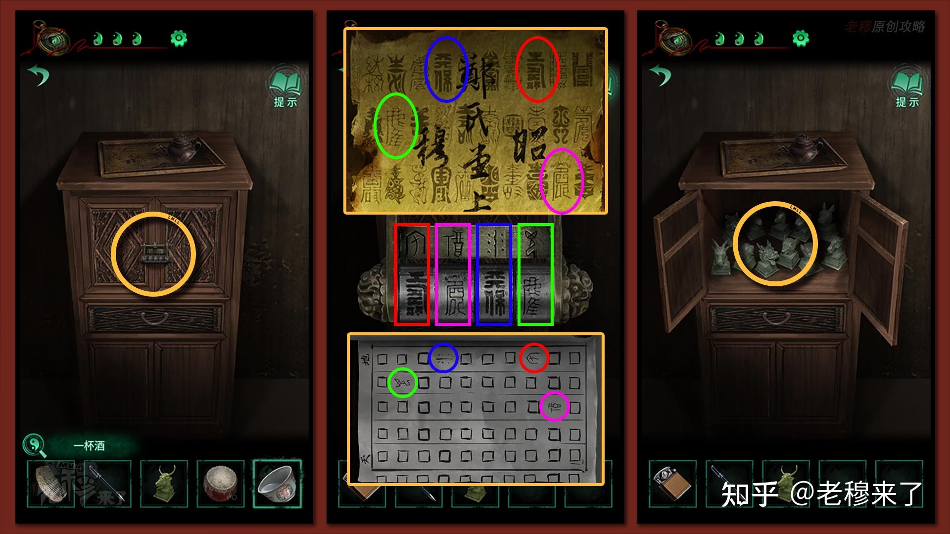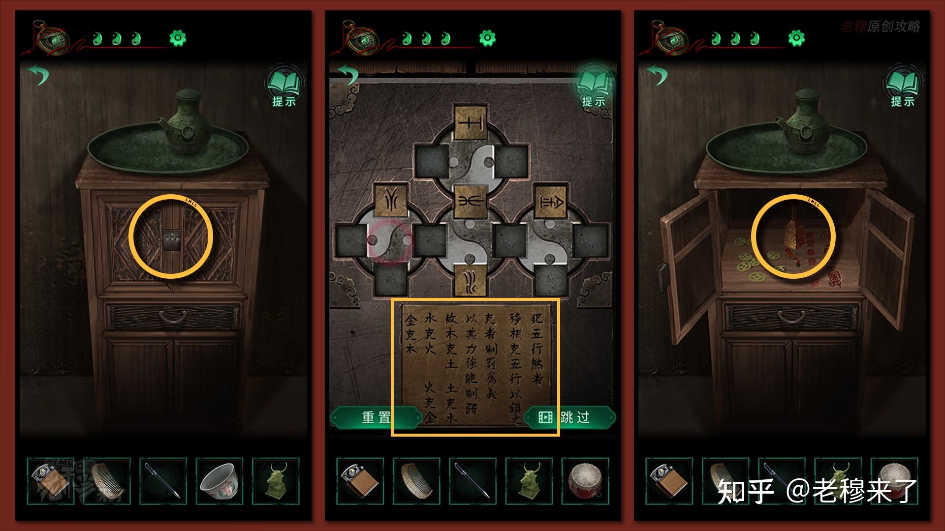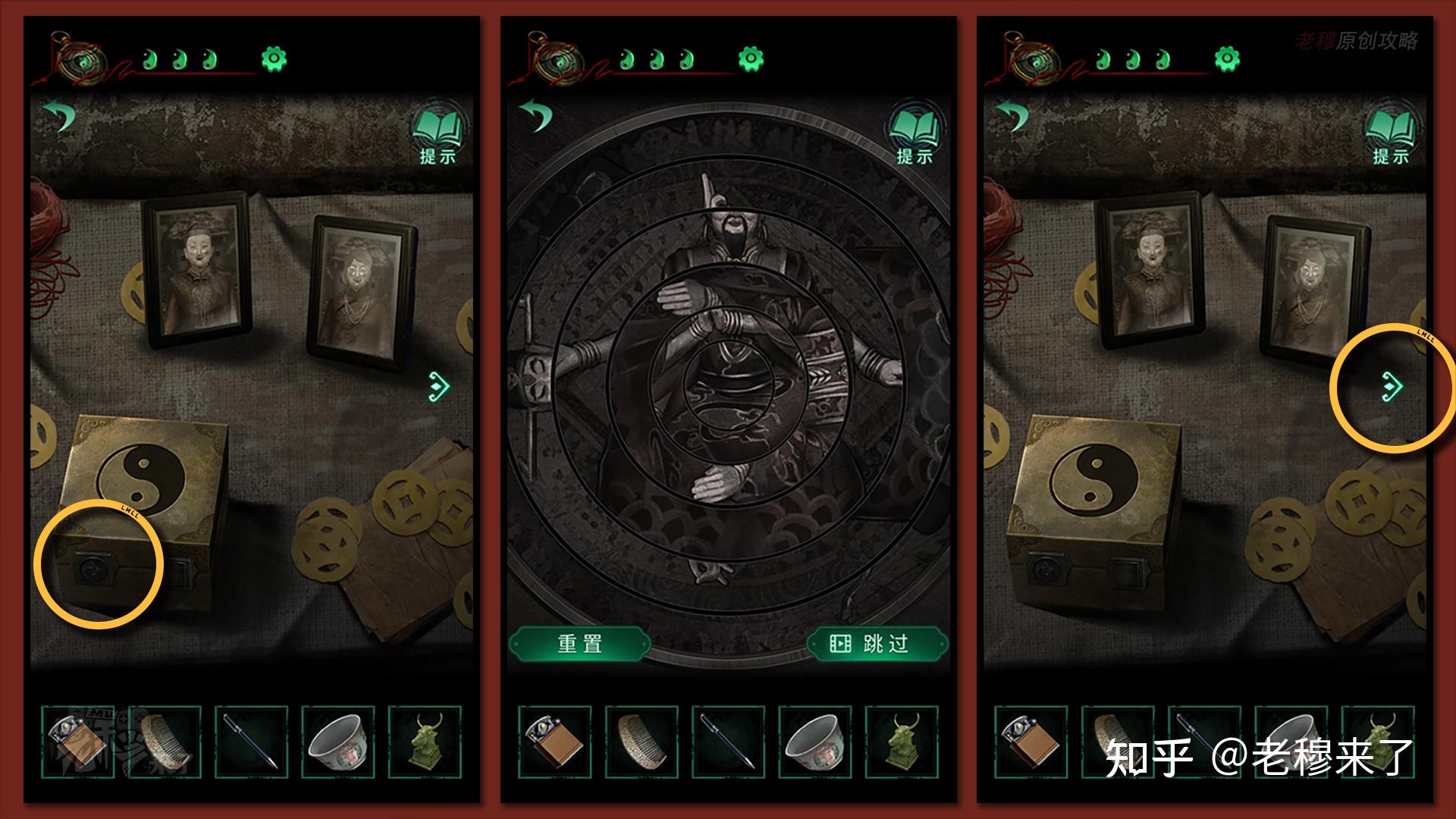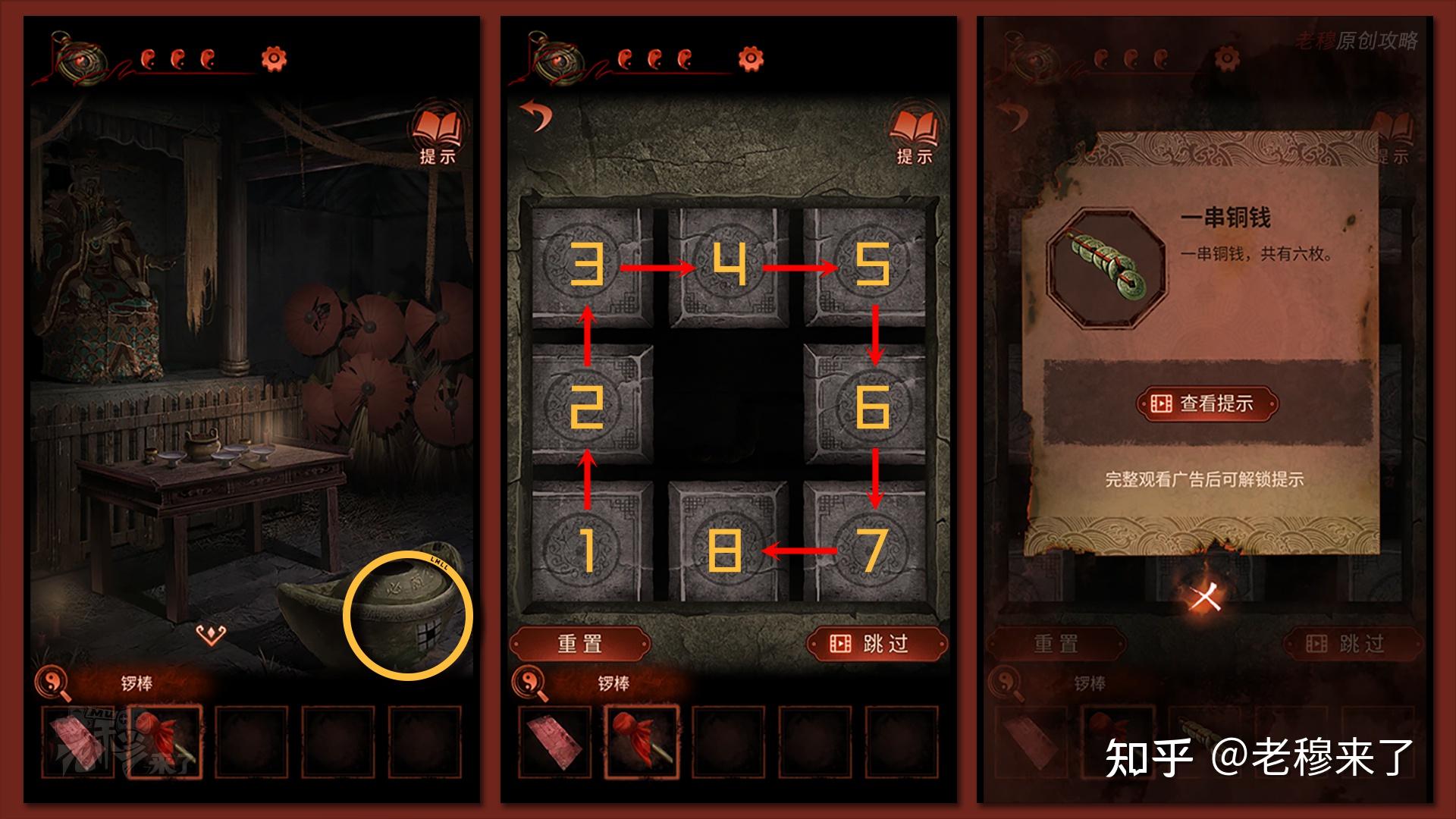 【三更】视角:察看地上的元宝罐子,通过如图的挨次,从左下角起头顺时针依次点击,能够翻开机关,获得【一串铜钱】(游戏提醒:按照别离按按键能够察看到,最左下角是独一一个只能本身激活本身的按钮,所以从那个按钮起头能够依次按开和隐藏其它按钮)