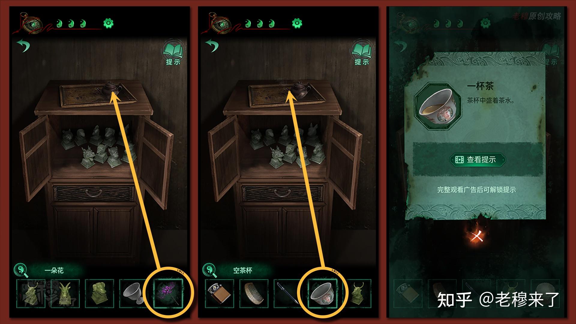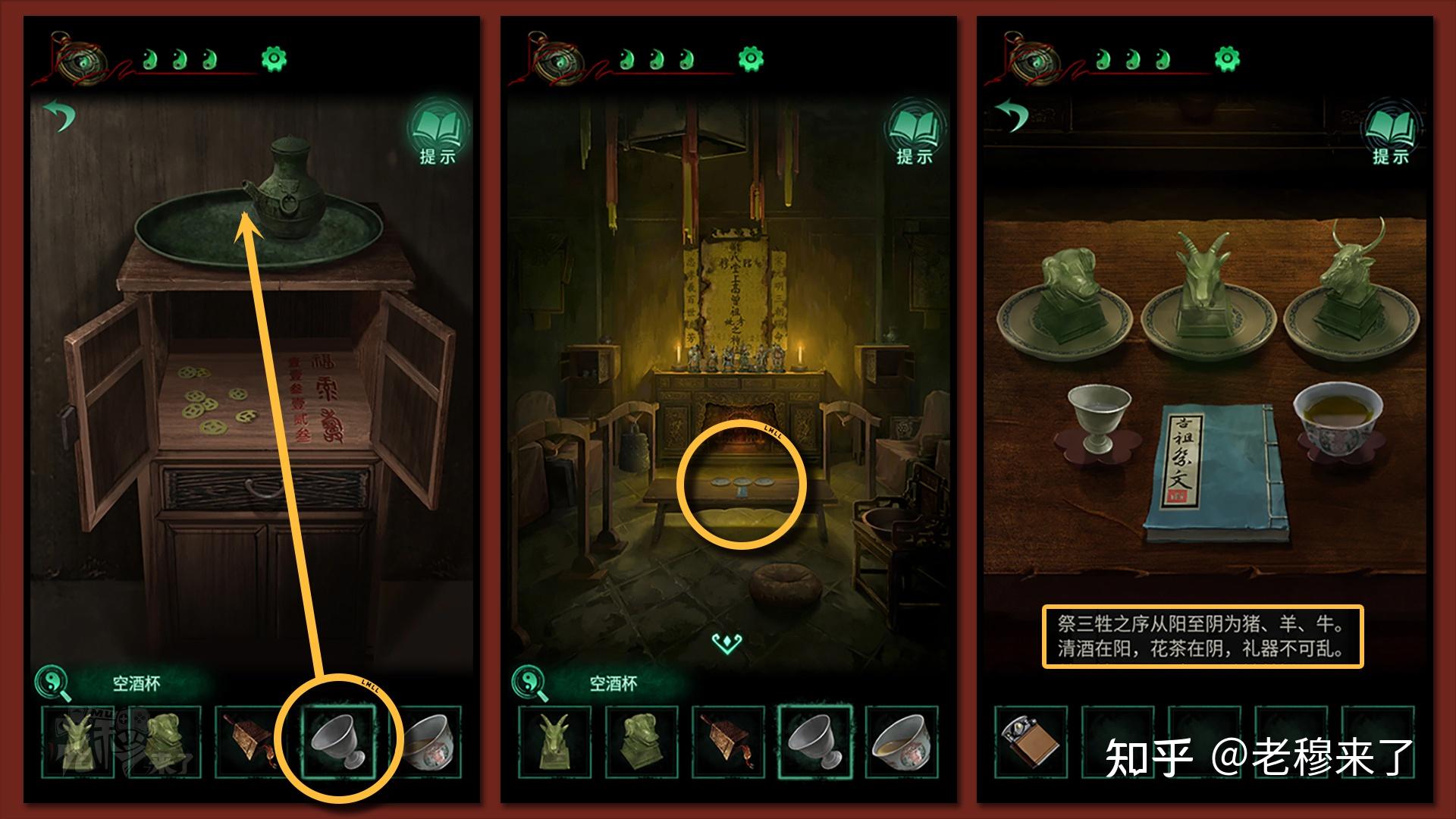 再用【空酒杯】到右侧的木柜上方倒得【一杯酒】,来到中间的桌子前,根据书中从阳到阴,从左往右摆放【猪头雕像】【羊头雕像】【牛头雕像】,并将【酒杯】放在左侧,把【茶杯】放在右侧,