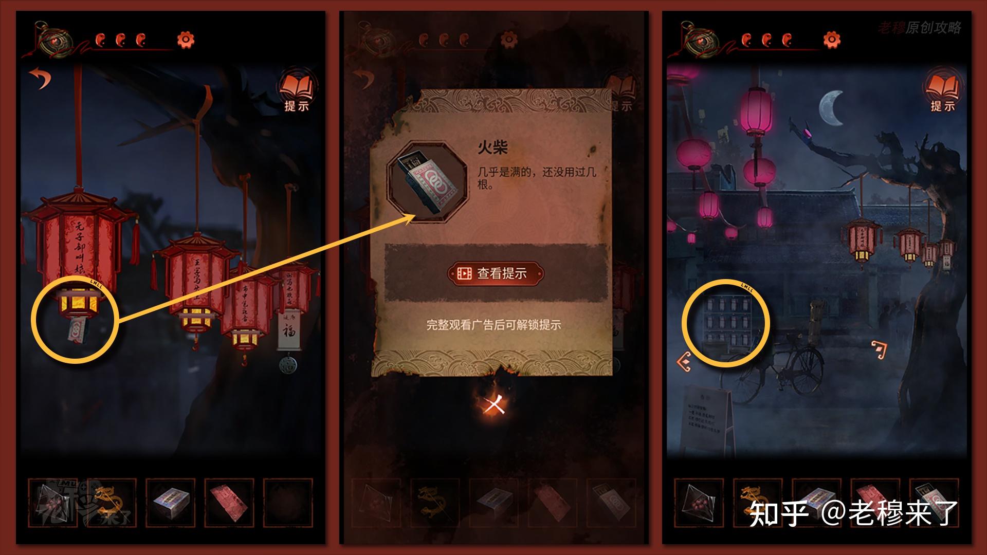 【二更】视角:察看第一盏灯笼,拾取【火柴】,退出视角察看左侧的【动物花灯】