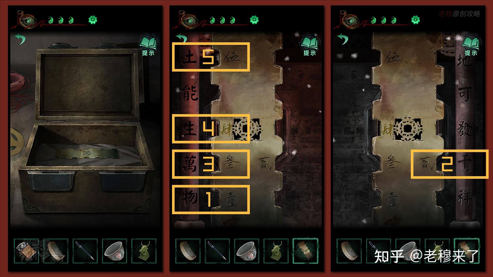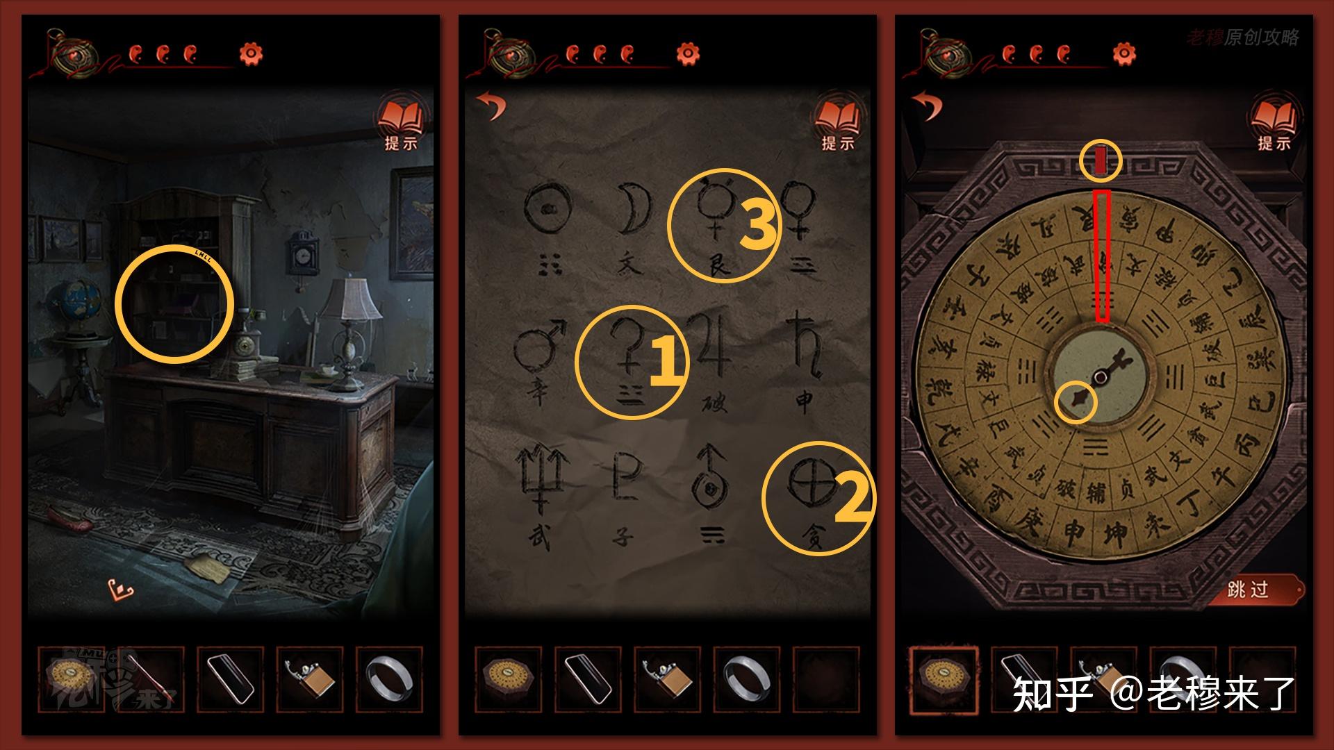 在左侧书架位置察看【机关匣子】,翻开【罗盘】,其利用办法同上,显示密码是:【艮(八卦图形)、贪、艮】