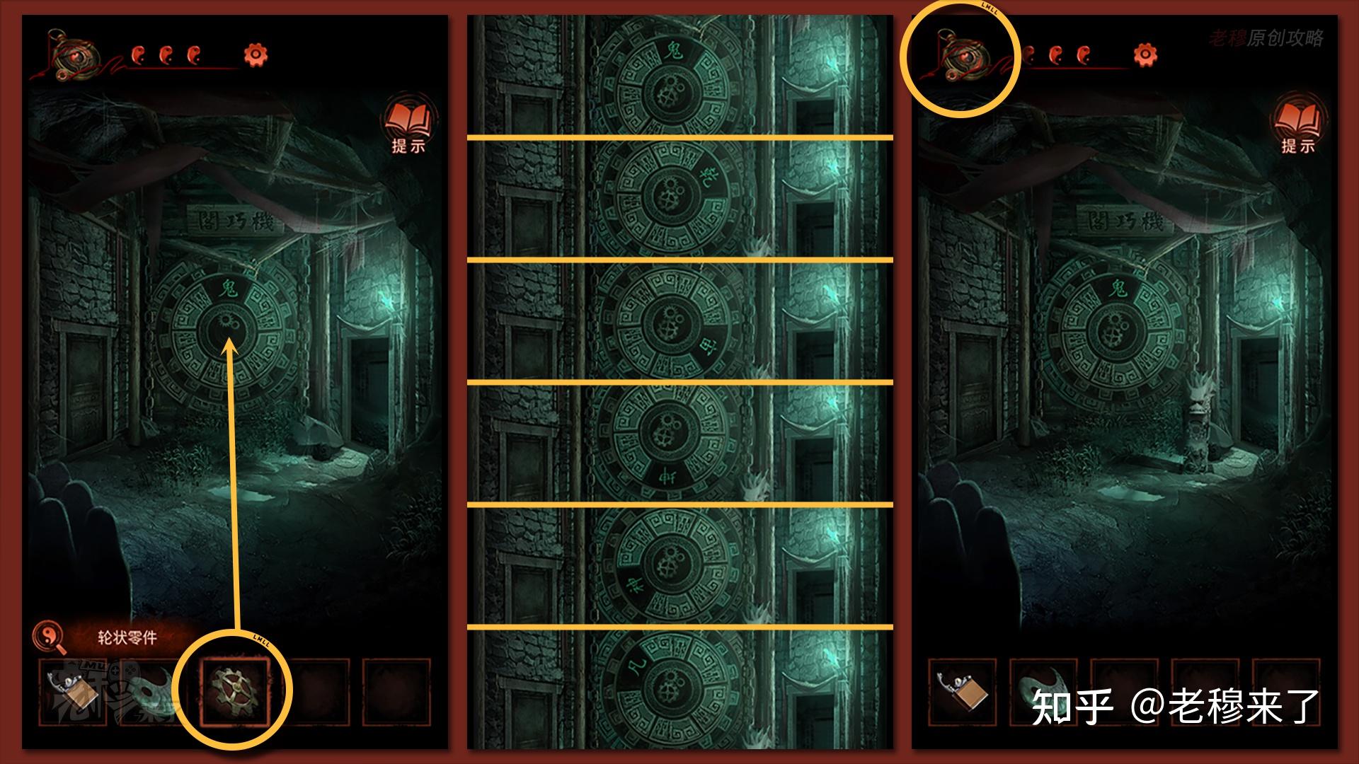 【女主视角】:来到左侧的【机巧阁】,将【轮状零件】安拆在中间的圆形机关上,机关主动扭转后,会得到字串线索:【鬼→乾→宙→坤→神→凡】,点击左上角的坠饰切换到男主的视角