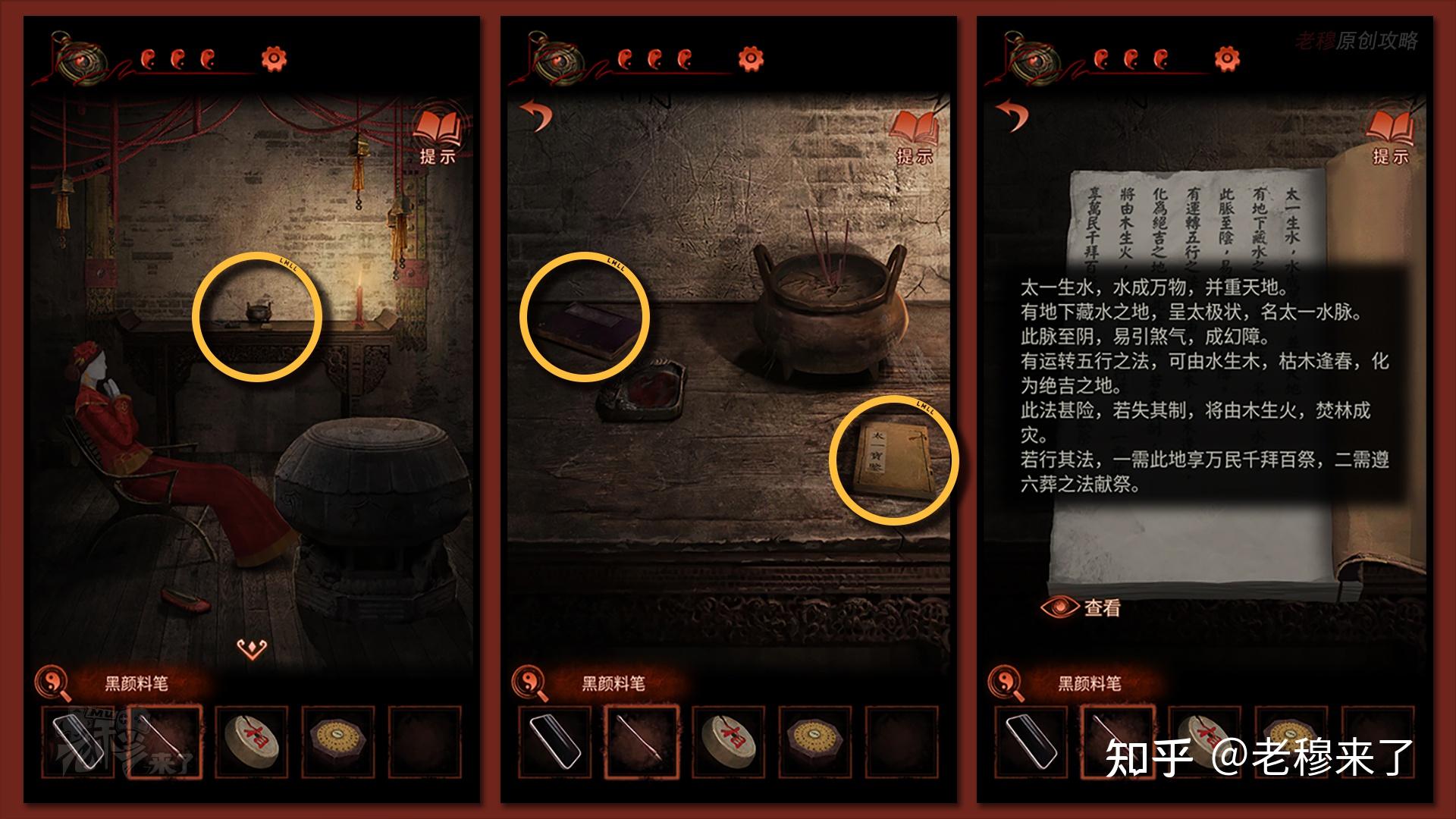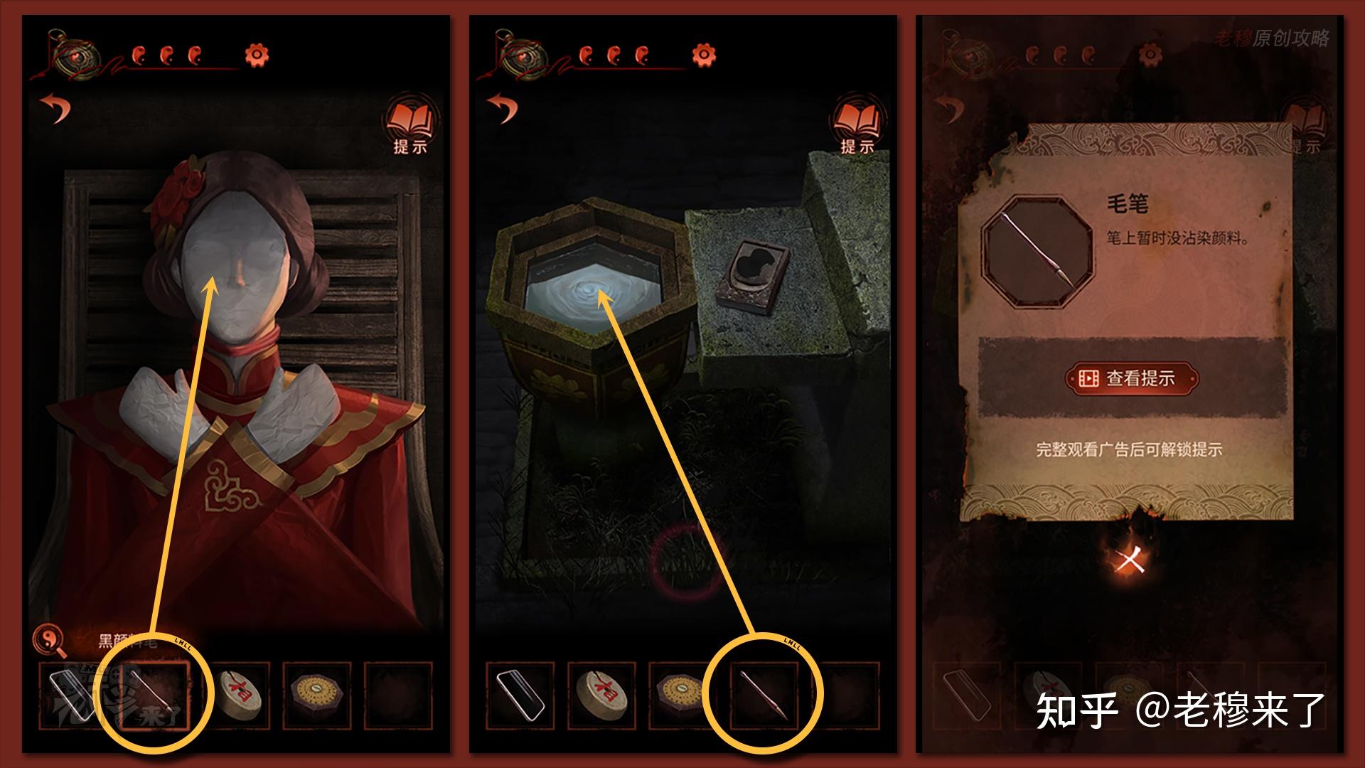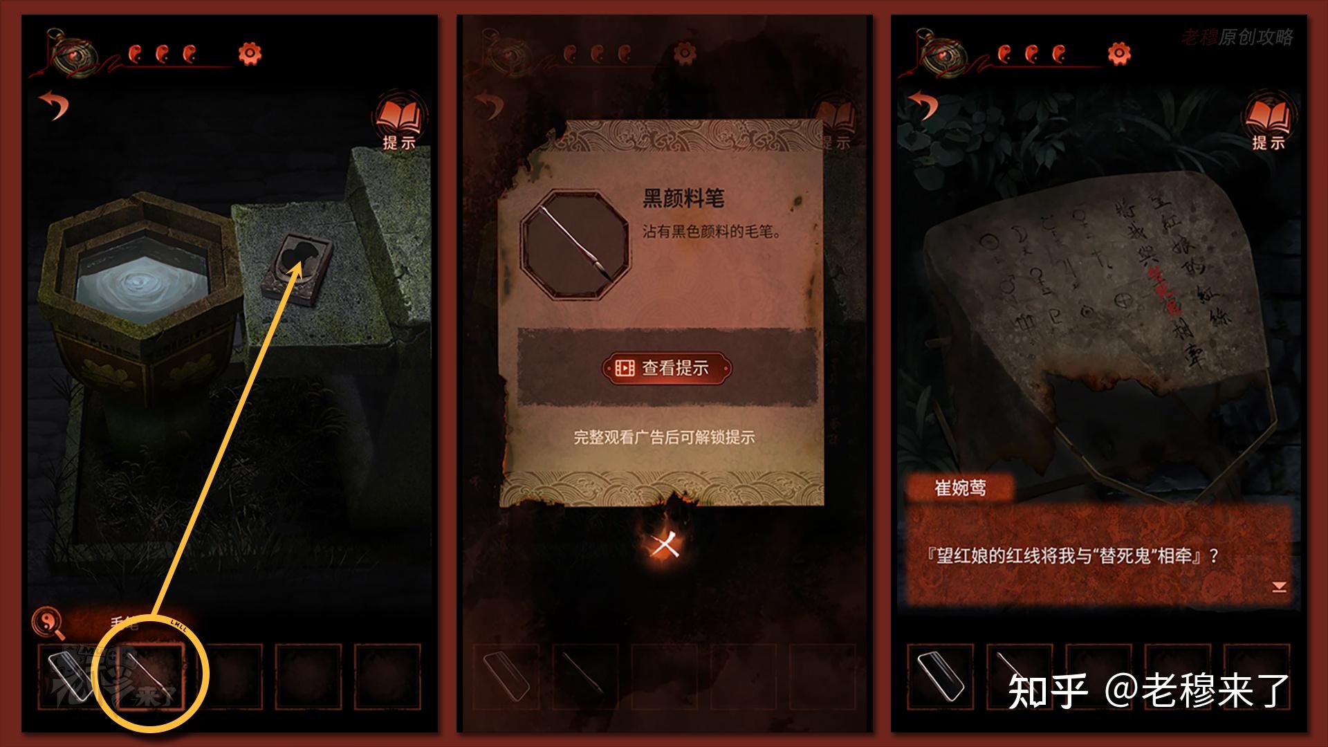 用【毛笔】蘸取墨汁,得到【黑颜料笔】,察看左侧的【孔明灯】有剧情被触发