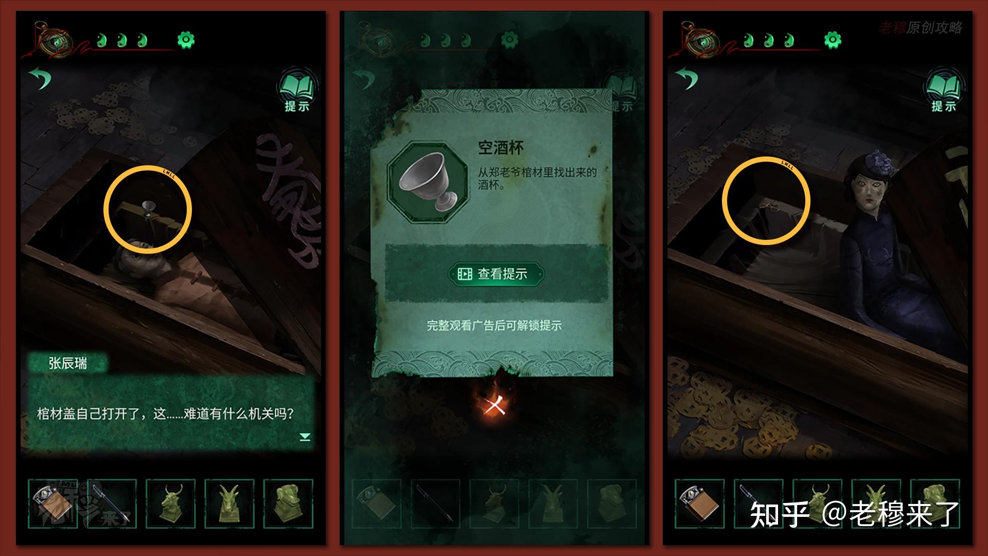 寿字棺材翻开,拾取【空酒杯】,转向福字棺材,拾取【修眉刀】