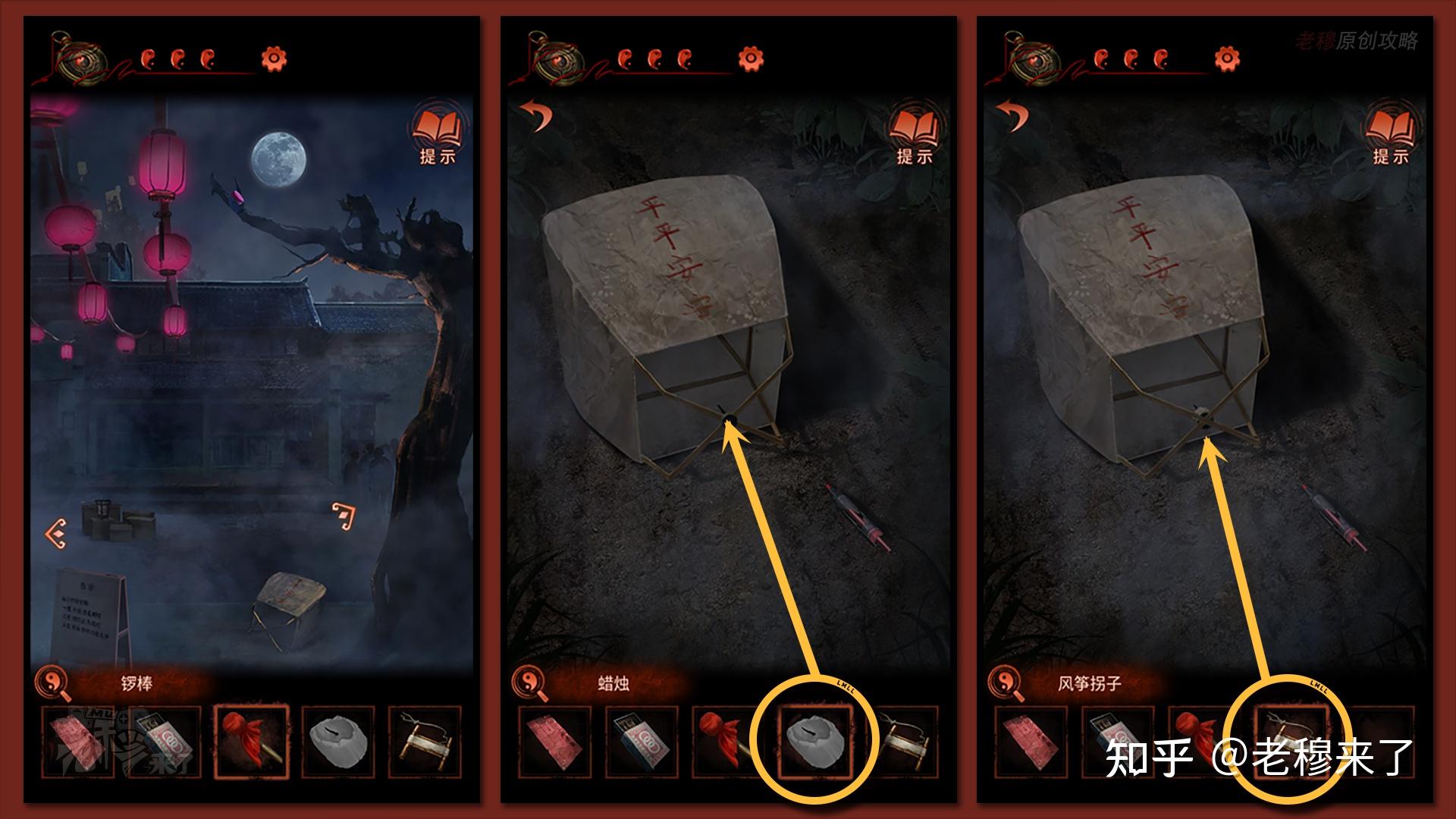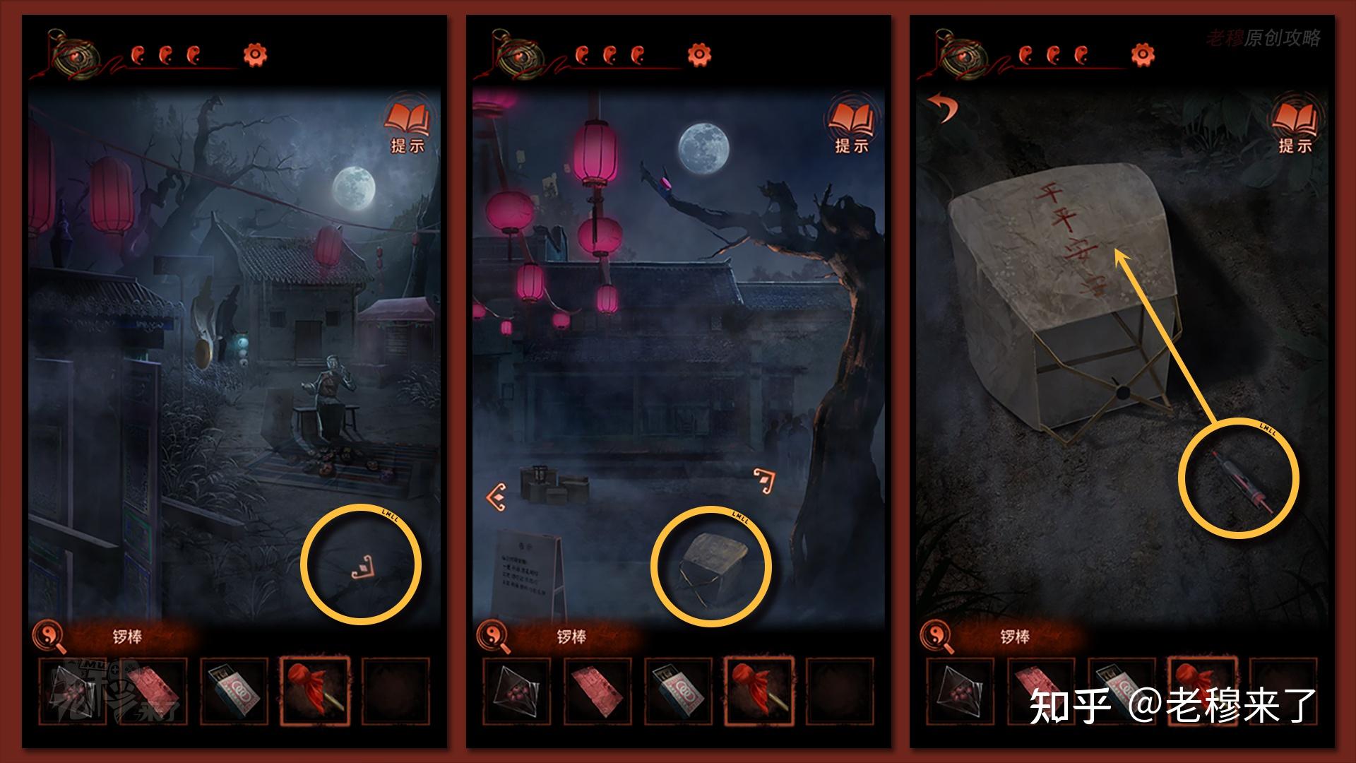 【三更】视角:来到中间视角,察看孔明灯上的符号,是屋内花伞的线索,再来到最右侧的特产摊子