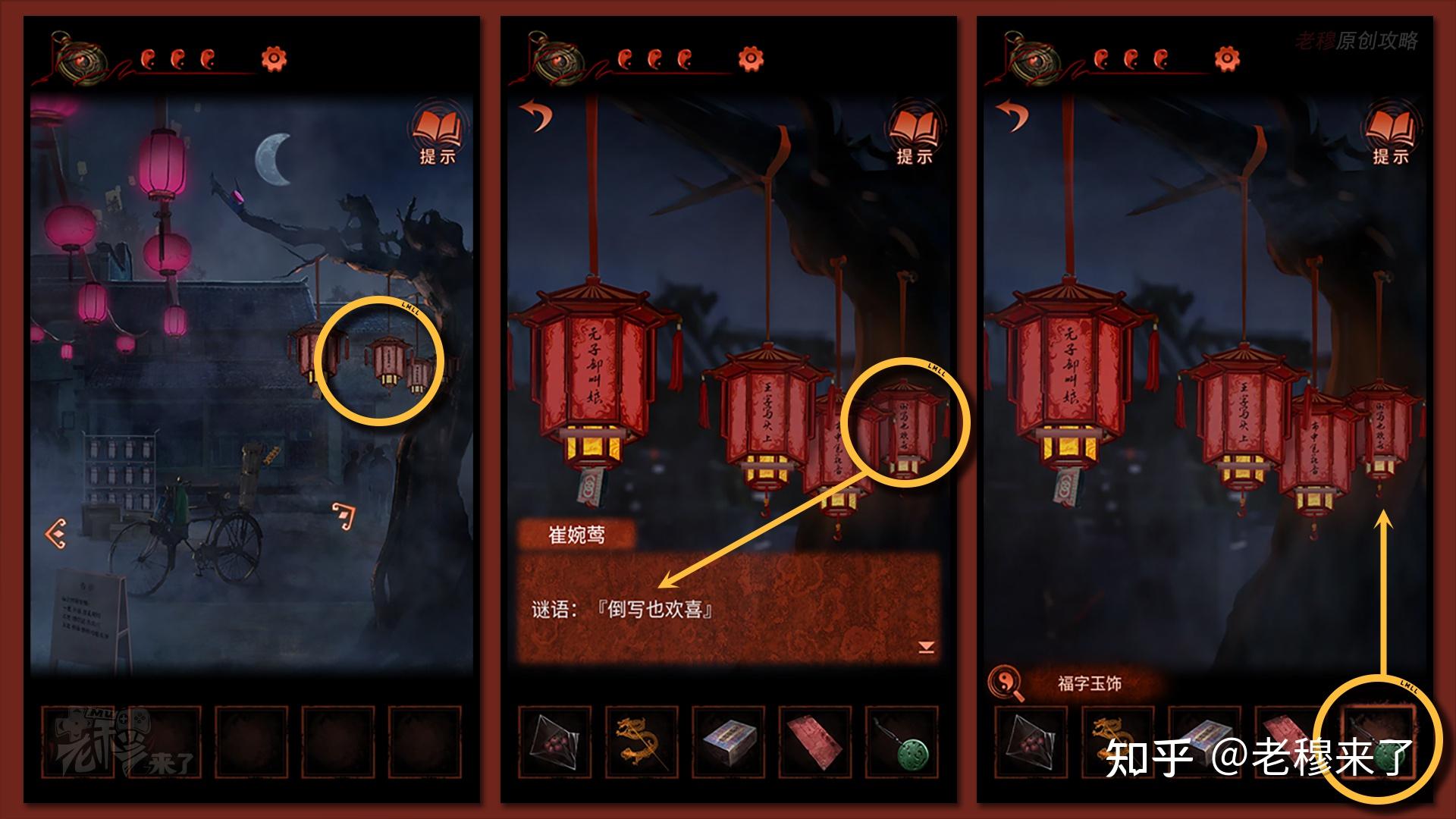 【二更】视角:察看树上的灯笼,将会依次完成灯谜。先点击最右侧灯笼,提醒:倒写也欢喜,谜底是【福】,顾将【福字玉饰】悬挂鄙人方