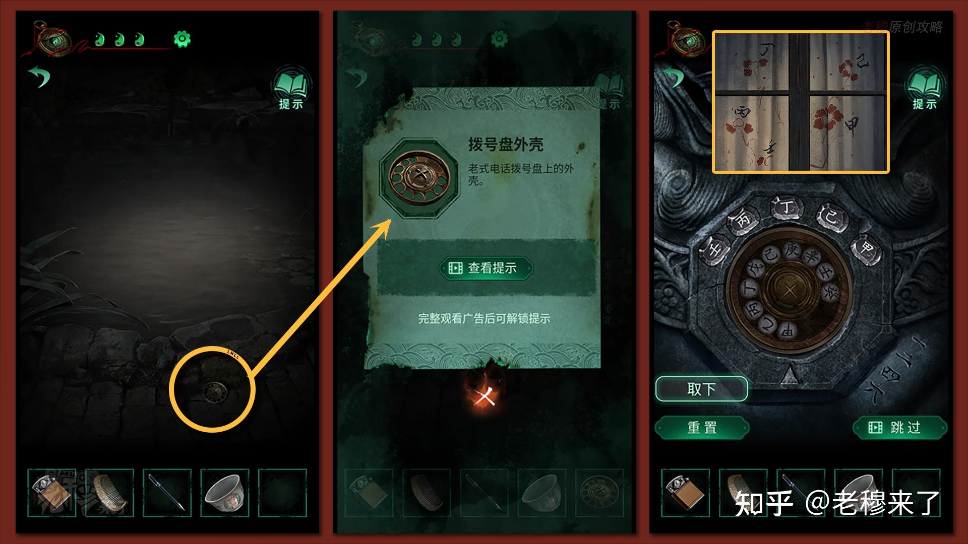剧情事后,拾取掉落的【拨号盘外壳】。回到大门外,给左侧刻着一二四六的石狮子安拆【拨号盘外壳】,并根据适才窗帘上的密码线索【壬丙丁己甲】,依次将对应的字拨转瞄准下方的箭头
