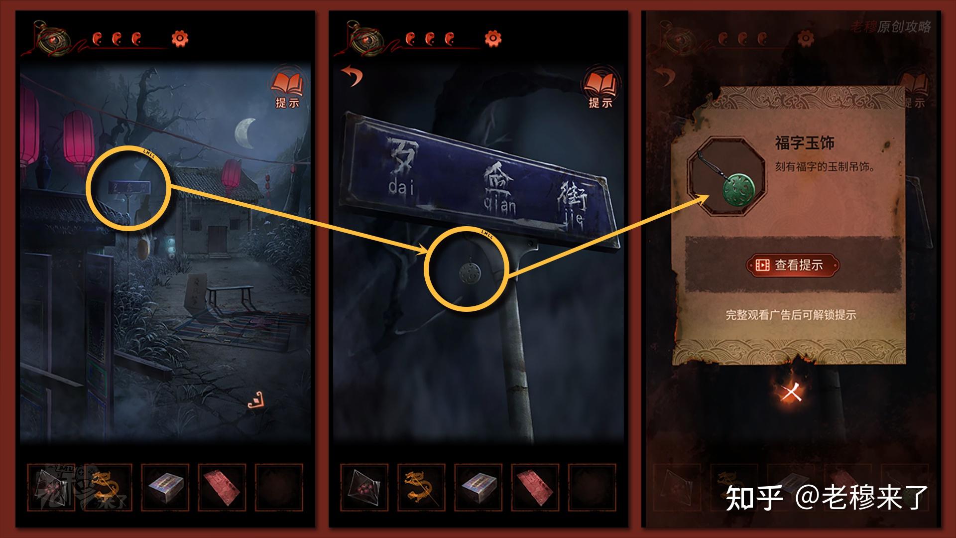 【二更】视角:察看左侧的【路牌】,拾取悬挂鄙人方的【福字玉饰】
