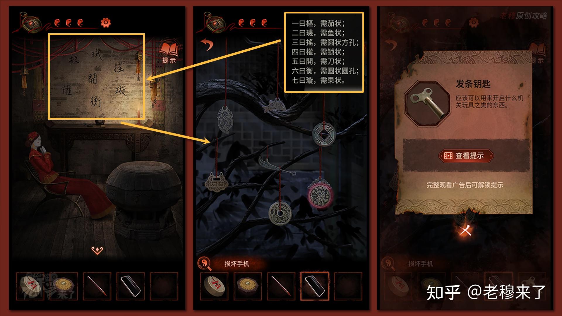 之后墙上显示出新的线索,再按照树上缩写的内容:樞-茄状,璣-鱼,搖-圆币方孔,權-锁状,開-刀状,衡-圆币圆孔,璇-果子外形,如图所示摆放后获得【发条钥匙】