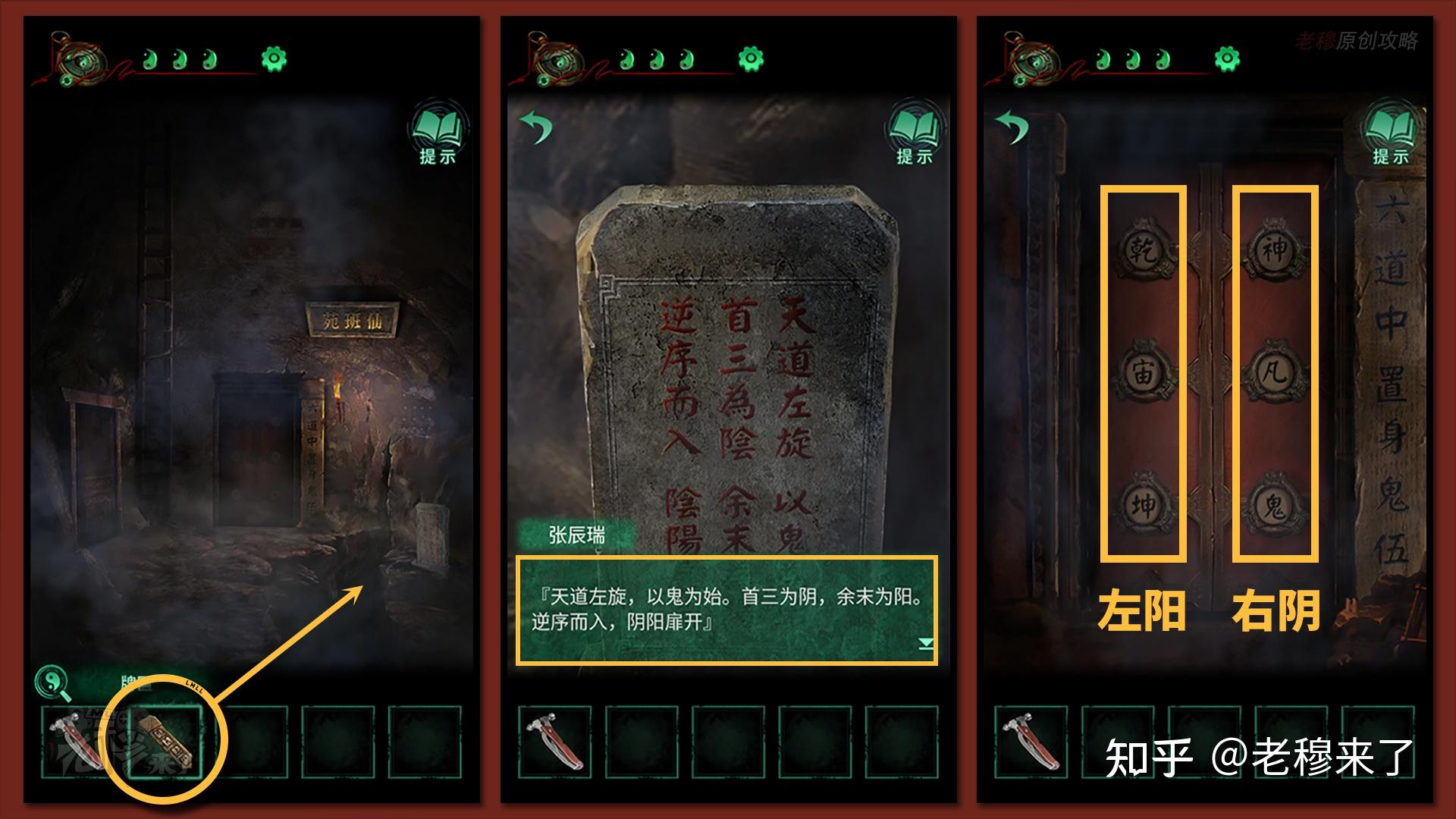 石碑写道:逆序而入,阴阳扉开,起首按照左为阳、右为阴(例如我们常说的男左女右),将门分红左门和右门,从下到上逆序摆列,所以右边门密码由上至下是【乾宙坤】,右边门密码由上至下是【神凡鬼】