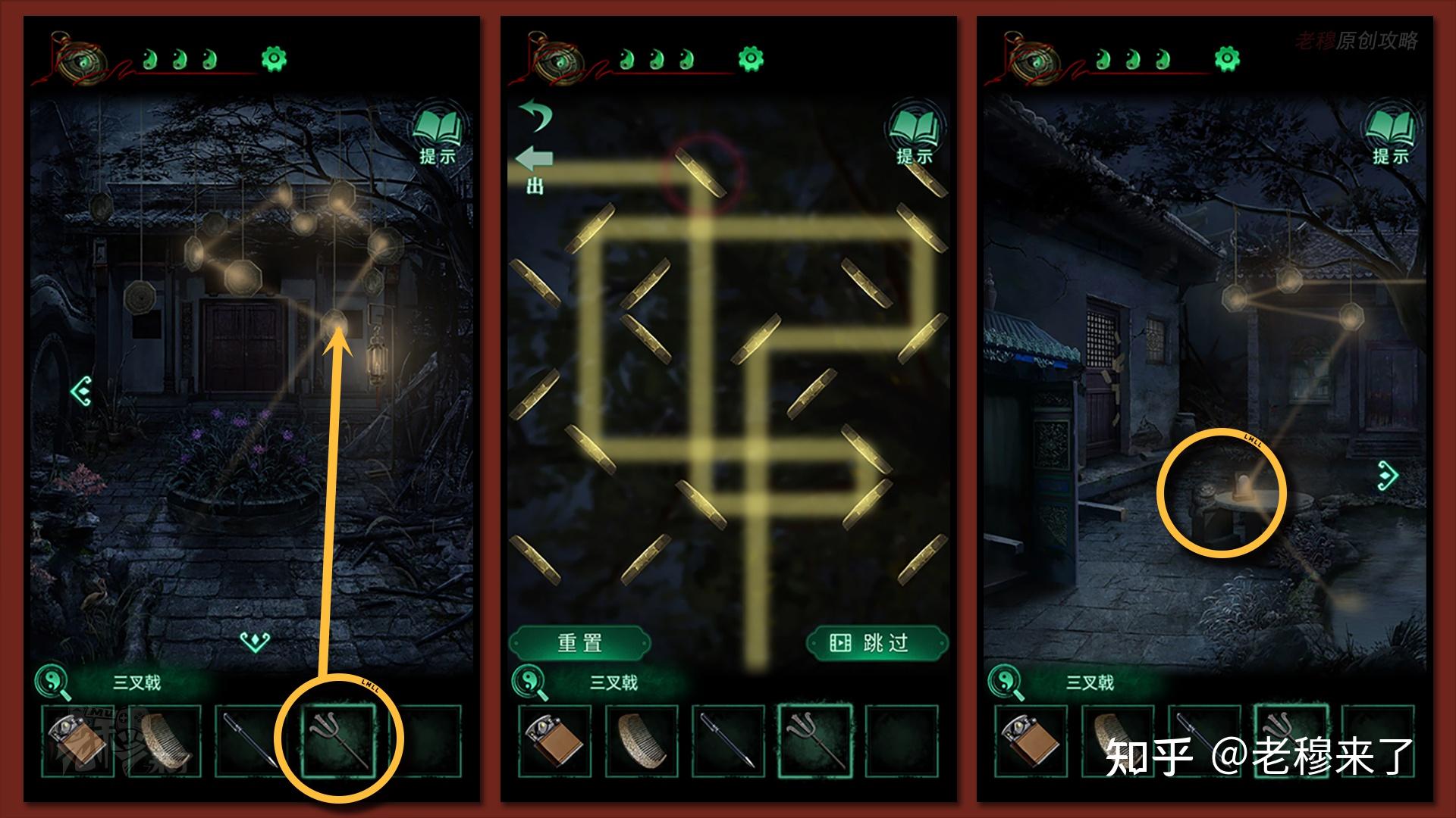 用【三叉戟】调整挂在院中的【铜镜】,进入小游戏(很简单),光会折射到【轿子视角】