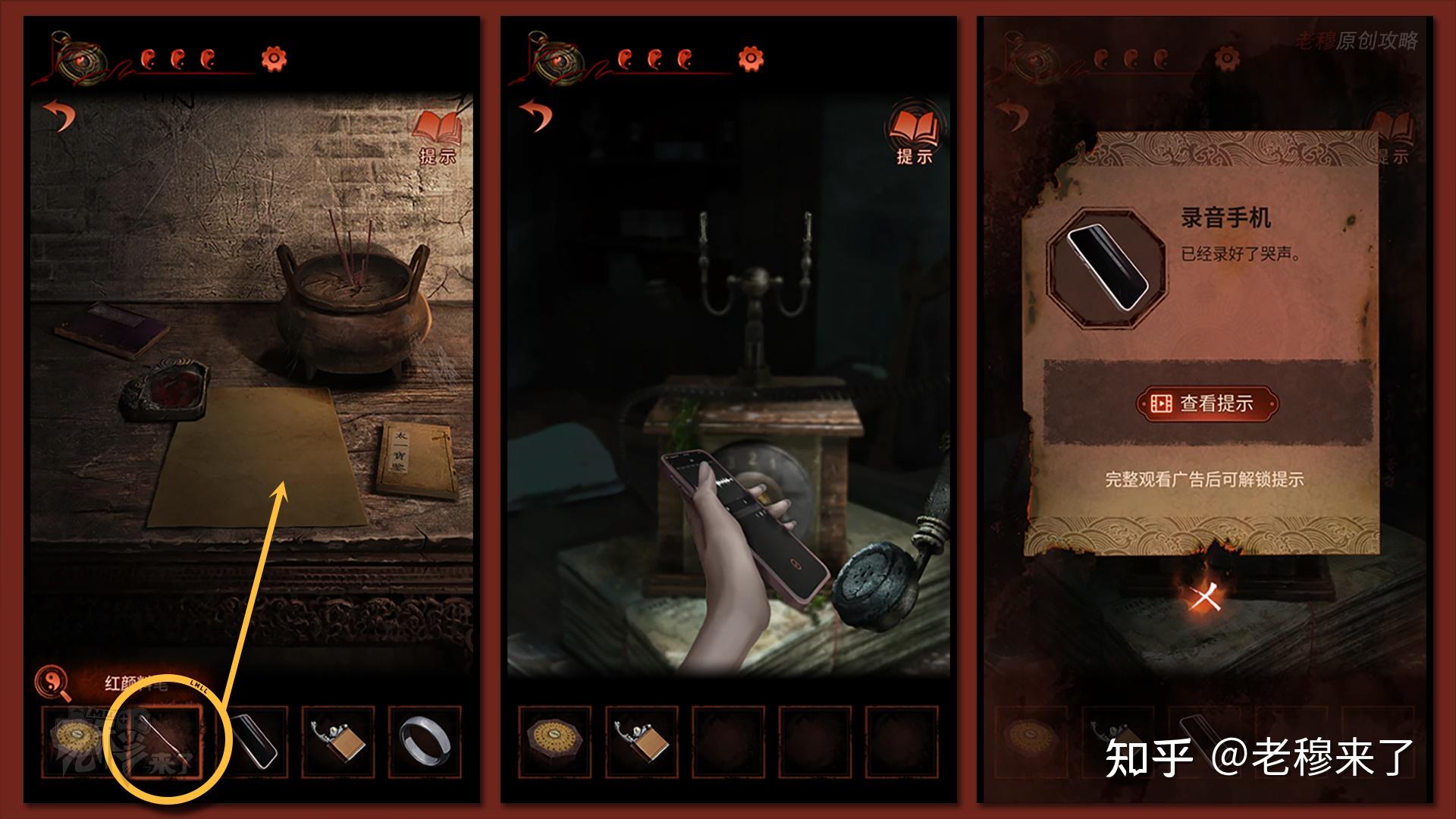 将【黄裱纸】放在桌上,再用【红颜料笔】写生辰八字,再回到刚刚有德律风的房间,拿下话筒,用【损坏手机】录造话筒中的哭声,得到【灌音手机】