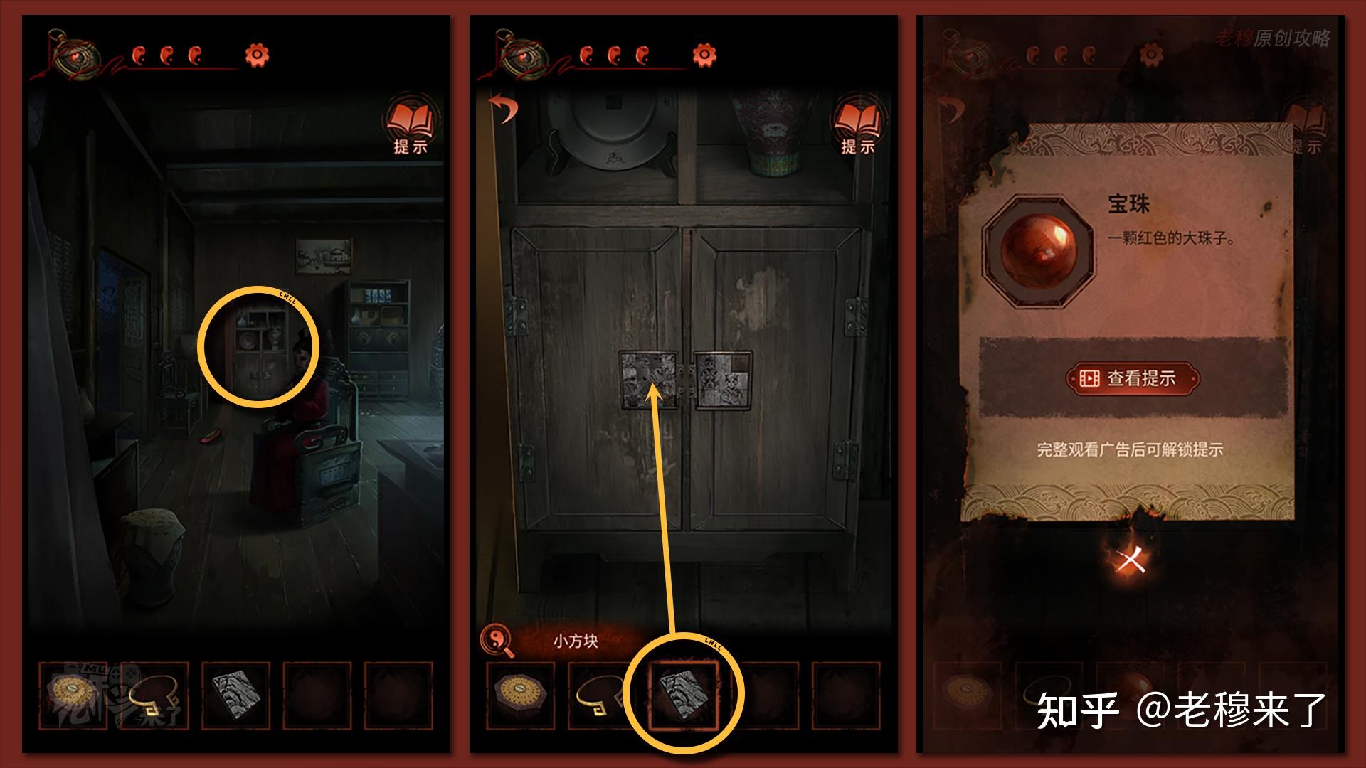 回到最后的房间,察看左侧的斗柜,将【小方块】安拆在左侧的机关上,完成拼图后能够得到【宝珠】