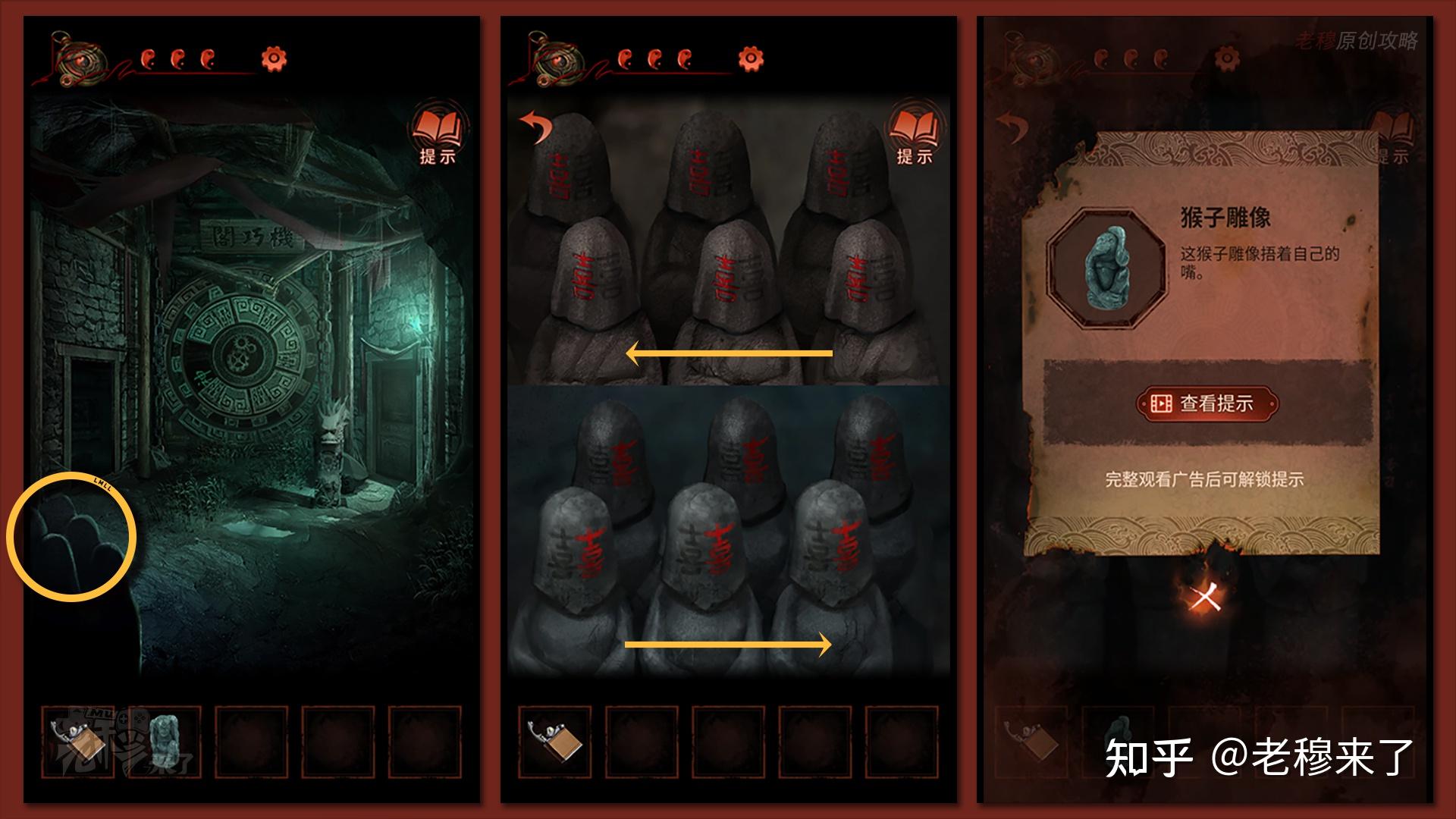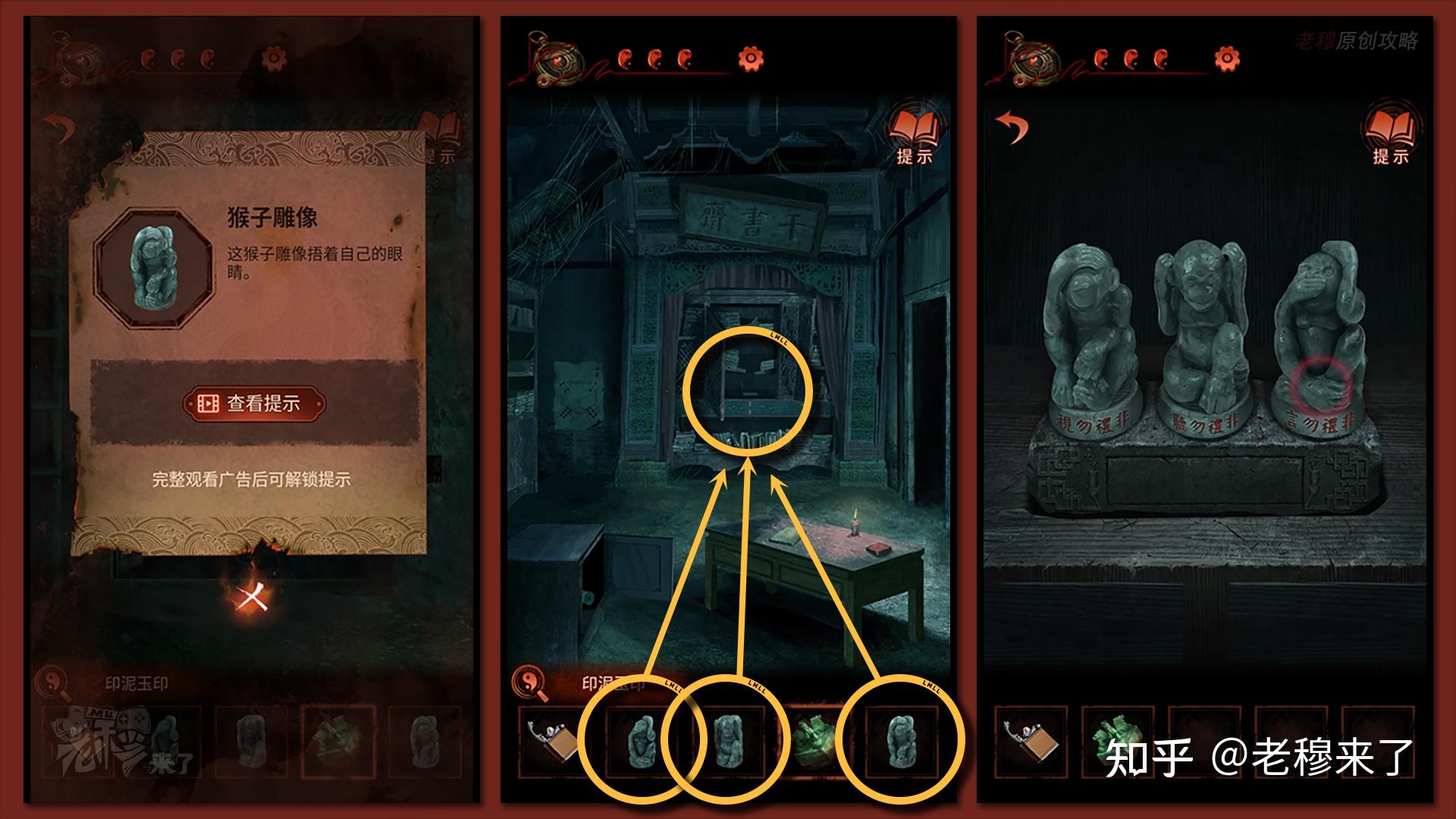 【女主视角】:来到【千书斋】,将三个【山公雕像】放置在机关台子上