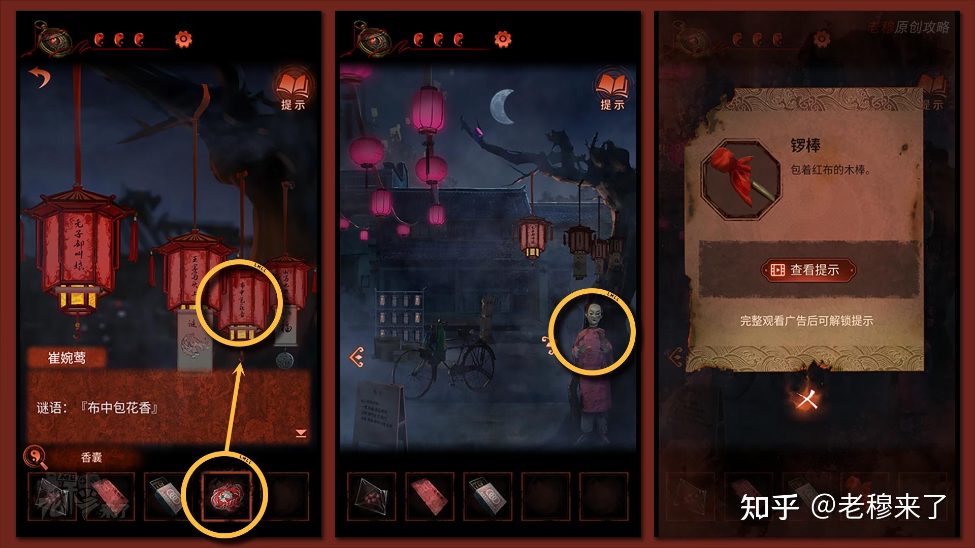 【二更】视角:来到第三盏灯笼位置,看到灯谜内容:布中包花香,谜底【香囊】,故将【香囊】悬挂在第三盏灯笼下方,退出视角,呈现纸人,得到【锣棒】