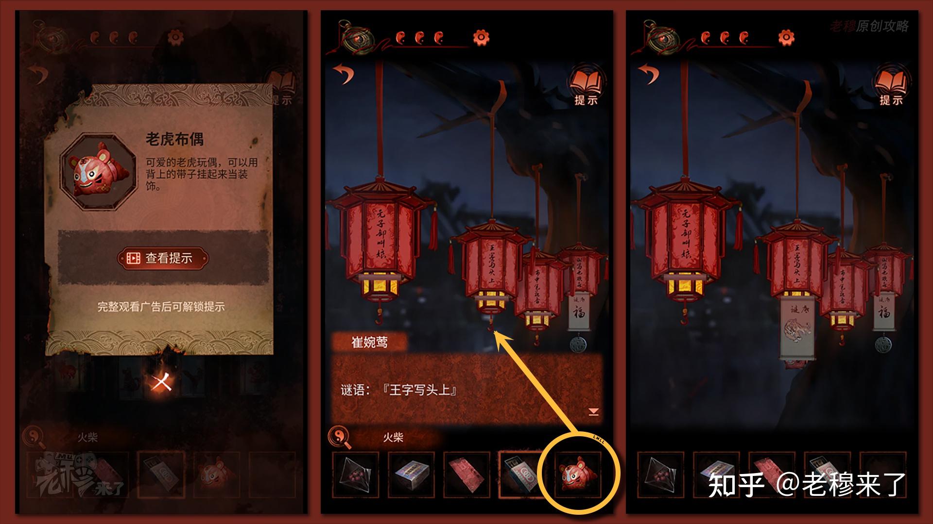 【二更】视角:第二盏灯笼的灯谜是:王字写头上,谜底是【山君】,故将【山君布偶】悬挂在第二盏灯笼下方