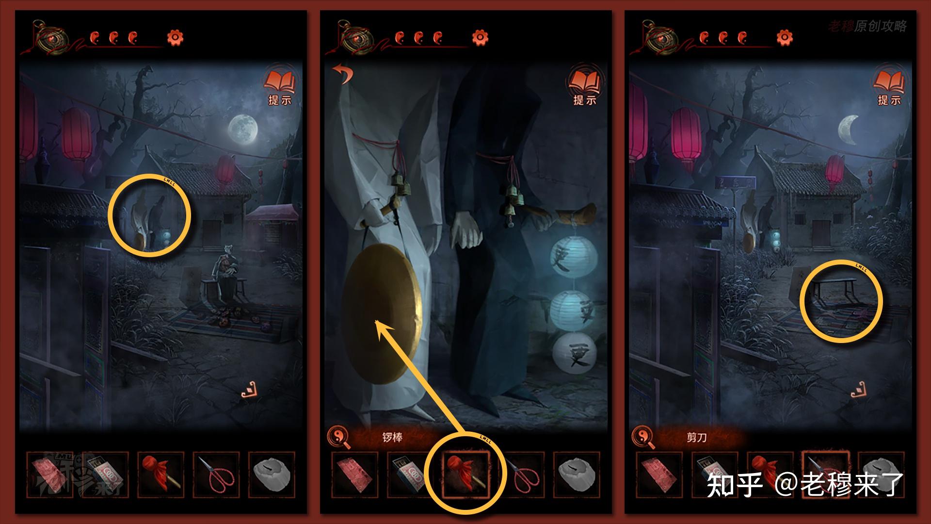 【二更】视角切换【三更】:点击黑白无常,依次敲打锣一下,梆子一下,锣一下,来到【三更视角】,察看最远处的【屋子】