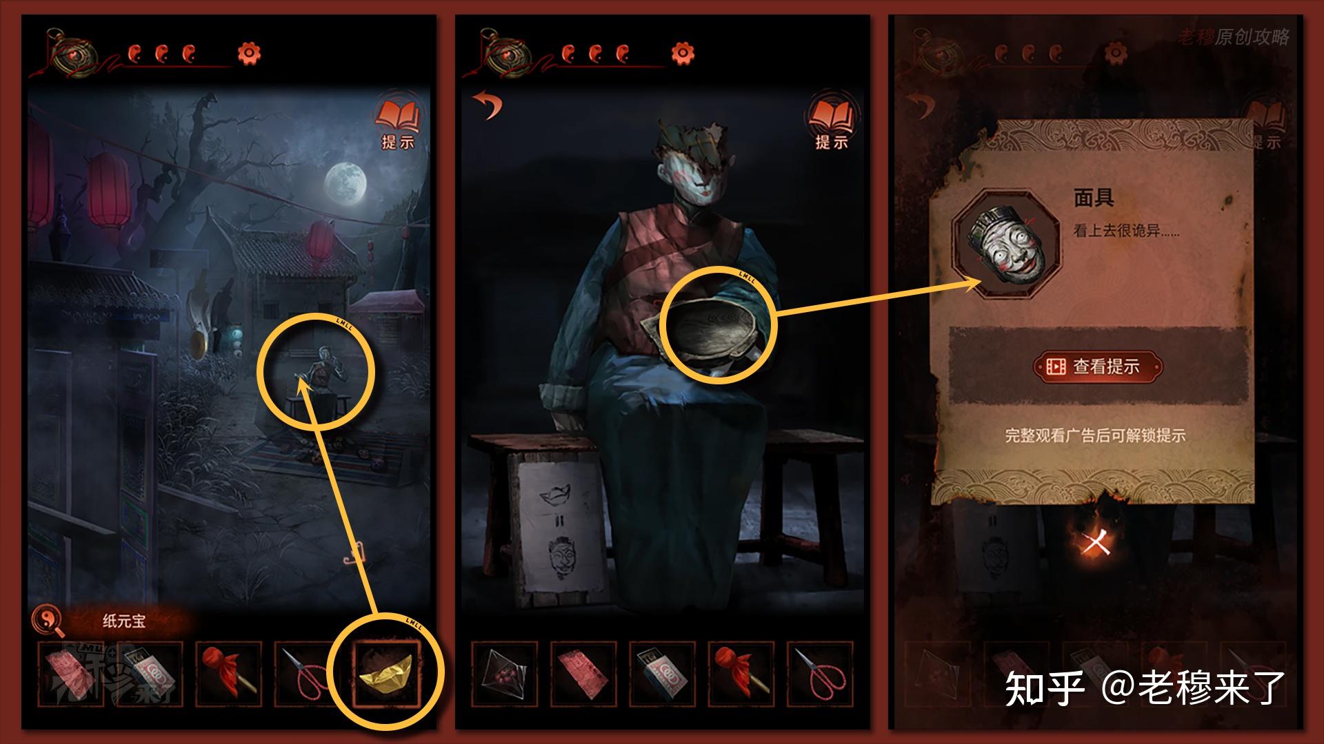 【一更】视角:将【纸元宝】给到左侧视角面具摊子的纸人手中,得到【面具】