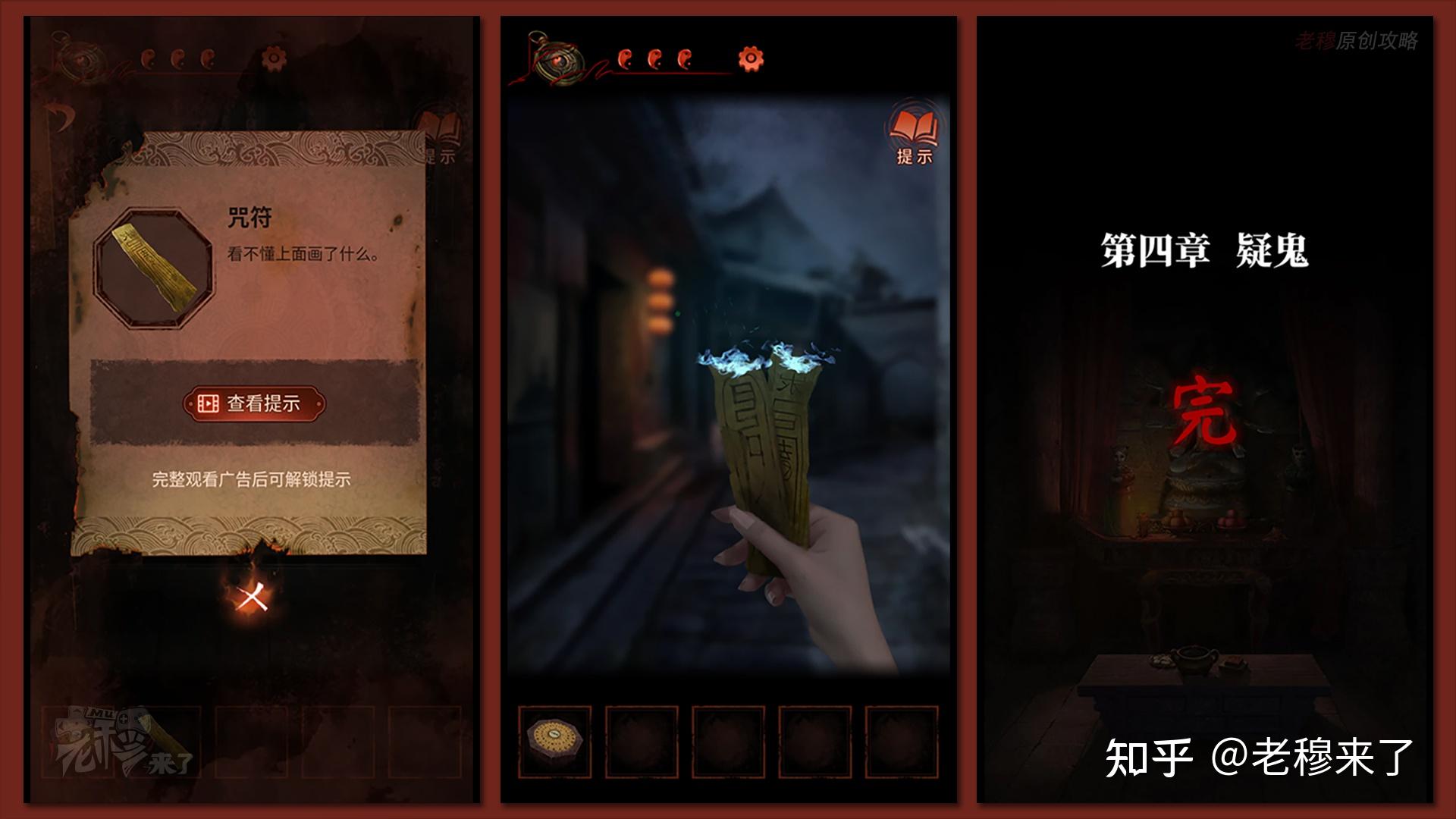 除了柜橱拾取的【符咒】,剧情会在男主处得到另一个【符咒】,走到【小路视角】,符咒回自燃,自此第四章完毕
