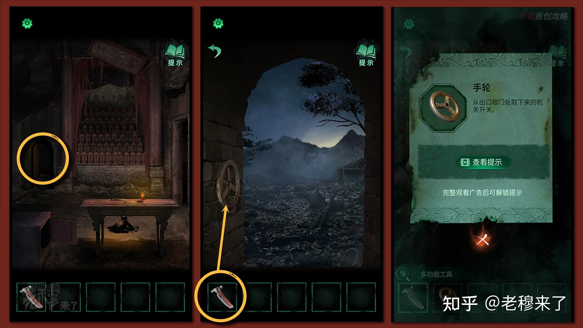 【男主视角】:左侧的石门翻开,用【多功用东西】去拧动机关锁,拾得【手轮】