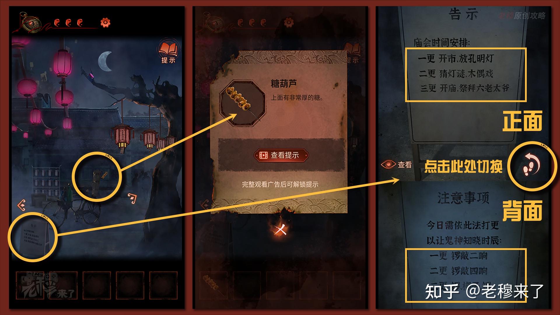 拾取自行车后座的【糖葫芦】,点击【通告牌】,正面告知庙会时间摆设,点击【脚印】,能够看到后面的【留意事项】,那个是此章节很有意思的剧情摆设,通过敲打黑白无常手中的锣和梆子,来停止时间的瓜代,后面我们会在【一更】【二更】【三更】之间瓜代互动