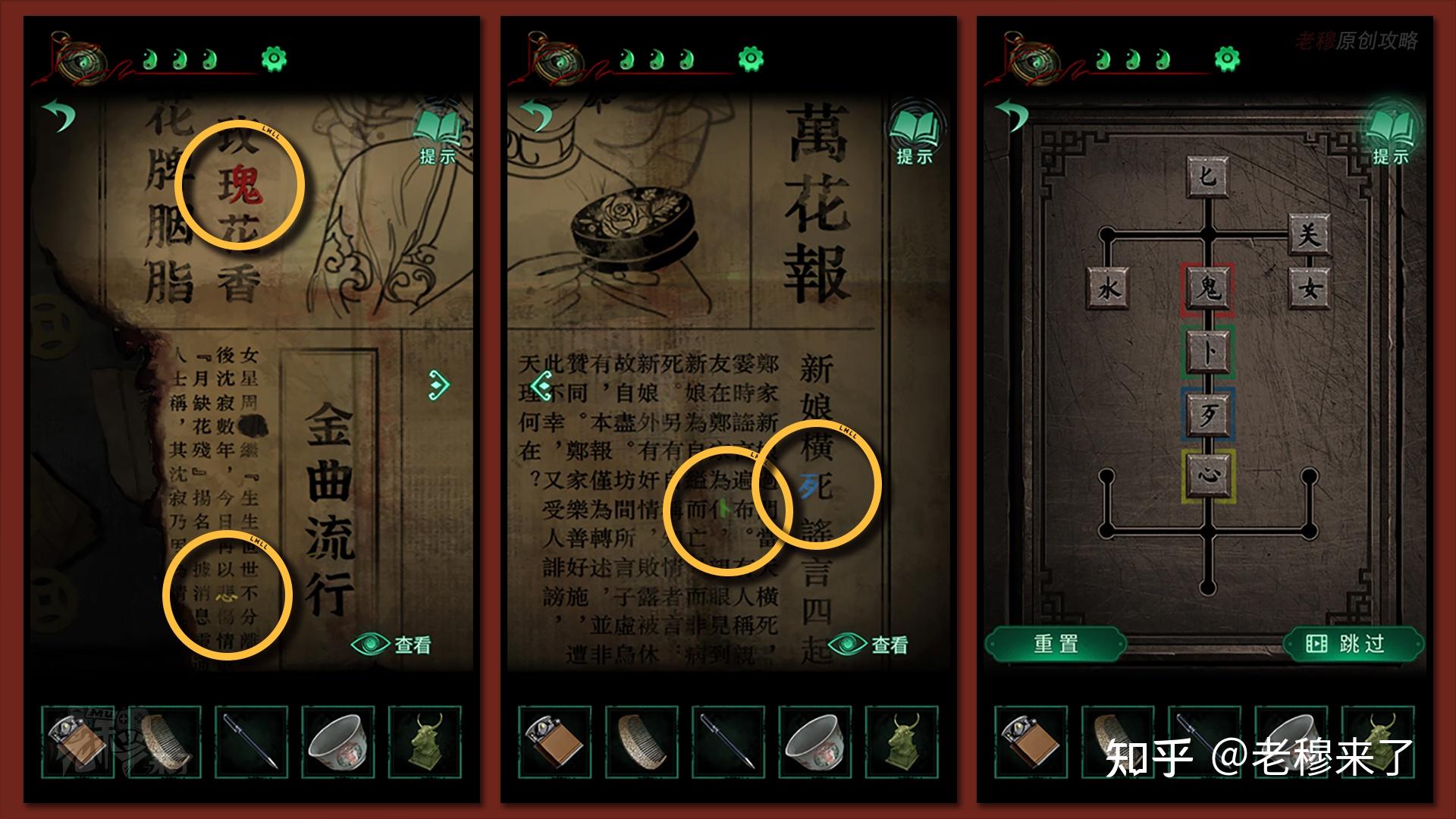 报纸凸起的显示了四个字符,红色的【鬼】,黄色的【心】,绿色的【卜】和蓝色的【歹】,按照那个线索能够解锁【八卦匣子】右侧的锁扣(很简单)