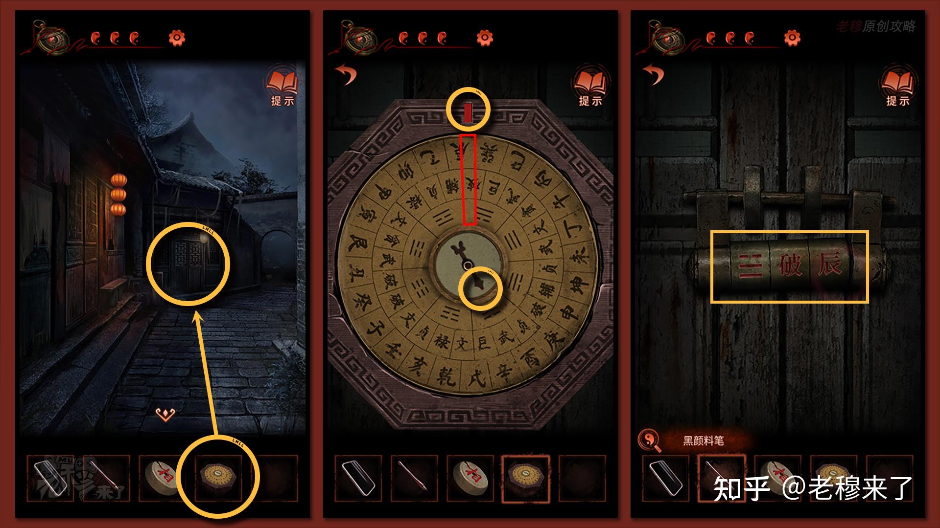 来到【小路视角】的远处小门处,走近翻开【罗盘】,罗盘指针发作了变革,扭转罗盘让指针正对【小红点】,上方红色标示正对的三环字符所对应的字符便是翻开门的密码:【兑(八卦图形打不出来)、破、辰】