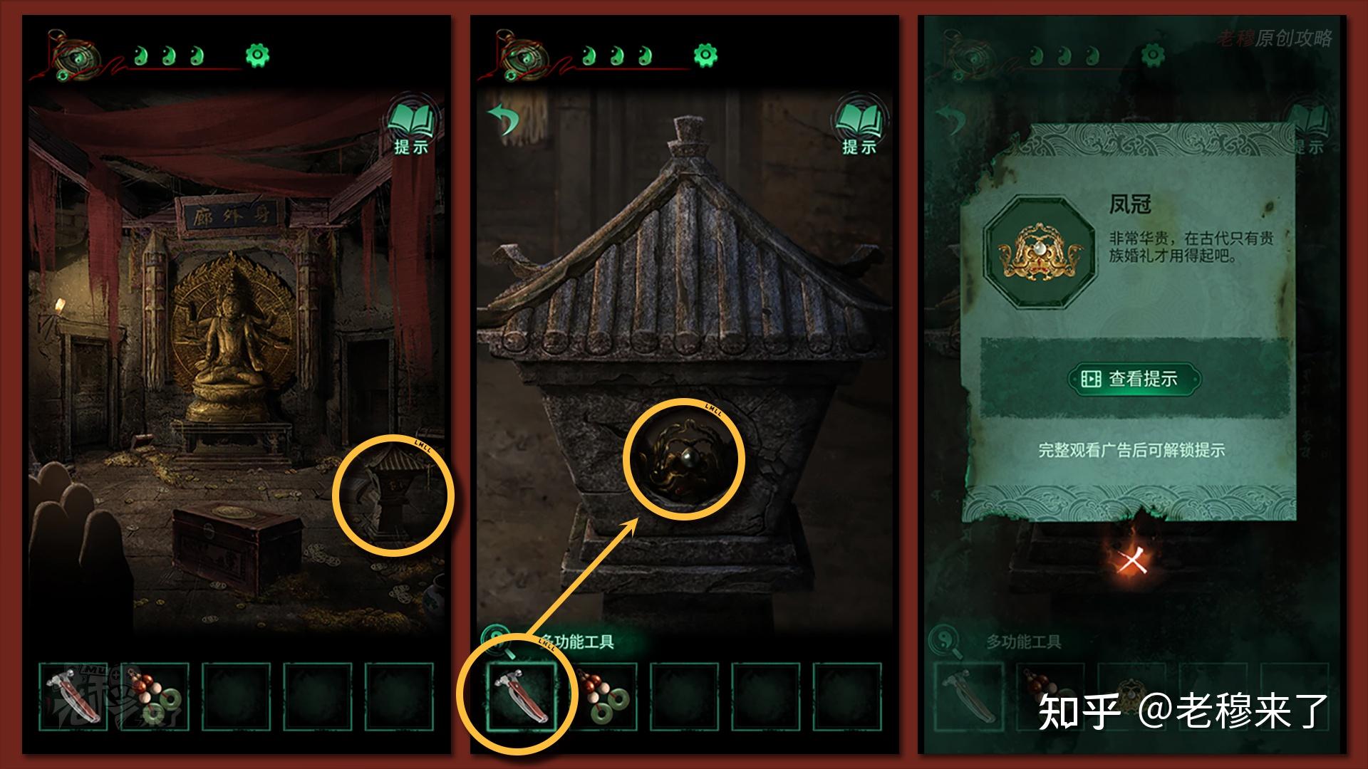 【男主视角】:切换到男主视角,男主进入右边的房间【身外廊】,察看右侧的石灯,用【多功用东西】砸开石头,拾取【凤冠】