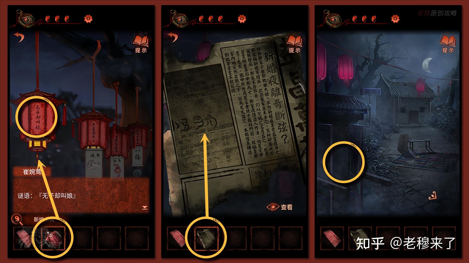 【二更】视角:来到灯谜灯笼位置,察看第一盏灯笼的灯谜:无子却叫娘,谜底【新娘】,将【新娘木偶】挂在第一盏灯笼下方,得到【民国报纸一角】,能够看到之前婚礼邀请函后背缺失的字串线索,回到轿子位置