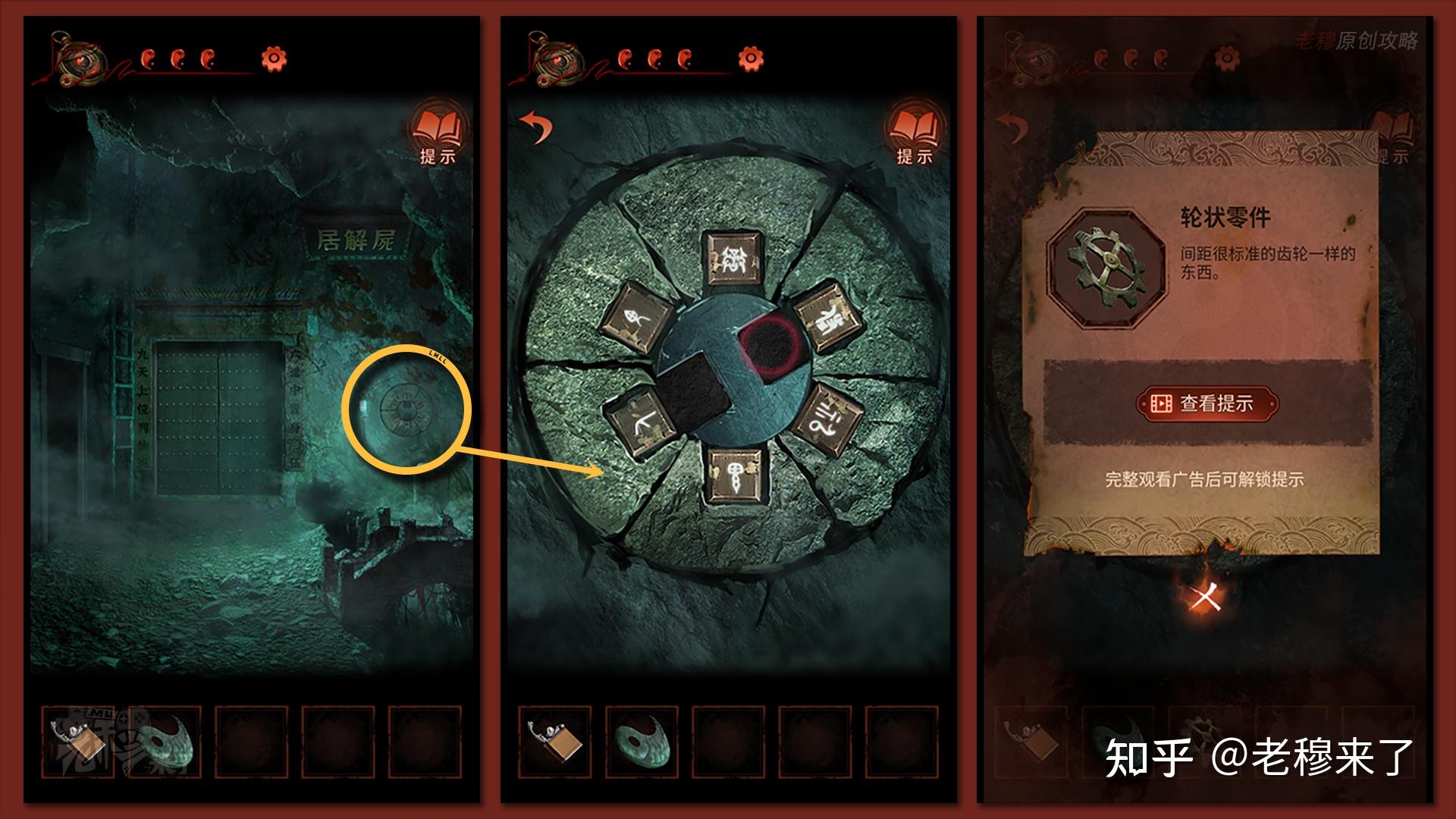 【女主视角】:察看墙壁上的圆形机关,按照石碑上所写:六道轮回,各归其所,字明可通,字熄非道,所以要将字符根据如图所示挨次停止调整,带都亮后获得【轮状零件】
