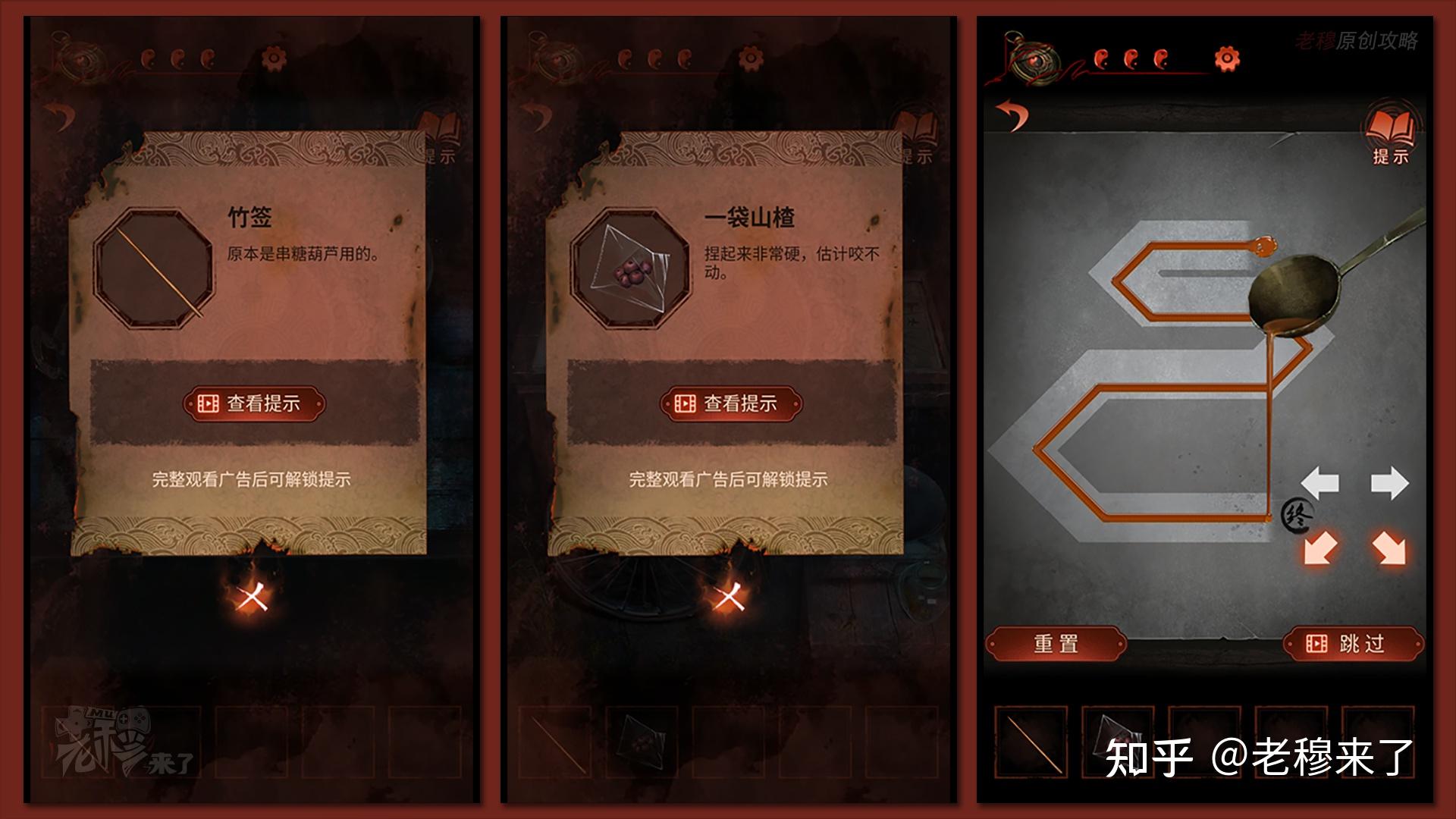 【二更】视角:得到【竹签】,退出视角,主动获得【塑料袋】和【一袋山楂】,点击面板,停止小游戏(很简单)