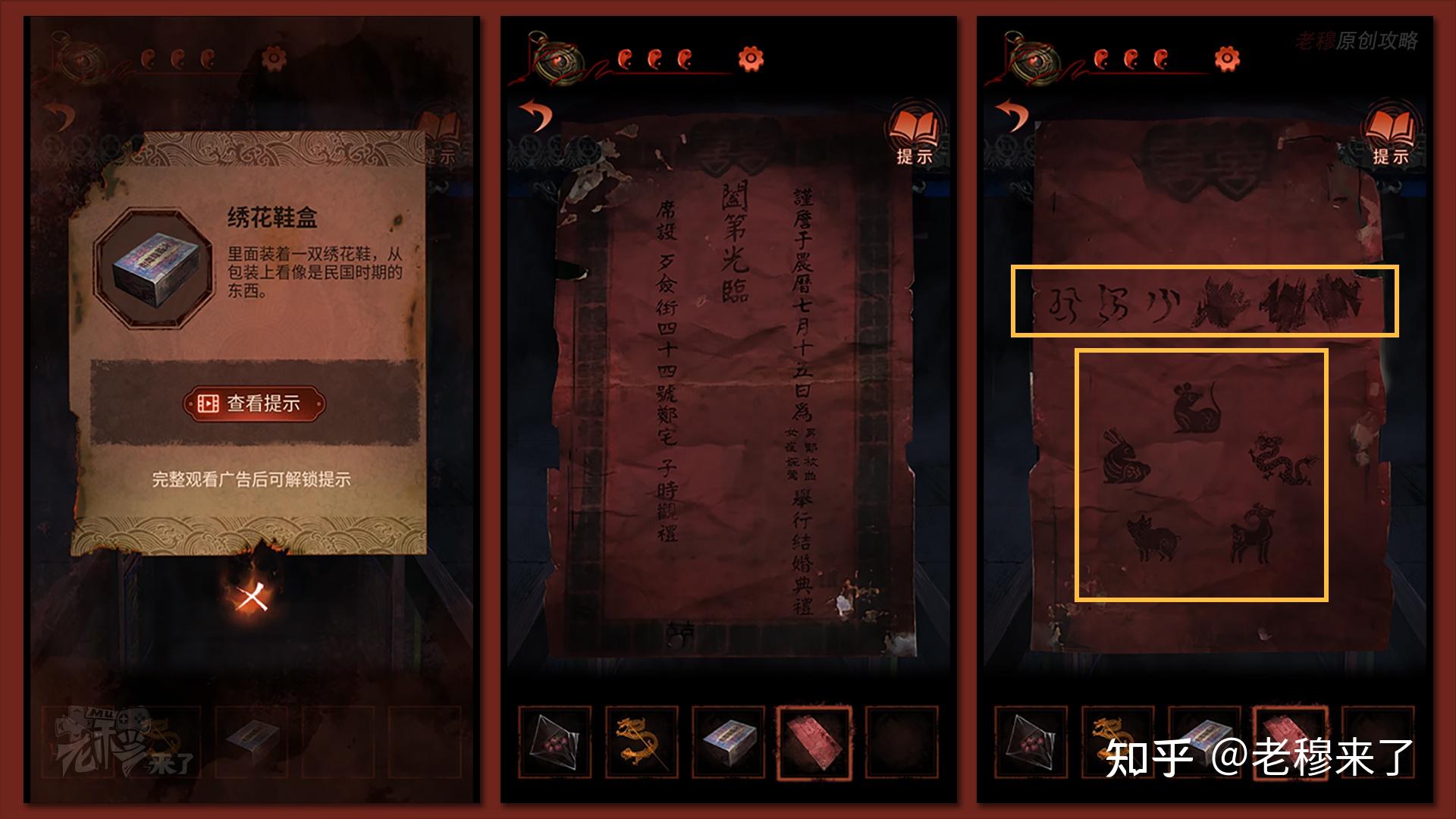 【二更】视角:从座椅上拾取【绣花鞋盒】和【婚礼邀请函】,察看【邀请函】后背,能够看到密码字串和动物图形线索