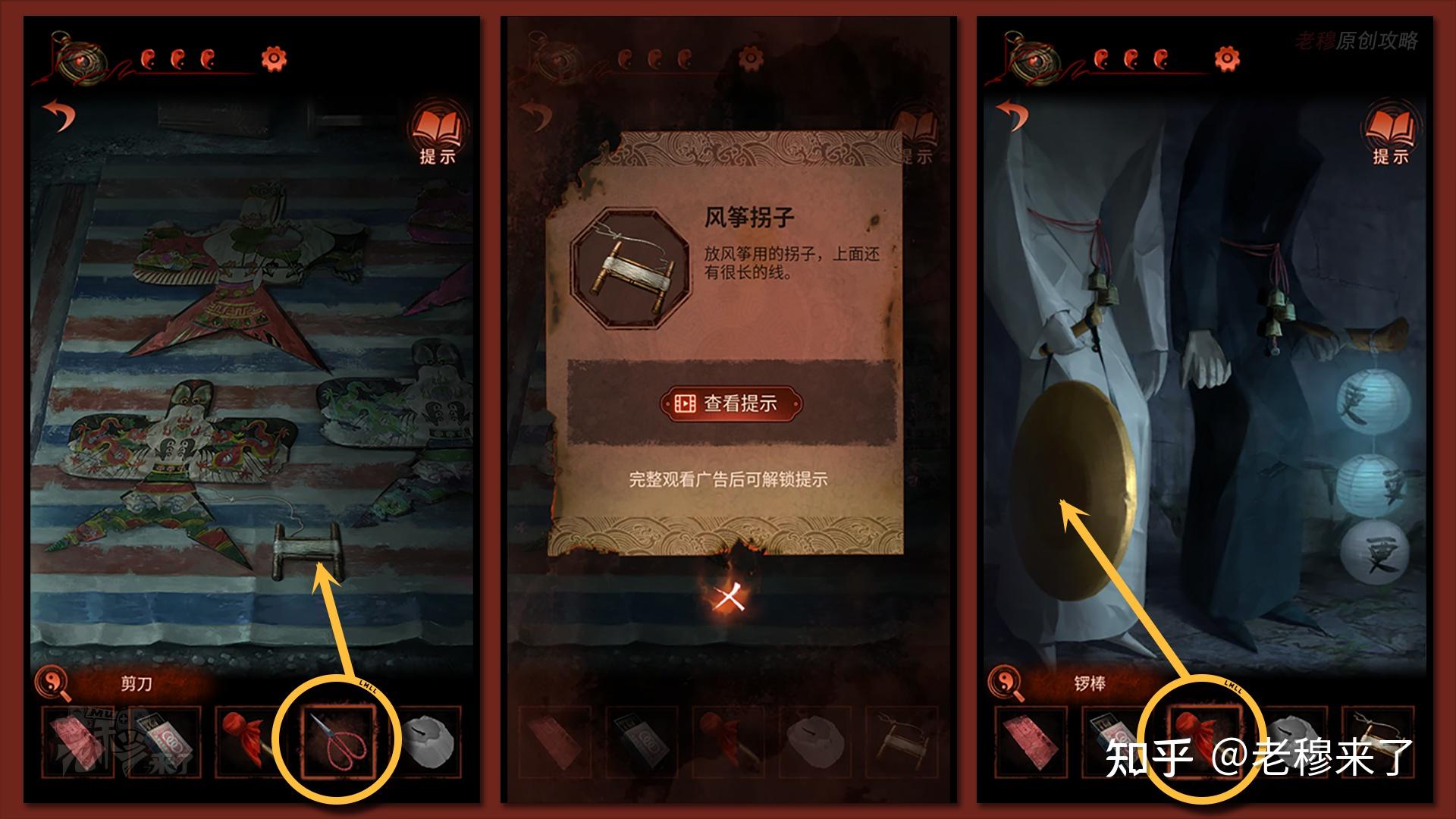 【二更】视角切换【一更】:用【剪刀】剪断风筝线,得到【风筝拐子】,在去黑白无常位置敲锣【两下】,到【一更】视角