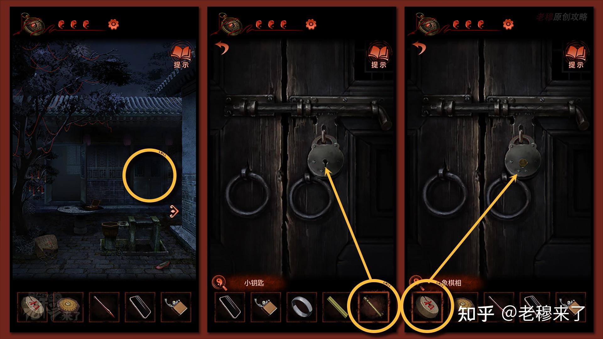 来到院内锁着的大门,用【小钥匙】和【相】象棋翻开此门