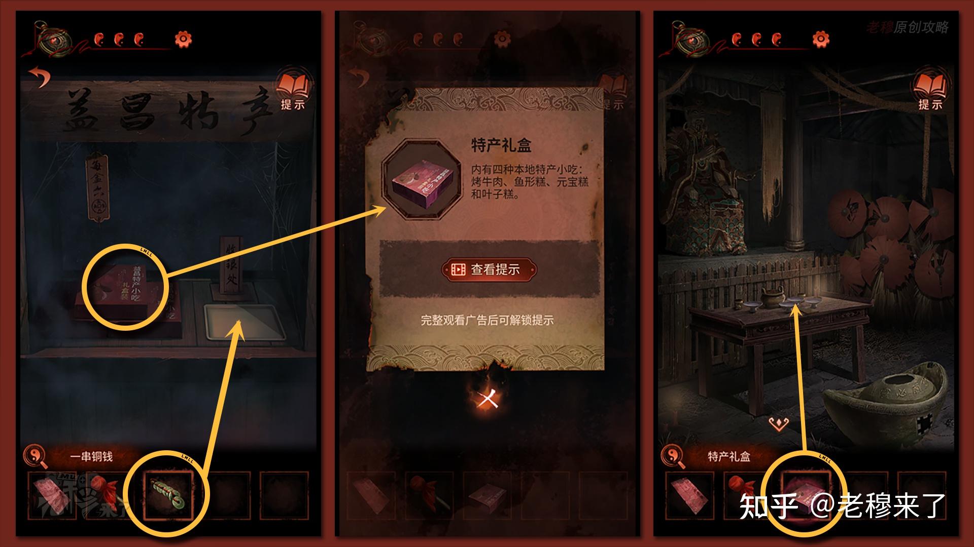 【三更】视角:将【一串铜钱】放置在右侧空盘位置,拾取【特产礼盒】,再回到屋子位置